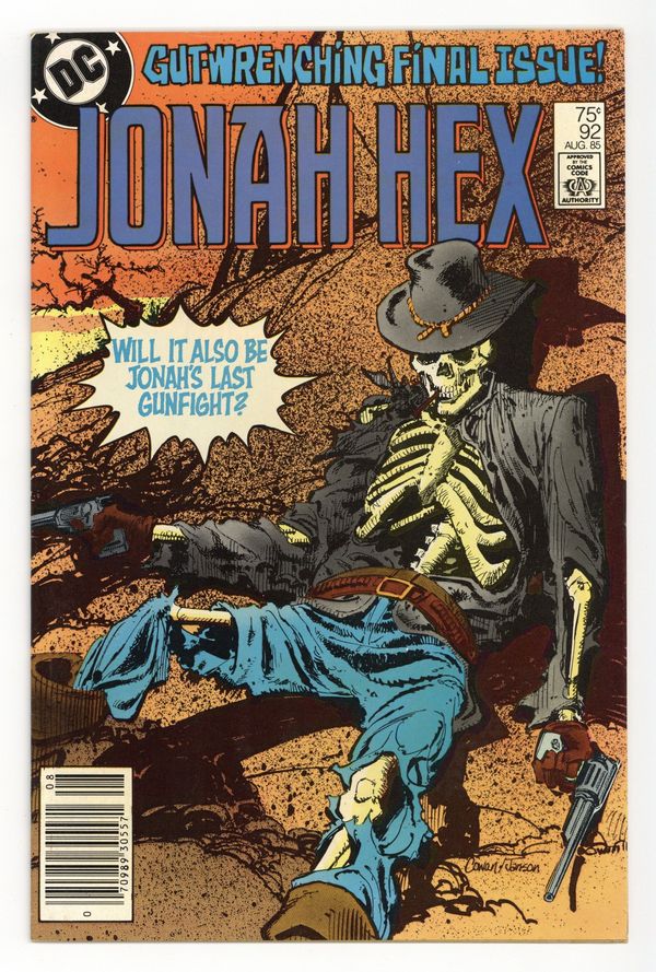 Newsstand Edition. In this last issue of Jonah Hex, Jonah goes out in "A Blaze of Glory!" Hex faces off with villains in the West when he suddenly disappears from the late 1880's and reappears in the 21st century sometime after a nuclear war. Continues in Hex (1985) #1. Written by Michael Fleisher, with art by Gray Morrow. Cover by Denys Cowan and Klaus Janson. Cover price $0.75.
