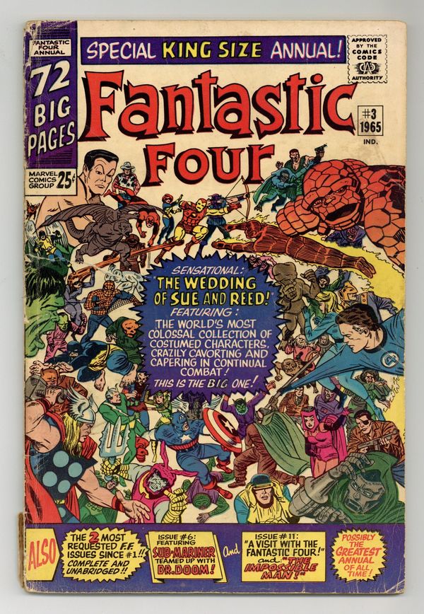 Reed and Sue get married in a new story, "Bedlam at the Baxter Building!" Script by Stan Lee, pencils by Jack Kirby, inks by Vince Colletta. Just about everyone in the Marvel Universe, both heroes and villains, appears in this story. Steve Ditko provided the art on Spider-Man in panel 4 of page 14. This issue also reprints "Captives of the Deadly Duo" (from FF 6), "A Visit with the Fantastic Four" (FF 11), and "The Impossible Man" (FF 11). Kirby/Chic Stone cover. 76 pgs. Cover price $0.25.