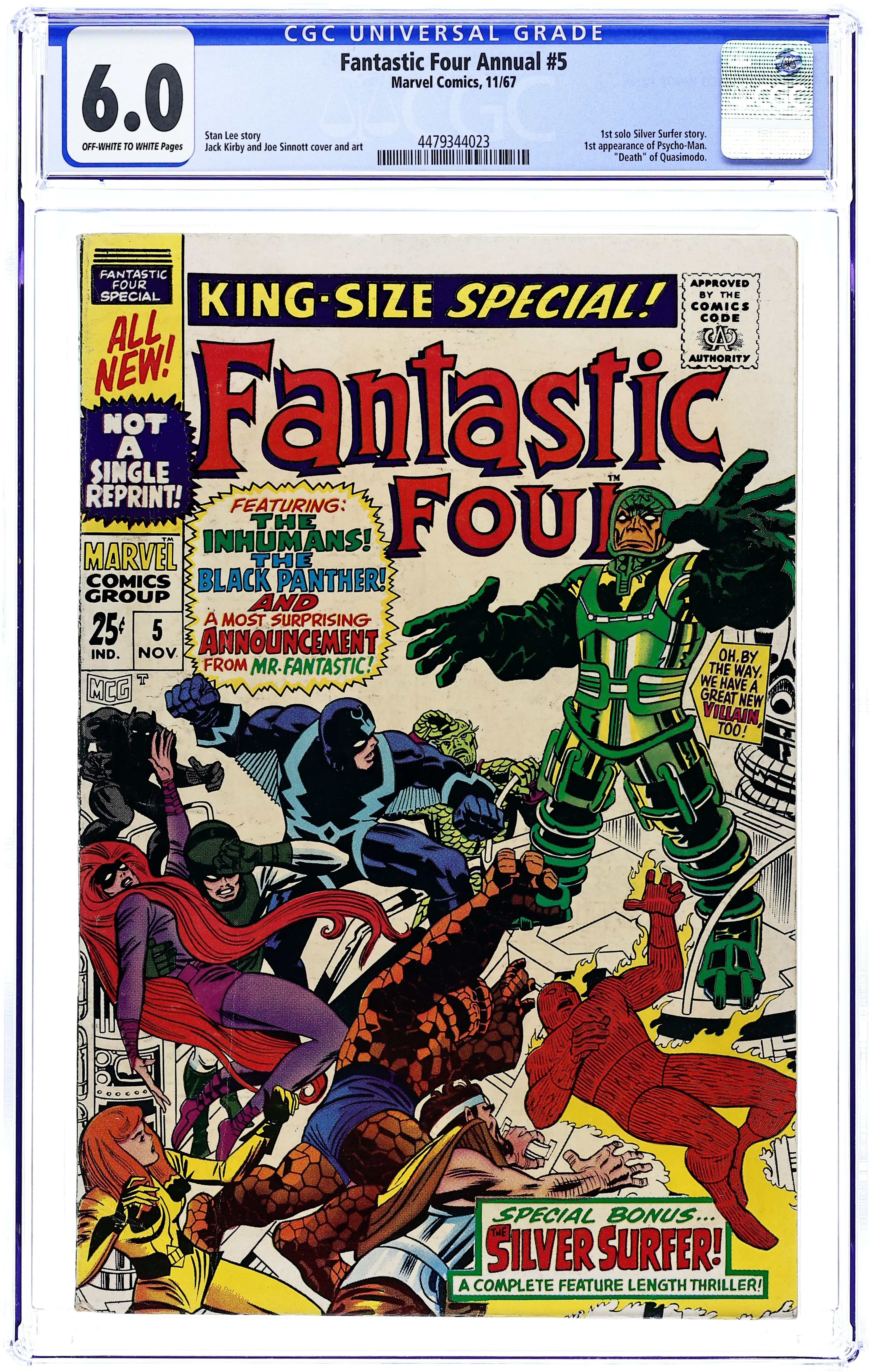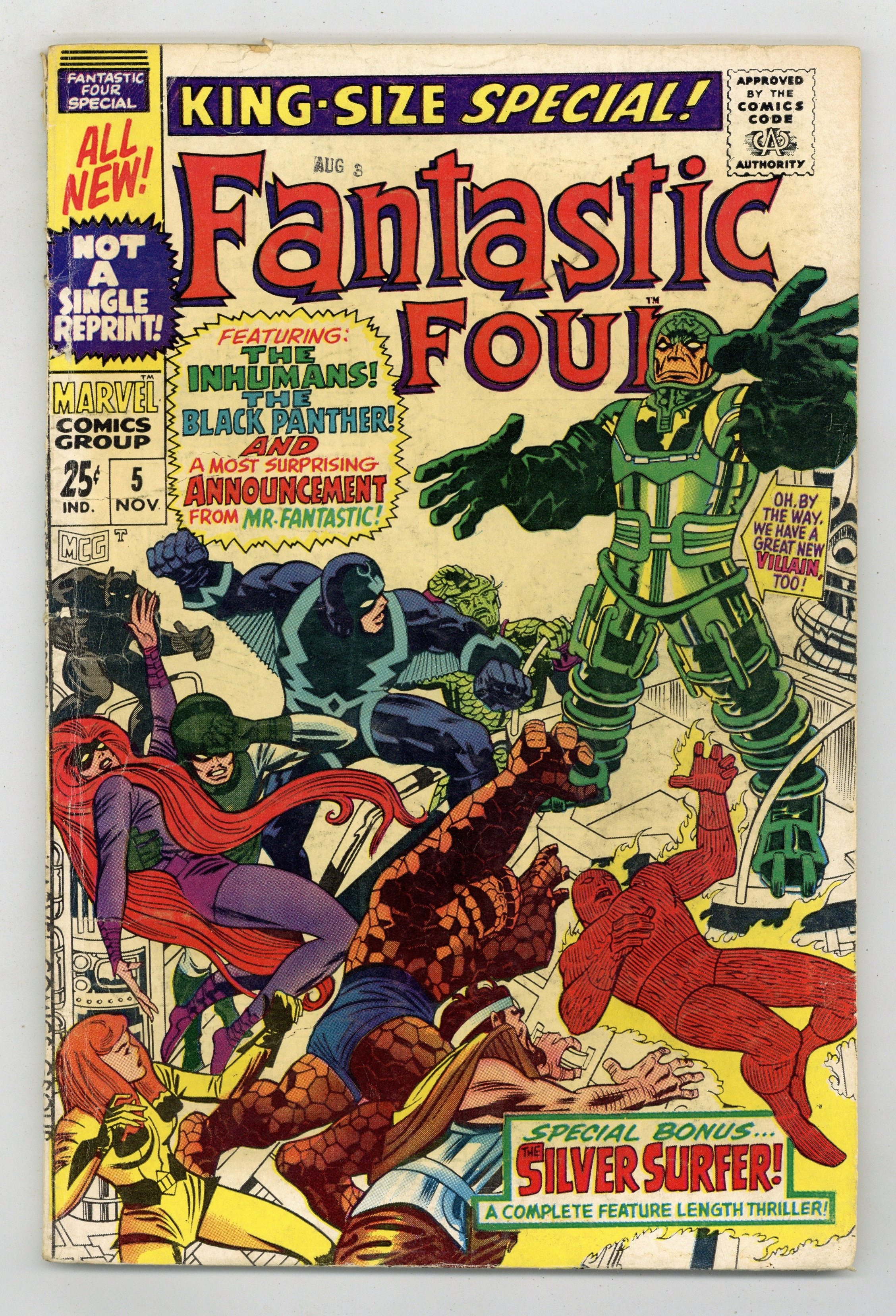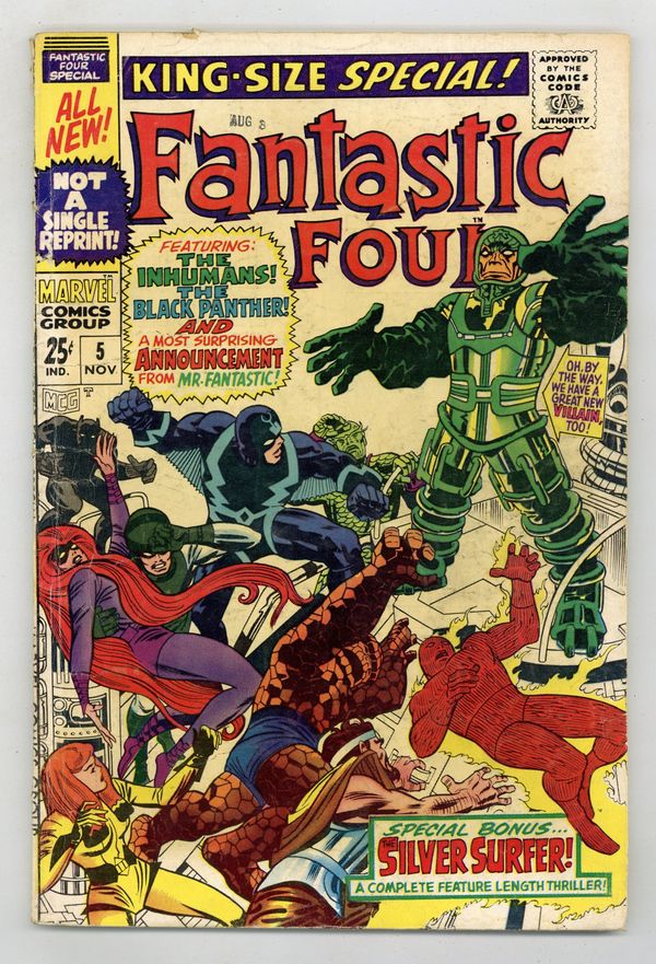 The Black Panther and the Inhumans help the FF battle Psycho-Man (his first appearaince) in "Divide and Conquer!" Script by Stan Lee, pencils by Jack Kirby, inks by Frank Giacoia (not Joe Sinnott as credited). Silver Surfer back-up (first solo story), "The Peerless Power of the Silver Surfer!" by Lee/Kirby/Giacoia. This issue also has eight pages of pin-ups by Kirby/Giacoia and a short story, "This Is a Plot?" Script and pencils by Kirby, inks by Giacoia. Kirby/Giacoia cover. 68 pages, full color. Cover price $0.25.