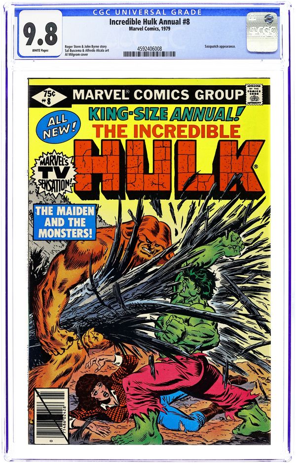 Direct Edition. Cover by Al Milgrom. "Sasquatch." Story by Roger Stern and John Byrne. Pencils by Sal Buscema. Inks by Alfredo Alcala. When the Hulk crashes in the woods of Northeast British Columbia, the Canadian government sends Sasquatch to capture him. Coming upon him as Bruce Banner, Sasquatch is intent on testing his power against the Hulk. So, he goads Banner into becoming the Green Goliath. Will his plan backfire, and will the young woman who was helping Banner survive the battle between the two behemoths? 52 pages. Full color. Cover price $0.75.