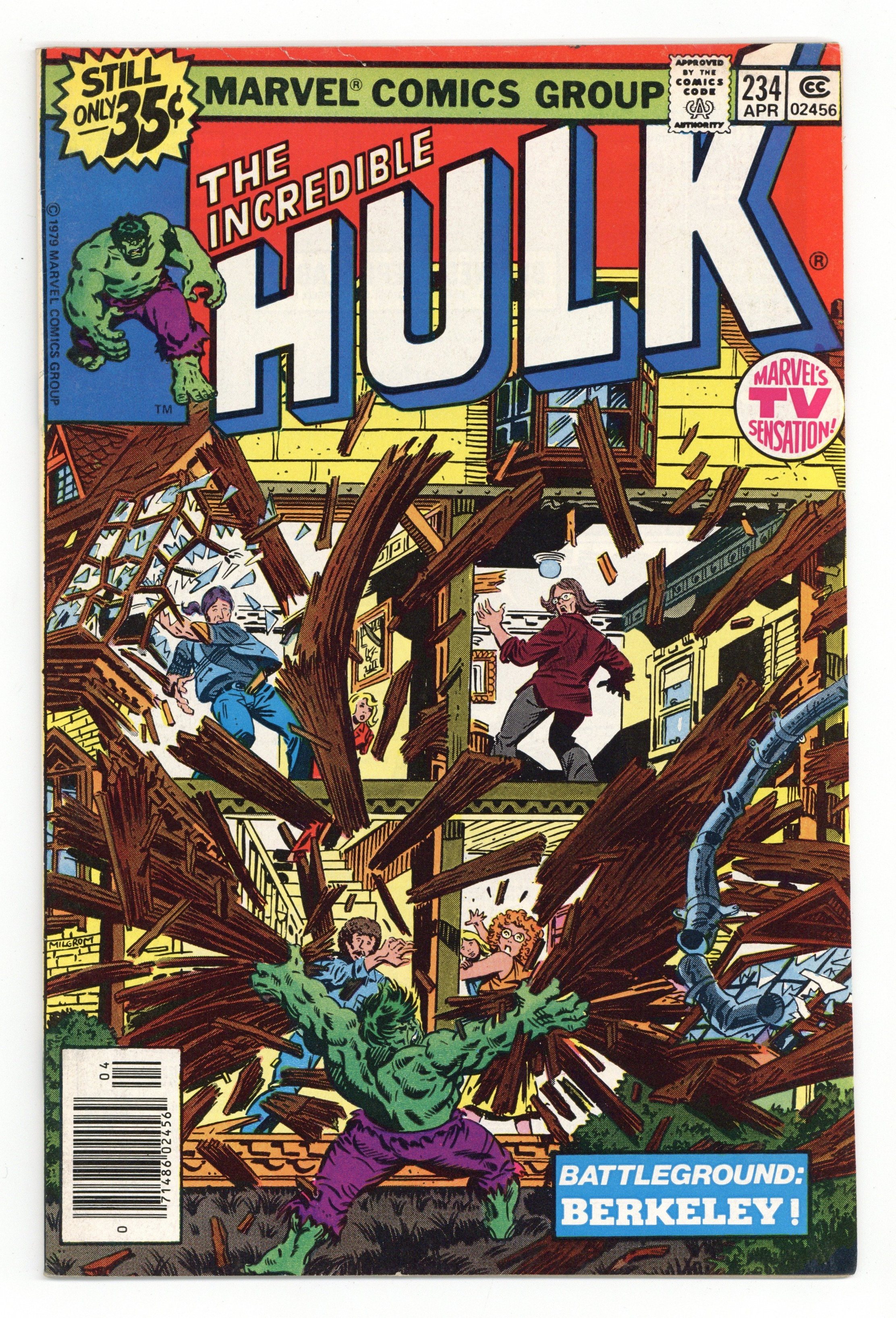 Tags: Marvel Legacy Numbering: Hulk (part 234), Hulk$18.25"Battlefield Berkeley!" Part 1 of 4. Quasar and Doc Samson cameo. Story by Roger Stern. Art by Sal Buscema and Jack Abel. Learn the intricate past of Trish Starr, the Hulk's erstwhile friend, and find out how the Hulk, Hank Pym, Doctor Strange and the Defenders' Nighthawk all fit into it. Plus, what happens when Machine Man shows up and kidnaps Trish? Quasar's story continues in Marvel Two in One (1974) #73. 36 pages. Cover price $0.35.