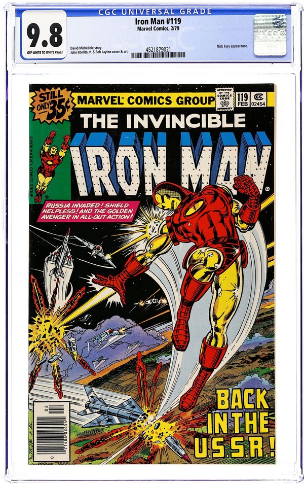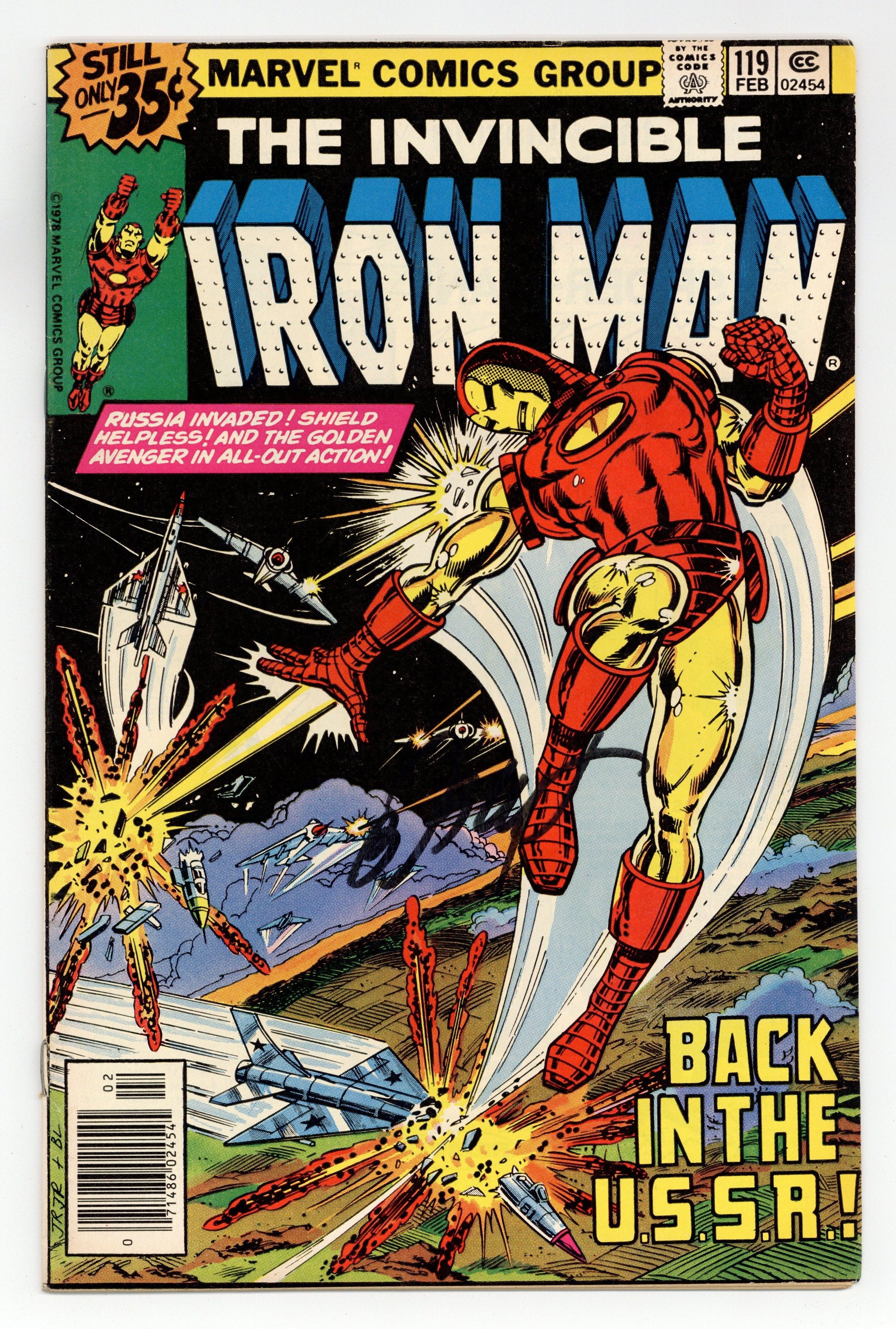 "No S.H.I.E.L.D. to Protect Me!" Part 2 of 2. Guest-starring Nick Fury. Plot by David Michelinie and Bob Layton. Script by David Michelinie. Art by John Romita Jr. (breakdowns) and Bob Layton (finishes). Cover by John Romita Jr. and Bob Layton. The SHIELD Helicarrier has drifted into Soviet airspace! And Russian MiGs are on the way to shoot it down! Everyone onboard the Helicarrier is unconscious except for the Invincible Iron Man! So in dazzling fashion, the golden avenger zooms into action and knocks out 4 fighter jets and 2 ballistic missiles! Awesome! Shell-Head saves the day for SHIELD! But a few hours later, why does Tony regret having done so? Flashback cameo by the Spymaster. 32 pages. Cover price $0.35.
