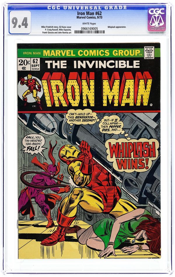 "Whiplash Returns!" Story by Mike Friedrich. Art by Craig Russell, Mike Esposito, and Frank Giacoia. Tony Stark's business trip with Pepper Hogan continues in Cincinnati. Tony is touring the Queen City plant when Whiplash interrupts! Whiplash quickly disables Shell-head's repulsor rays, so Iron Man must find another way to win. 32 pages Cover price $0.20.