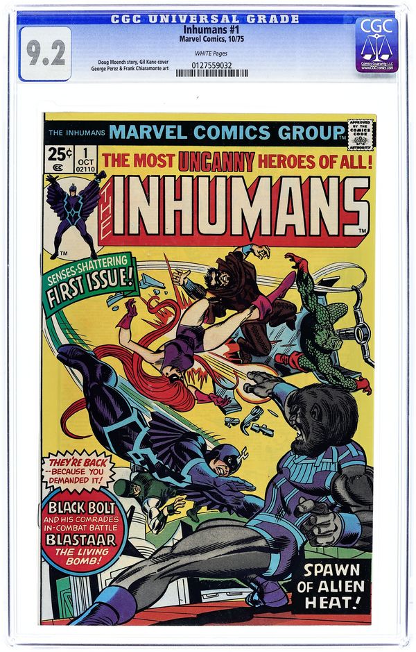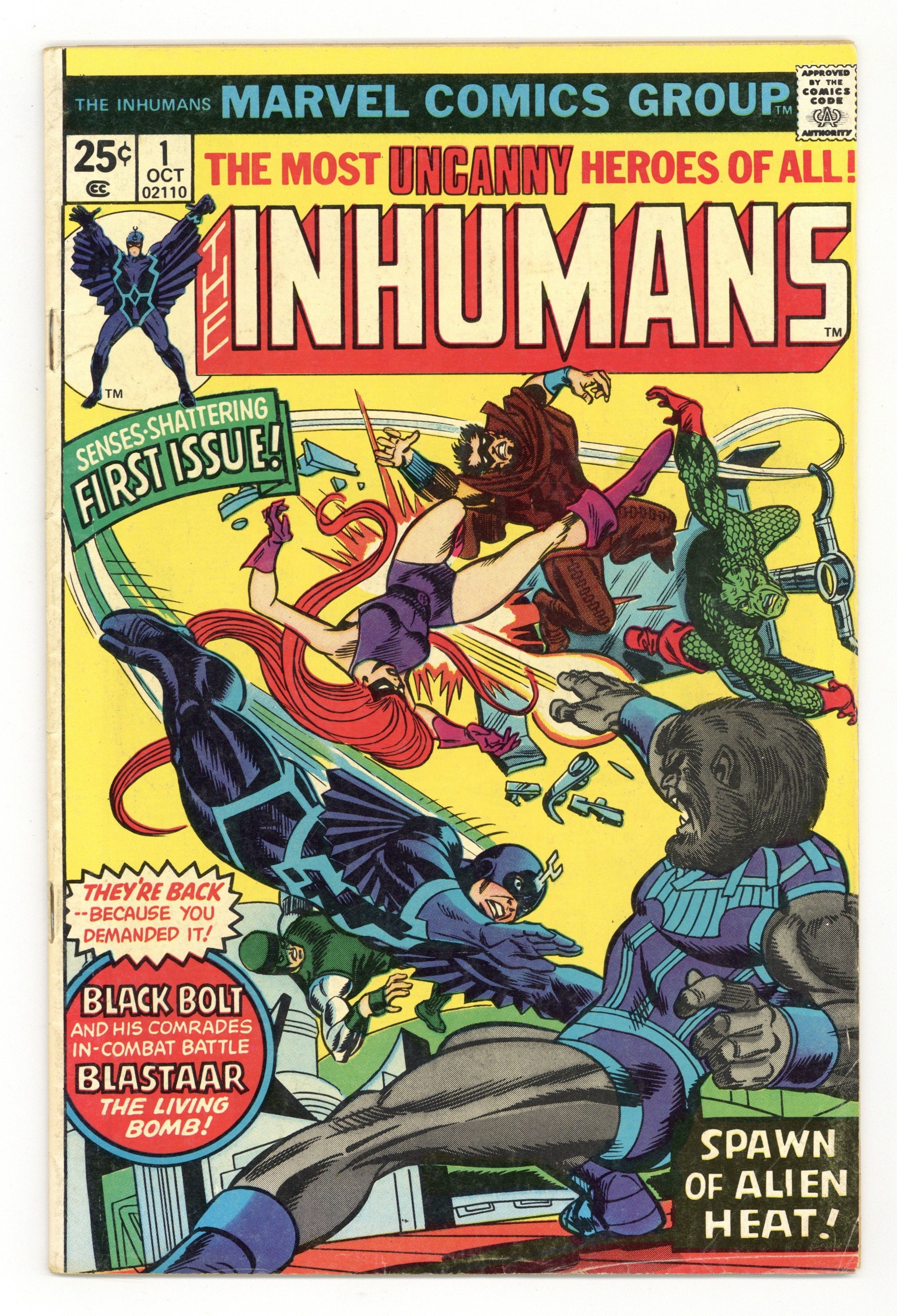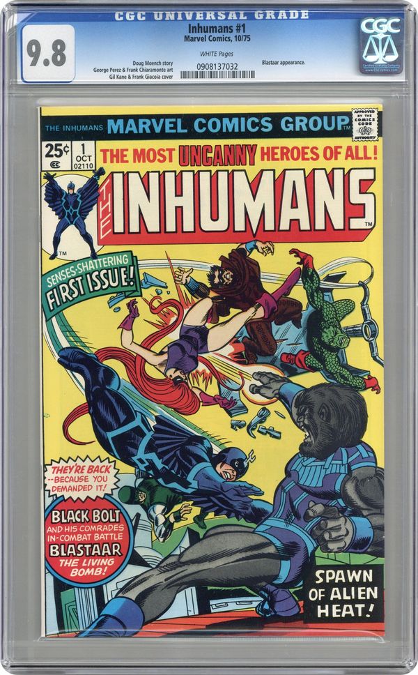Ends Dec 8 8:37 PM CST Bid History 5 bids Current Bid $45 Your Secret Max Bid If you'd like to bid, please log in or register. They're back -- because you demanded it! Black Bolt and his comrades in-combat battle Blastaar the Living Bomb! Featuring: 19 page Inhumans story "Spawn of Alien Heat." Characters: Inhumans [Black Bolt; Medusa; Karnak; Gorgon; Triton]; Villain: Blastaar; Maximus; Intro: Iridia; Guest: Stallior; Centarius; Leonus; Avius; Hulk (flashback); Human Torch [Johnny Storm] (flashback). Written by Doug Moench, with art by George Perez and Frank Chiaramonte. Cover by Gil Kane and Frank Giacoia. Cover price $0.25.