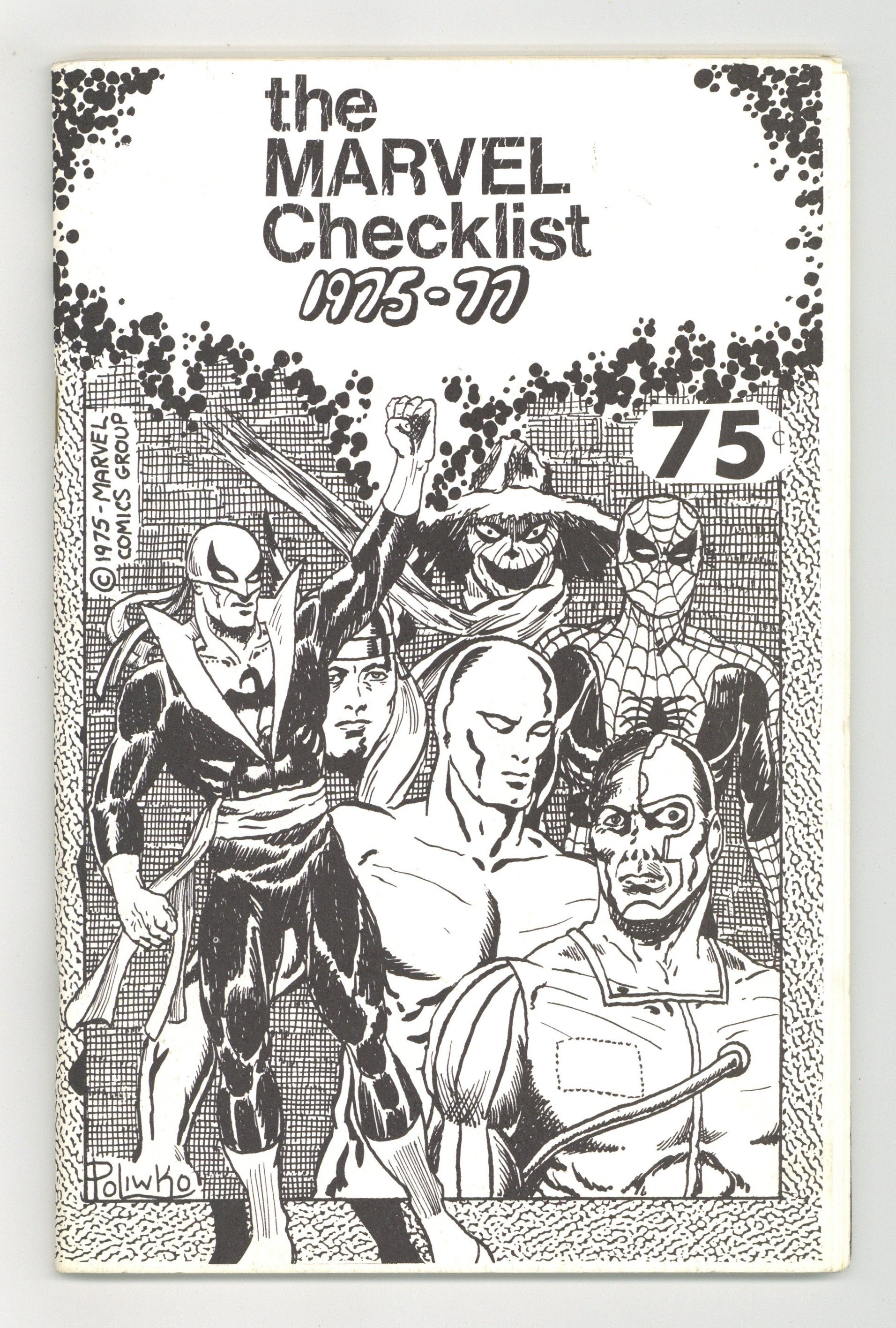 Checklist of Marvel Comics released between 1975-1977. Features art by Nik Poliwko. 5-1/2" x 8-1/2", 52 pages, B&W. Cover price $0.75.