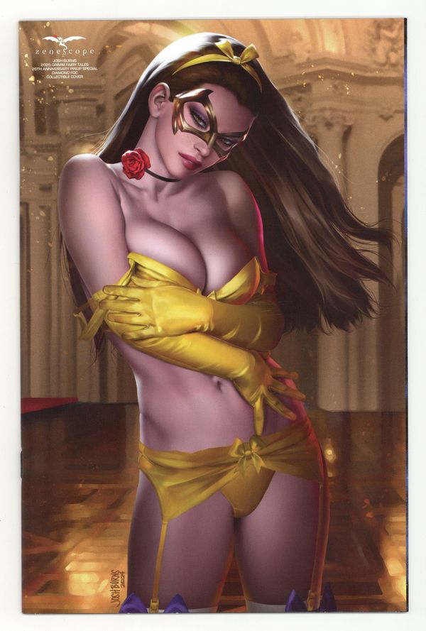 Published Mar 2025 by Zenescope Entertainment.$30.00Limited 1 for 20 Retailer Incentive Variant Cover. Written by Joe Brusha, Dave Franchini. Cover by Josh Burns. Zenescope Entertainment turns 20 years old this year! And to celebrate this milestone anniversary it's releasing a Fairy Tale Pinup Special to honor the last two decades! Showcasing many of the heroines and villainesses of the Grimm Universe, be sure not to miss this stunning collection of characters all donning sexy costumes of the well known fairy tales they are based upon. Filled with marvelous pieces of artwork by some of the industry's top artists contributing gorgeous pin-ups, it also includes a never before published short story! 40 pages, full color. Rated T Cover price $10.00.