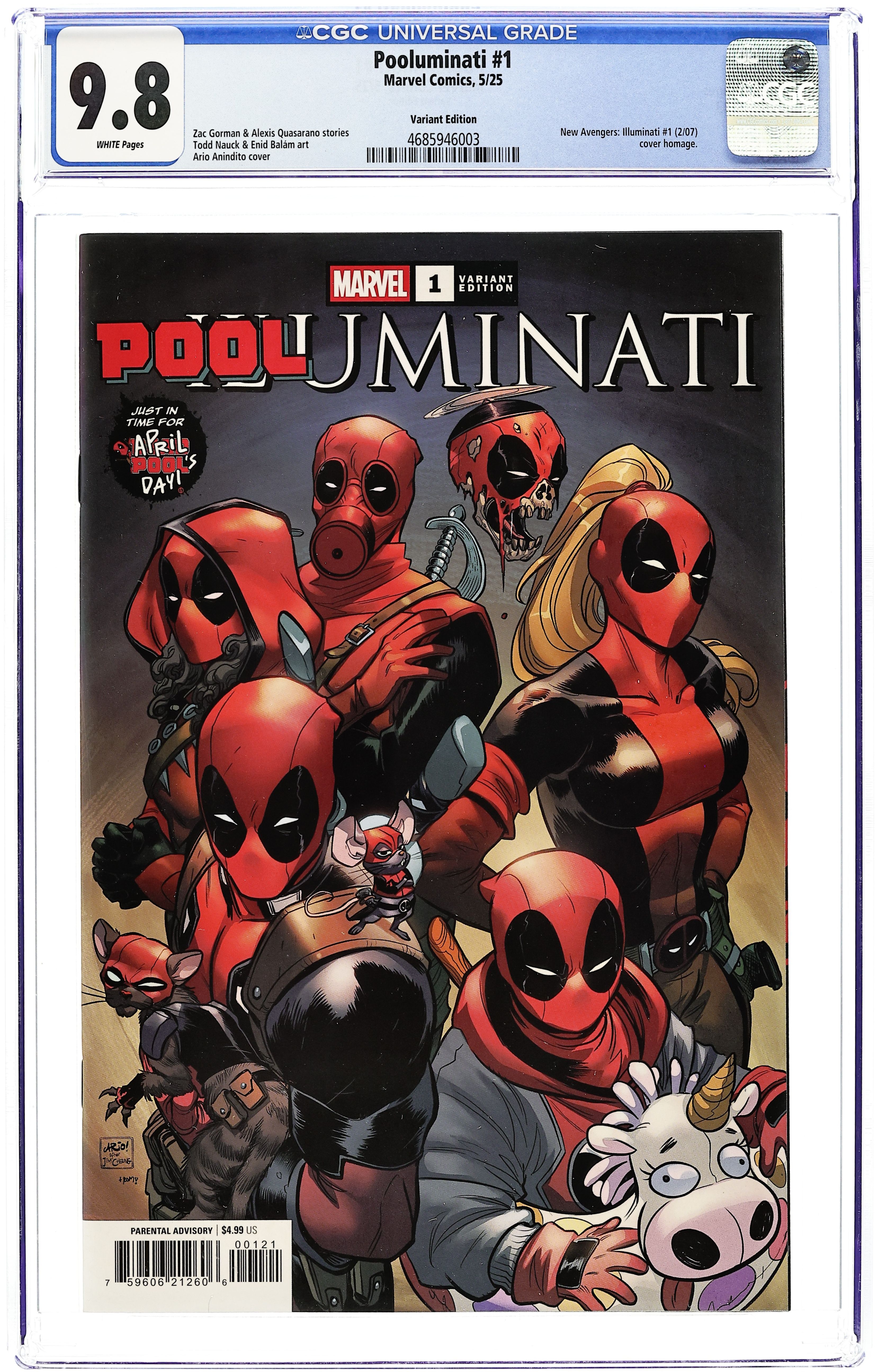 Written by Zac Gorman; Alexis Quasarano. Art by Todd Nauck; Enid Balam. Cover by Ario Anindito. THE ELITE 'POOLS ASSEMBLE! There are those who hold power, and those who hold the secret power in the world. Those who shape the world around us, who pull the strings, unseen. They are…the POOLUMINATI. Or, wait, no, that's the Illuminati, so what the heck does the Pooluminati do? It's TOO SECRET…but WADE WILSON is ABOUT TO FIND OUT! The most elite DEADPOOLs across the Multiverse assemble, and they need the 616's Deadpools. But will Wade (with Ellie's help) prove himself worthy of the Pooluminati? And even if he does…will the conspiracy theory they uncover spell disaster for 'Pools everywhere? PLUS: A Princess and Elliepool short by by Quasarano/Balám! 32 pages, full color. Rated Parental Advisory Cover price $4.99.