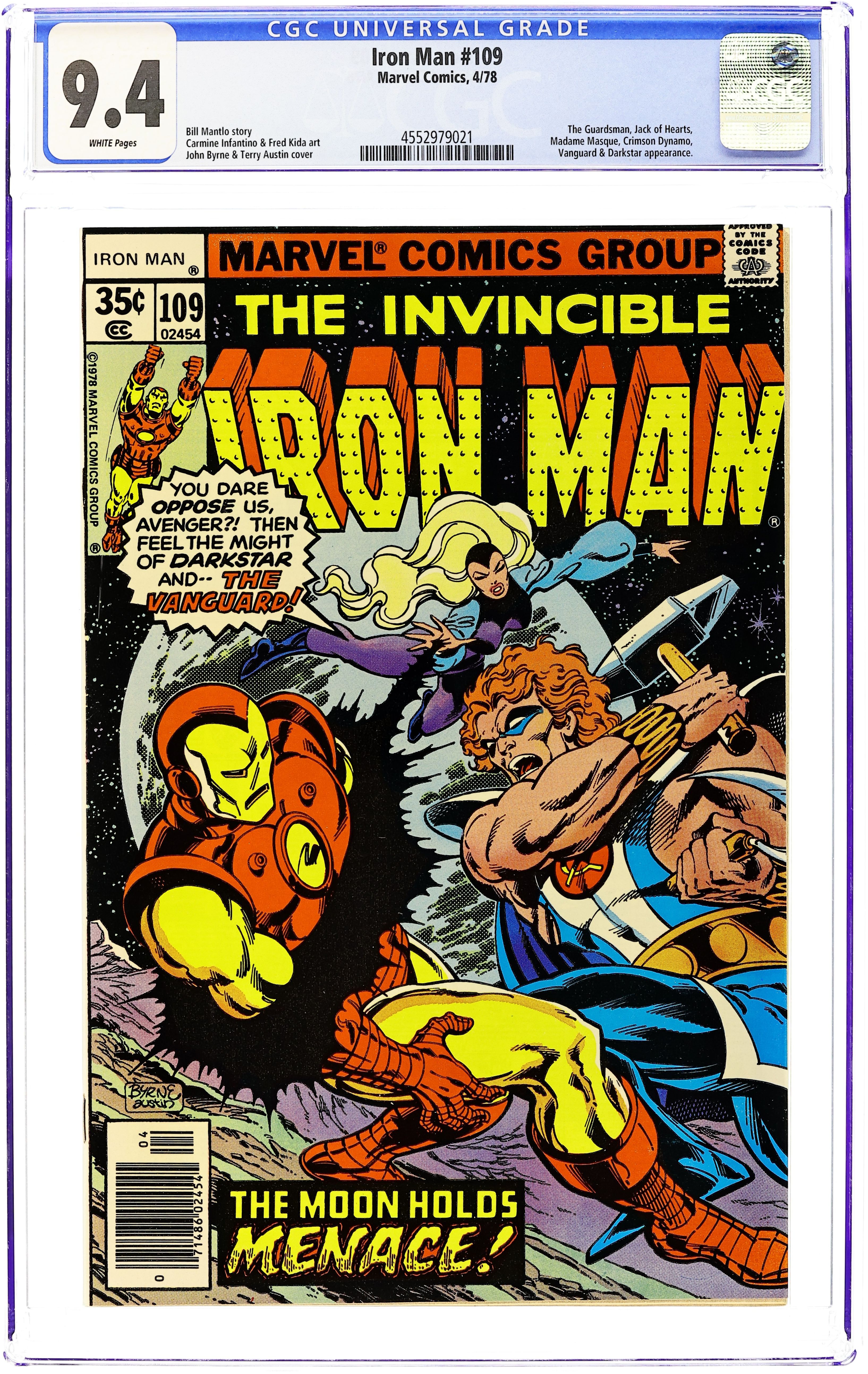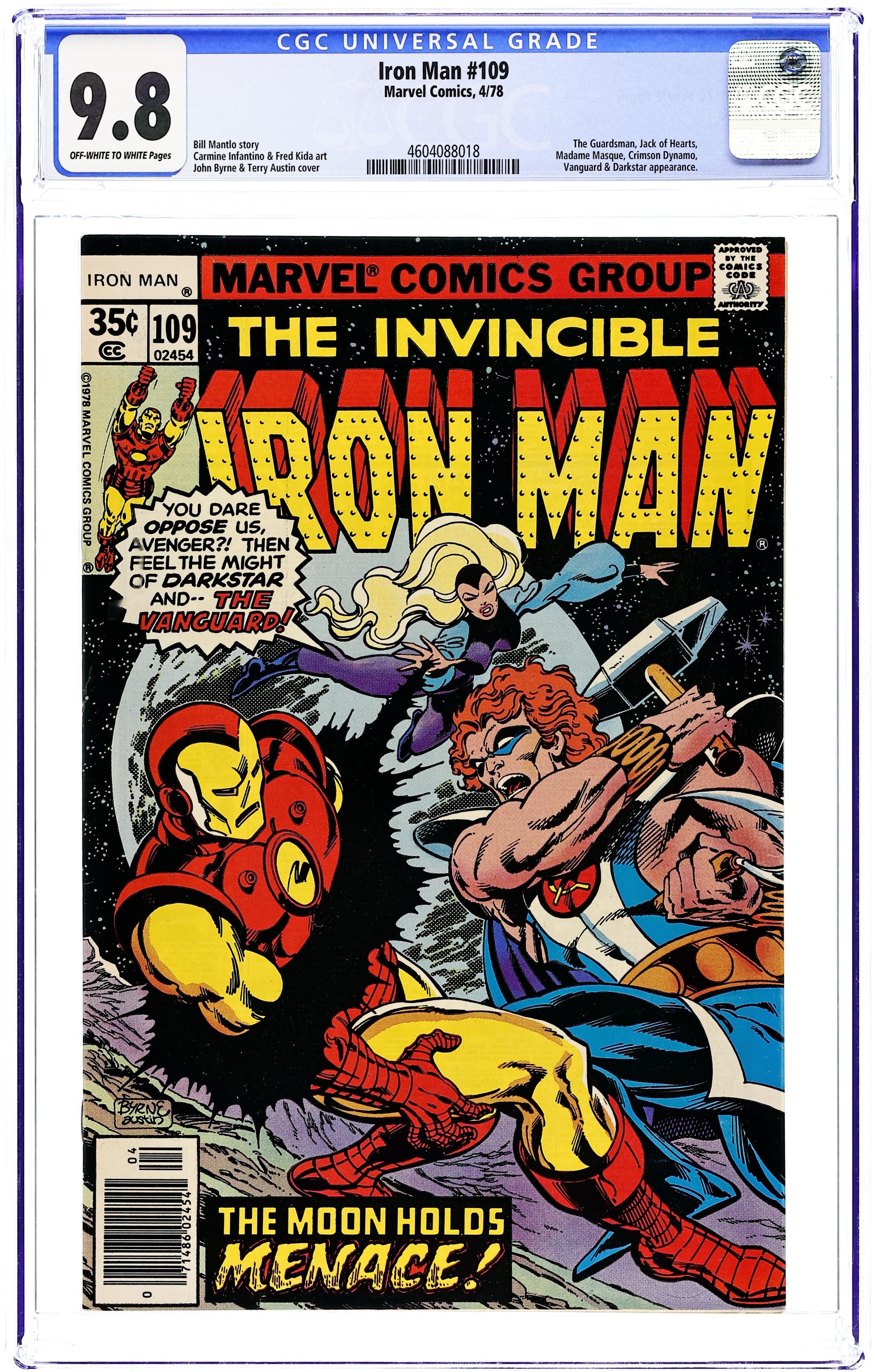 "Moonrise!" Part 1 of 4. Guest-starring Jack of Hearts and the Soviet Super-Soldiers. Script by Bill Mantlo. Pencils by Carmine Infantino. Inks by Fred Kida. Cover by John Byrne and Terry Austin. When a strange energy begins to transmit from Earth's moon, Iron Man and his companion Jack of Hearts head into space to investigate! Unfortunately, Russia, also picking up the energy's signature, sends an investigative team too! Given the strained relations between the U.S. and Russia, it's no surprise a battle erupts! It's the armored avenger and Jack of Hearts vs. the Soviet Super-Soldiers (Darkstar, Vanguard, Crimson Dynamo) on the surface of the moon! First appearance of Vanguard. Cameo appearances by the Guardsman, Madame Masque, Jean DeWolff, Jasper Sitwell, and Yellowjacket. (Note: The letters page includes a letter from comics cartoonist Fred Hembeck.) 32 pages. Cover price $0.35.
