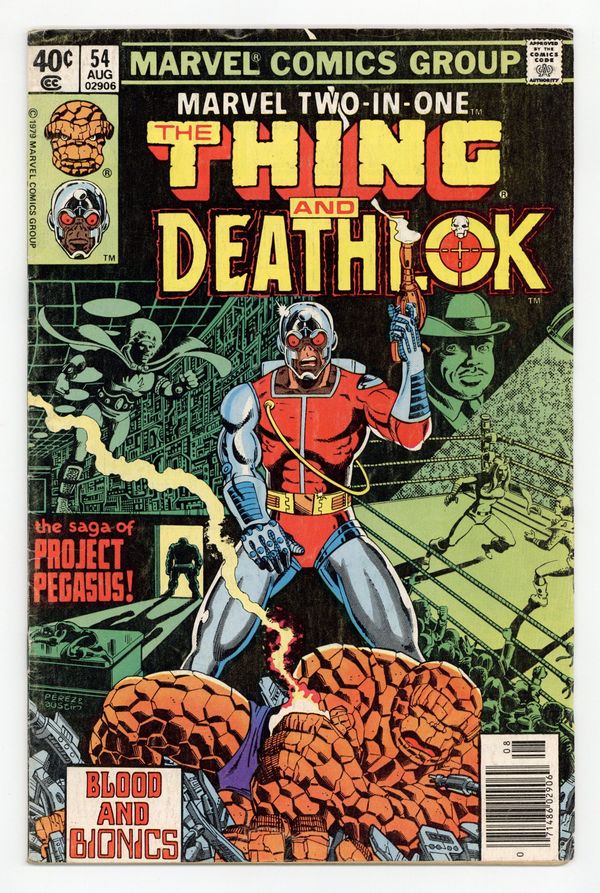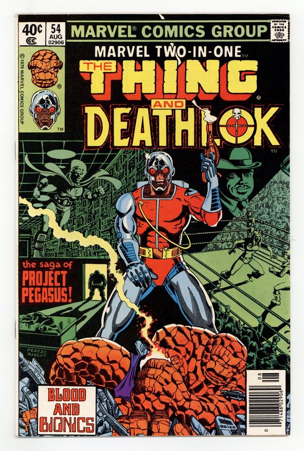 Newsstand Edition. Cover by George Pérez and Terry Austin. The Pegasus Project. Part 2 of 6. "Blood and Bionics!" Guest-starring Deathlok and Quasar. Thundra cameo. Story by Mark Gruenwald and Ralph Macchio. Art by John Byrne and Joe Sinnot. Can even the combined might of the Thing and Quasar take down the cybernetic killer from the future known as Deathlok? Plus beware, there is betrayal at Project: Pegasus. Cover price $0.40.