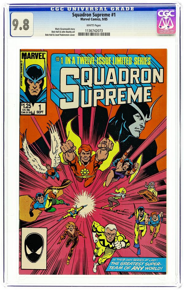 Direct Edition. "The Utopia Principle!" Story by Mark Gruenwald. Art by Bob Hall and John Beatty. Cover by Hall & Joe Rubinstein. Long before the Authority, Ultimates, and Supreme Power - there was the Squadron Supreme! Ever wonder what it would be like if the world's greatest heroes took over the world and forced humanity to live in a utopia under their super-human guidance? That's exactly the scenario this twelve issue mini series explores. Considered by many to be years ahead of its time, this series features a JLA-like team of heroes who, with no more villains or world threats to conquer, turn their attentions to creating a worldwide utopia - even if they must take over the planet to do it. As the story unfolds we learn that not all the heroes are on board with this new world order, and a line will be drawn in the sand. Cover price $1.25.