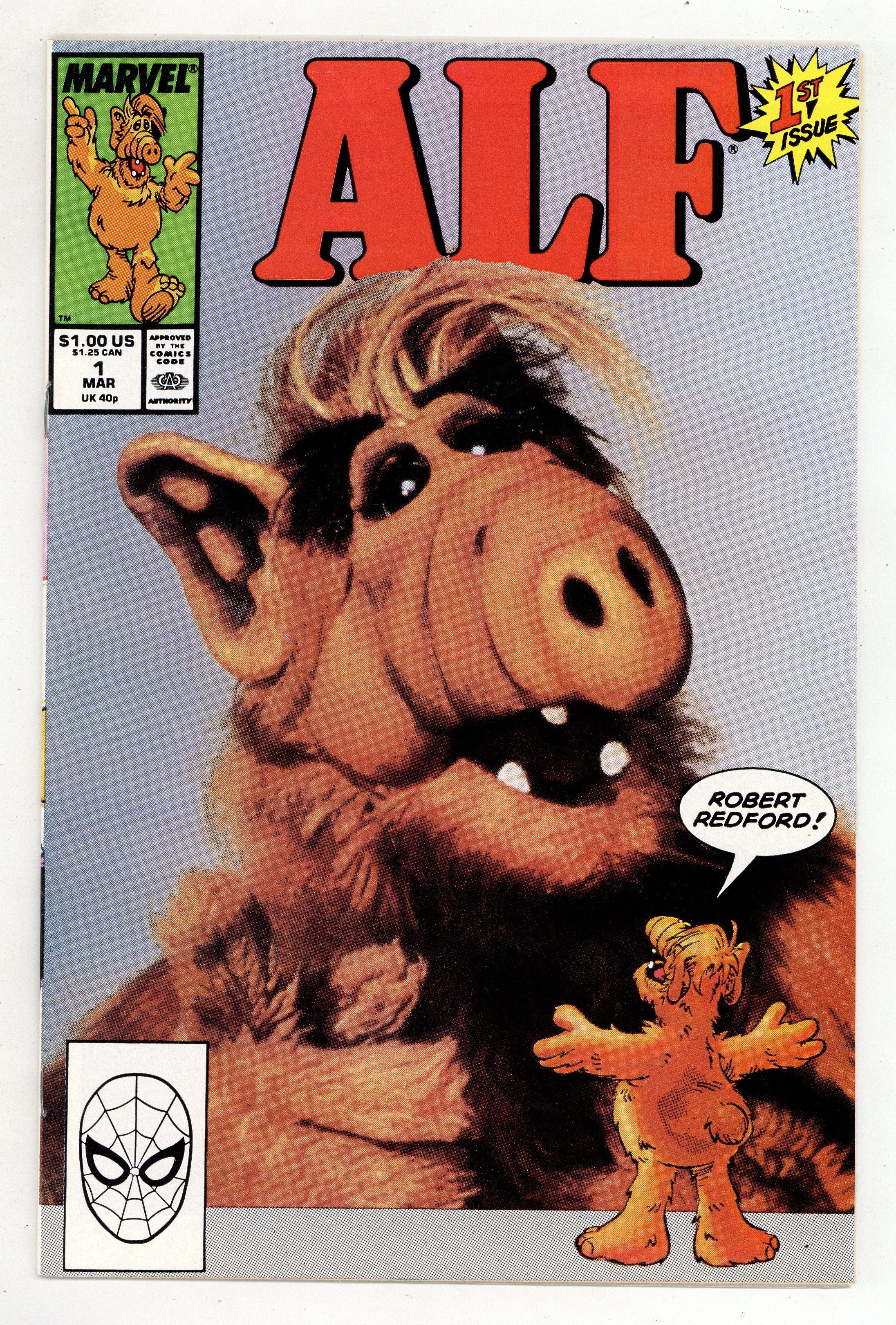$7.50Direct Edition. Comic book version of the TV sitcom and cartoon that aired on NBC from 1986 to 1990 featuring an Alien Life Form (ALF) living with a family. It's a big problem when ALF's spaceship gets accidently picked up by the garbage men in "At Your Disposal." Then ALF goes along on the family's ski resort vacation but struggles with having to stay indoors and out of sight, especially when Brian is having bully problems in "Snow Skin Off My Nose." And in "Play Misty for Me," ALF tells Willie and Kate about his "glory days" as an orbit guard on Melmac. Scripts by Michael Gallagher and art by Dave Manak & Marie Severin. Photo cover. Cover price $1.00.