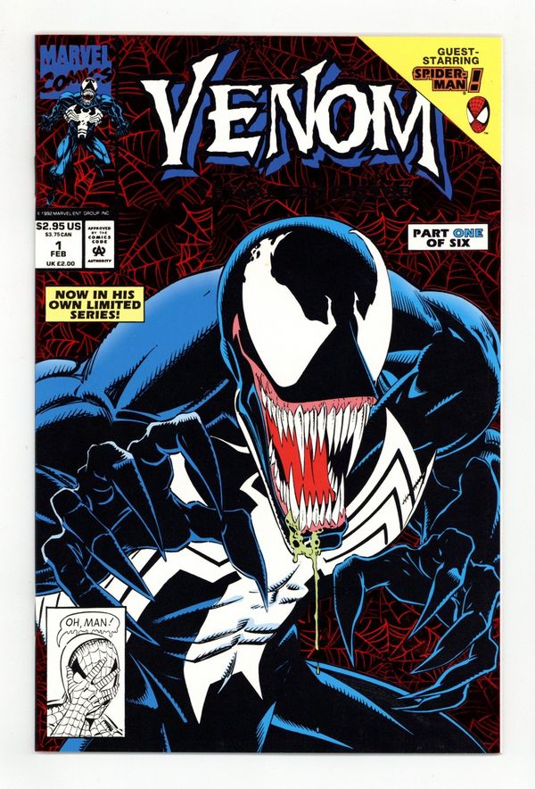 Tags: Marvel Legacy Numbering: Venom (part 1)$32.00Direct Edition. Red Foil Enhanced CardStock cover, art by Mark Bagley and Sam de la Rosa. Lethal Protector Part 1: Dark Soul Drifting, script by David Michelinie, pencils by Mark Bagley, inks by Al Milgrom and Sam de la Rosa; Venom moves to San Fransisco to try out his new protection of innocents racket; Venom and Spidey save a group of homeless folk. 36 pgs., full color. $2.95. Cover price $2.95.