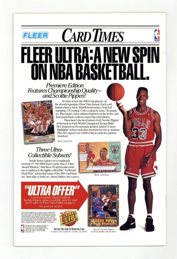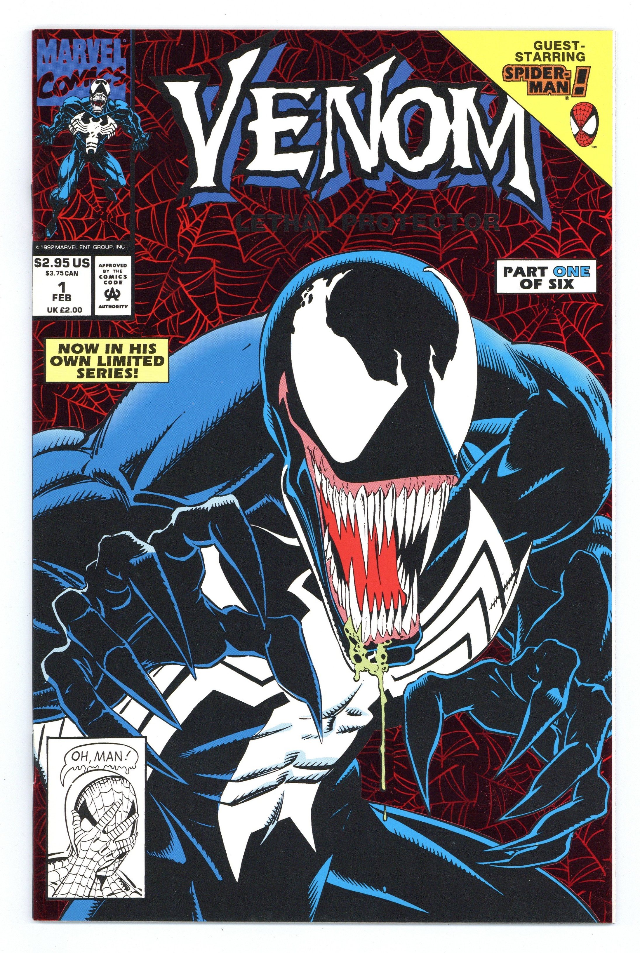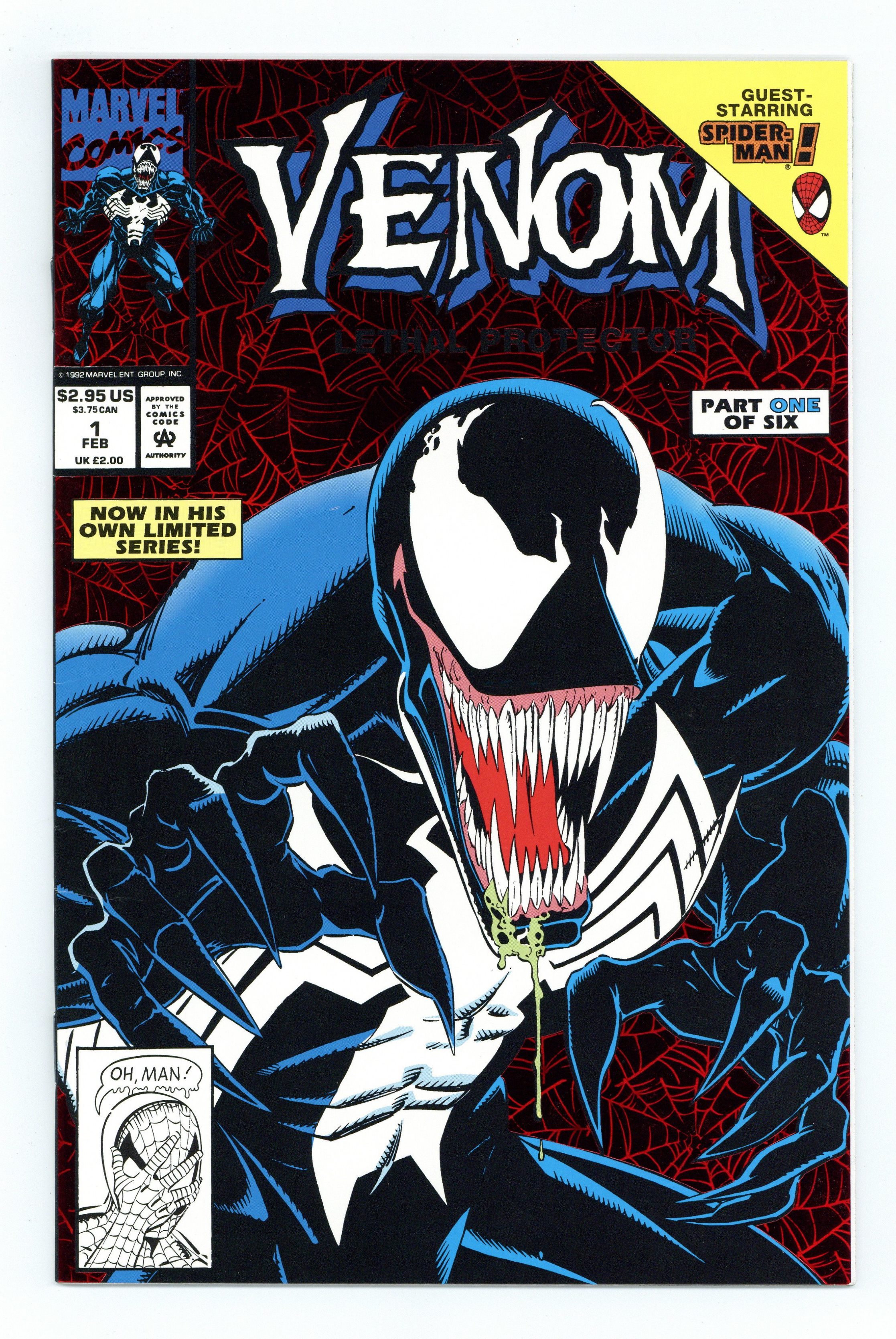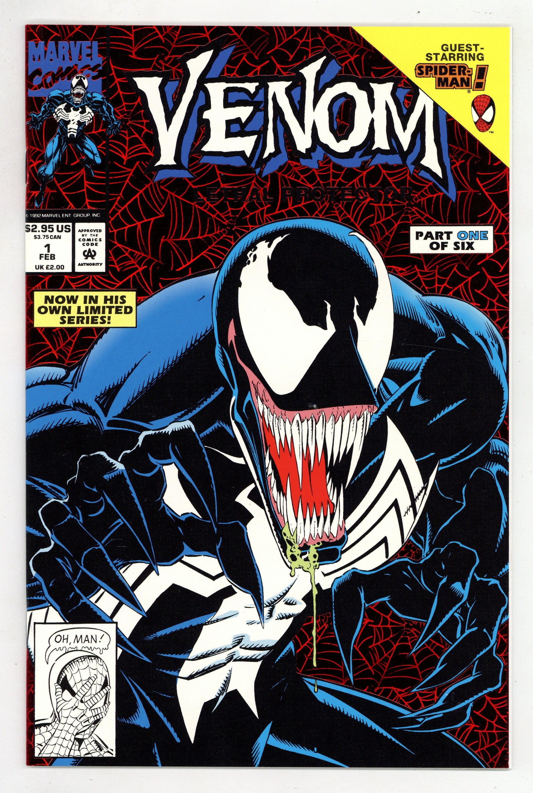 Direct Edition. Red Foil Enhanced CardStock cover, art by Mark Bagley and Sam de la Rosa. Lethal Protector Part 1: Dark Soul Drifting, script by David Michelinie, pencils by Mark Bagley, inks by Al Milgrom and Sam de la Rosa; Venom moves to San Fransisco to try out his new protection of innocents racket; Venom and Spidey save a group of homeless folk. 36 pgs., full color. $2.95. Cover price $2.95.