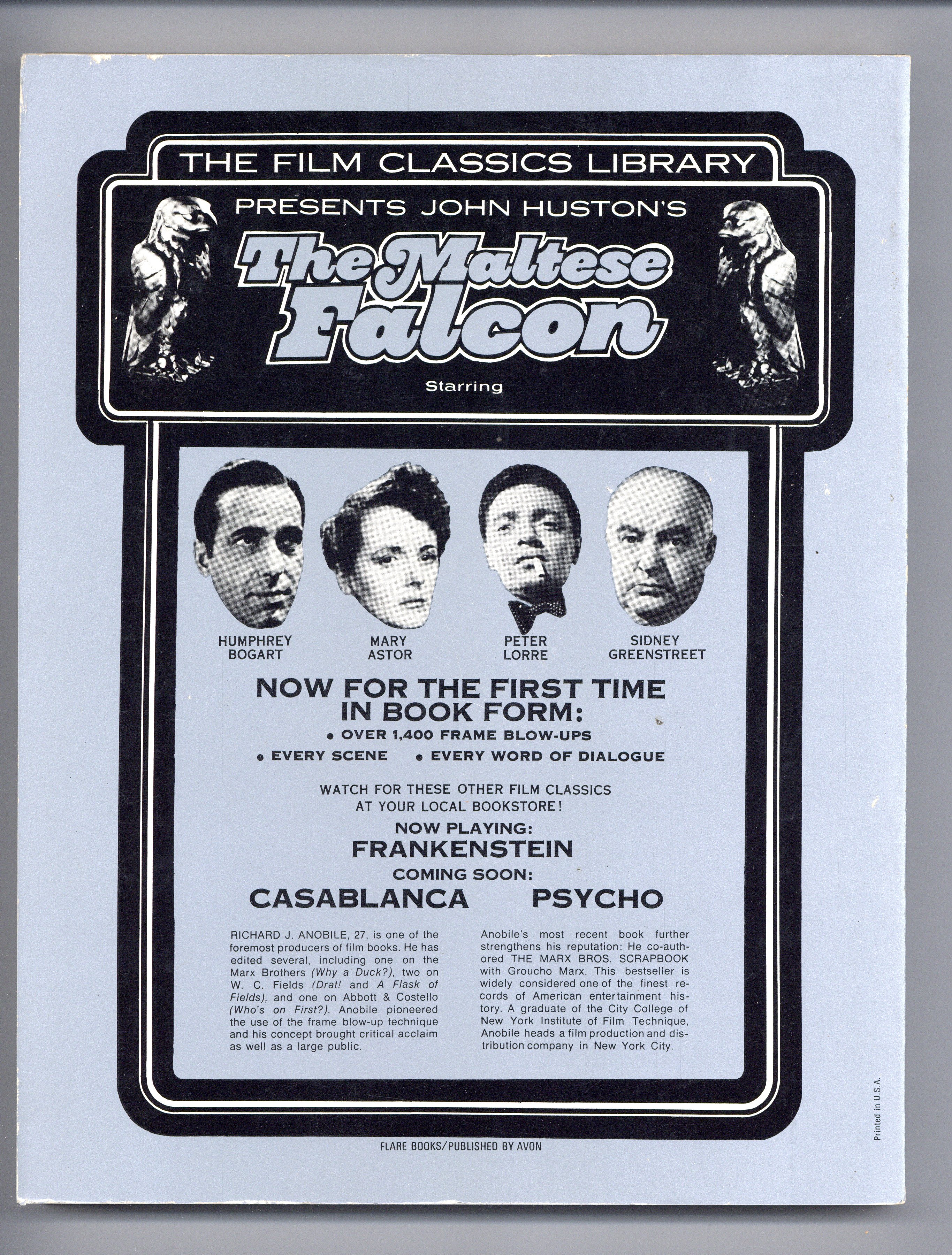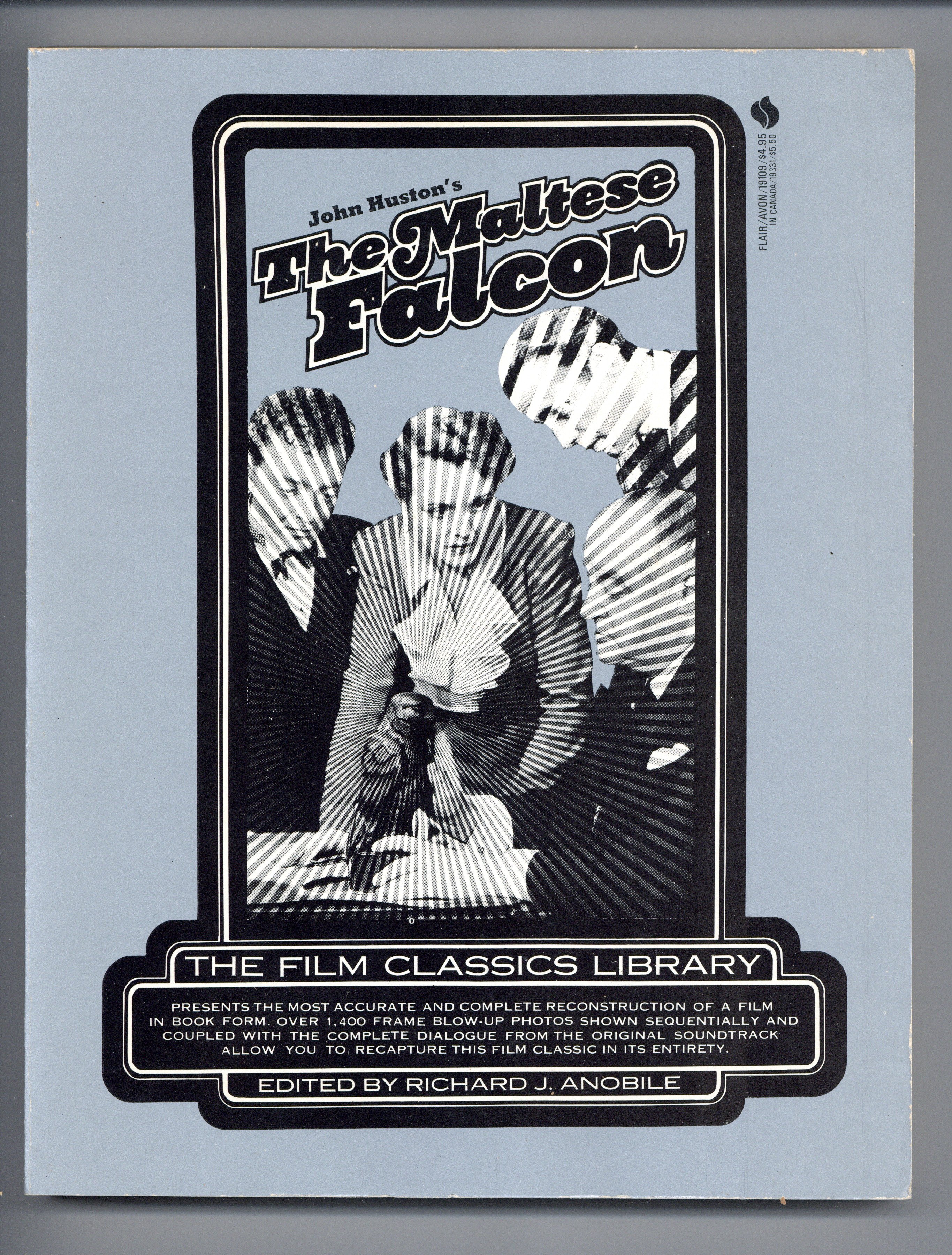 Published Mar 1974 by Avon Books.$21.00The Maltese Falcon - Part of The Film Classics Library series. Reconstruction of a film in book form. Over 1,400 frame blow-up photos. 8.5" x 11", 256 pages, B&W. Cover price $4.95.