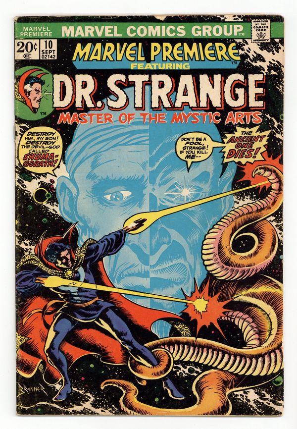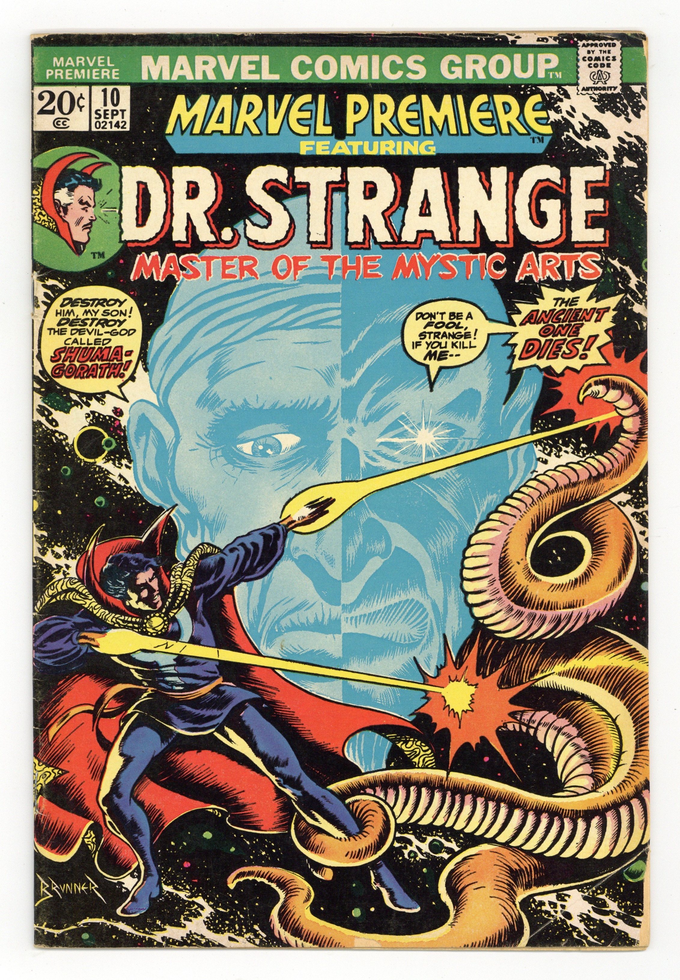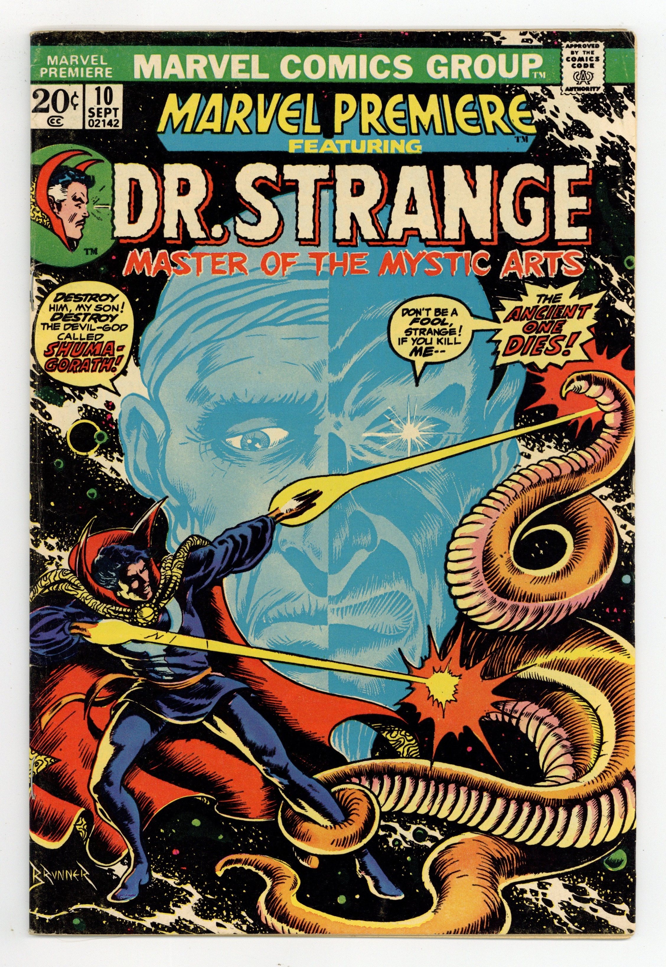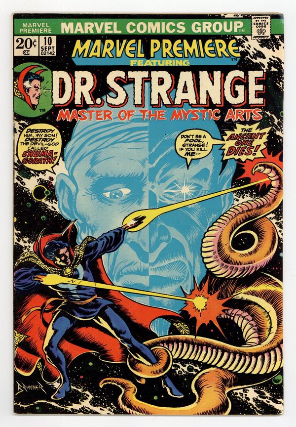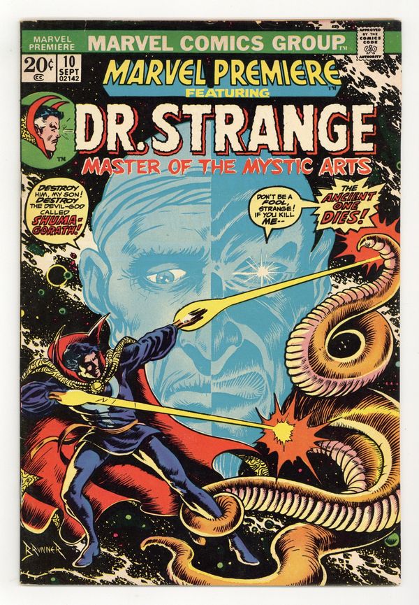 Cover art by Frank Brunner. Finally, Shuma-Gorath!, script by Steve Englehart (co-plot; script) and Frank Brunner (co-plot), pencils by Frank Brunner, inks by Neal Adams' Continuity Studios [as The Singing Sons Of The Crusty Bunkers]; Strange enters Ancient One's mind, and battles Shuma-Gorath for mankind's Soul; To destroy Shuma-Gorath, who feeds on the mind of the Ancient One, Strange kills the Ancient One; The Ancient One becomes One with the Universe. 36 pgs. $0.20. Cover price $0.20.