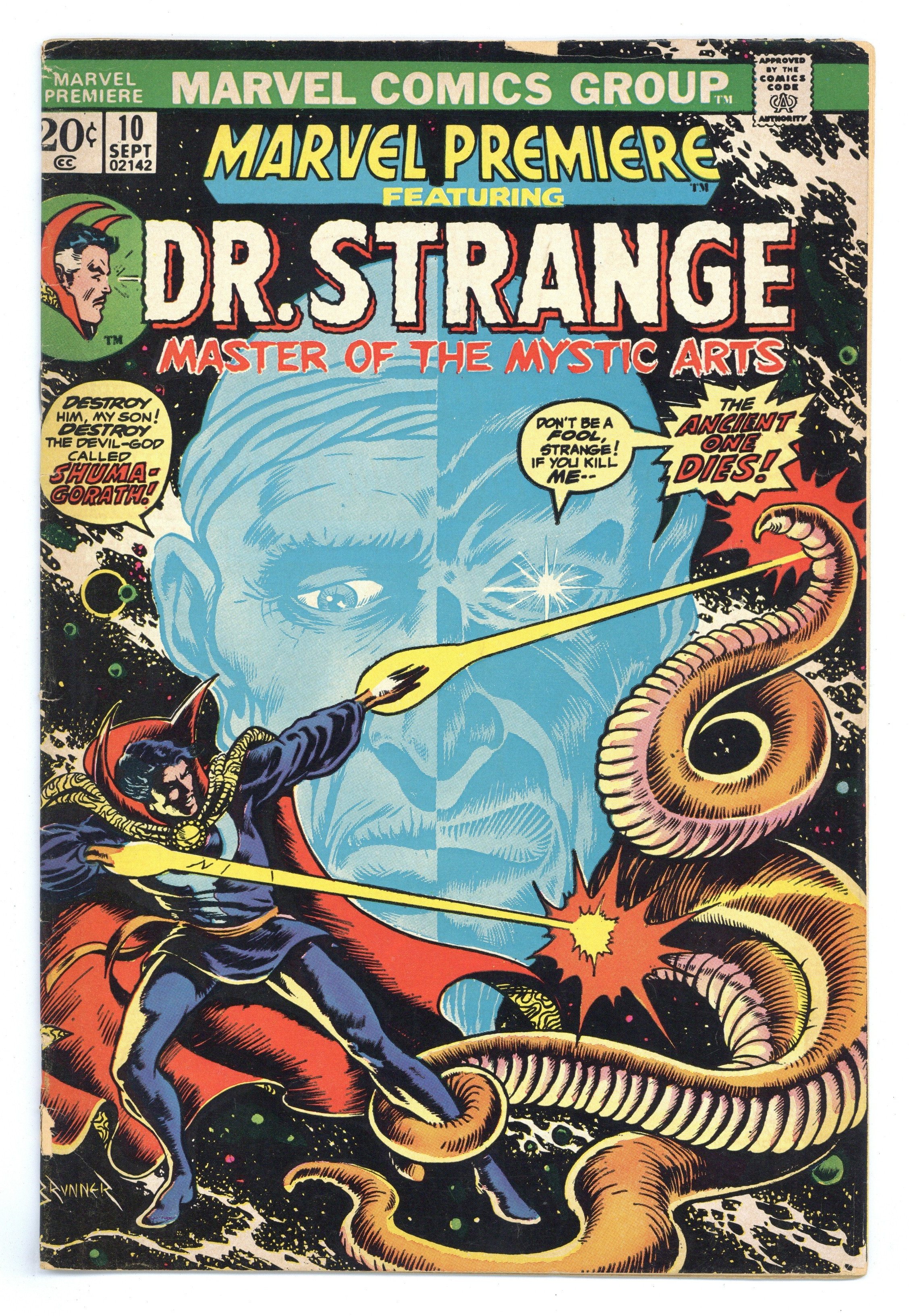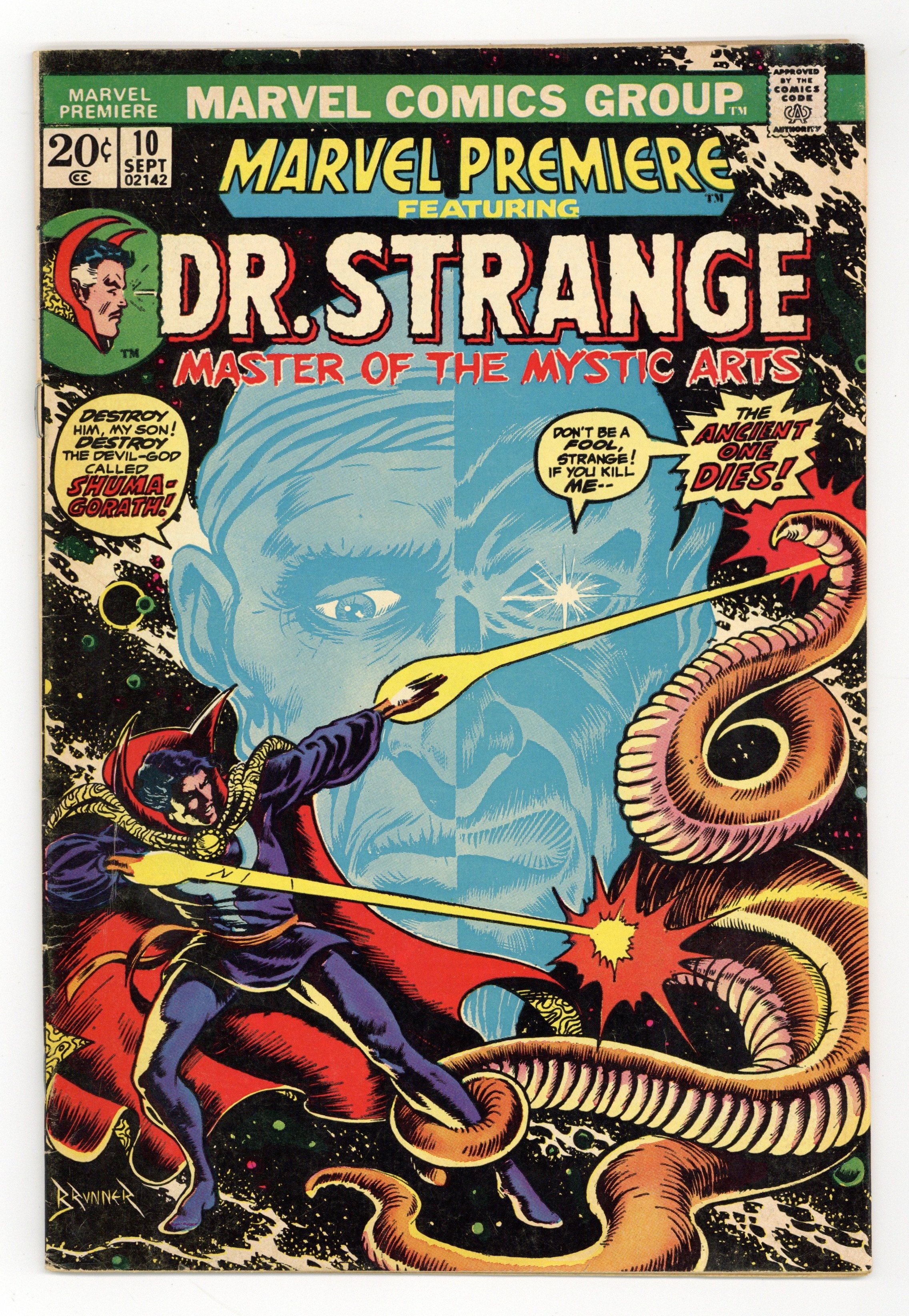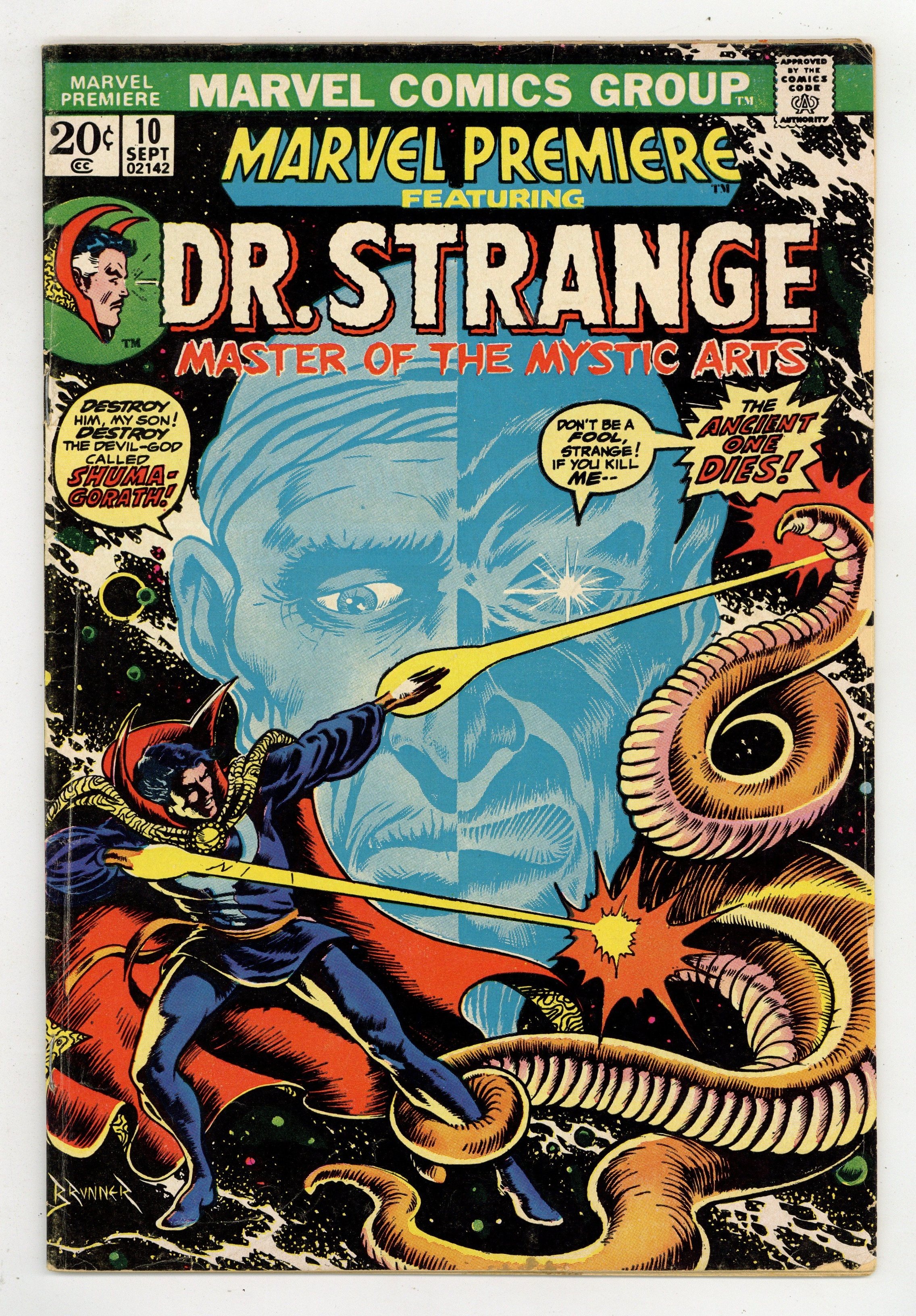 Cover art by Frank Brunner. Finally, Shuma-Gorath!, script by Steve Englehart (co-plot; script) and Frank Brunner (co-plot), pencils by Frank Brunner, inks by Neal Adams' Continuity Studios [as The Singing Sons Of The Crusty Bunkers]; Strange enters Ancient One's mind, and battles Shuma-Gorath for mankind's Soul; To destroy Shuma-Gorath, who feeds on the mind of the Ancient One, Strange kills the Ancient One; The Ancient One becomes One with the Universe. 36 pgs. $0.20. Cover price $0.20.