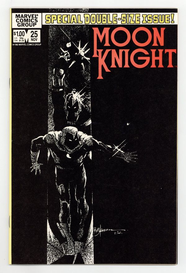 Tags: Marvel Legacy Numbering: Moon Knight (part 25)$30.00Special double-size issue - "Black Spectre!" Written by Doug Moench. Art and cover by Bill Sienkiewicz. A down on his luck nobody's sanity snaps and he decides to become an anti-Moon Knight while running for mayor of New York in his civilian guise. 32 pages, FC. Cover price $1.00.