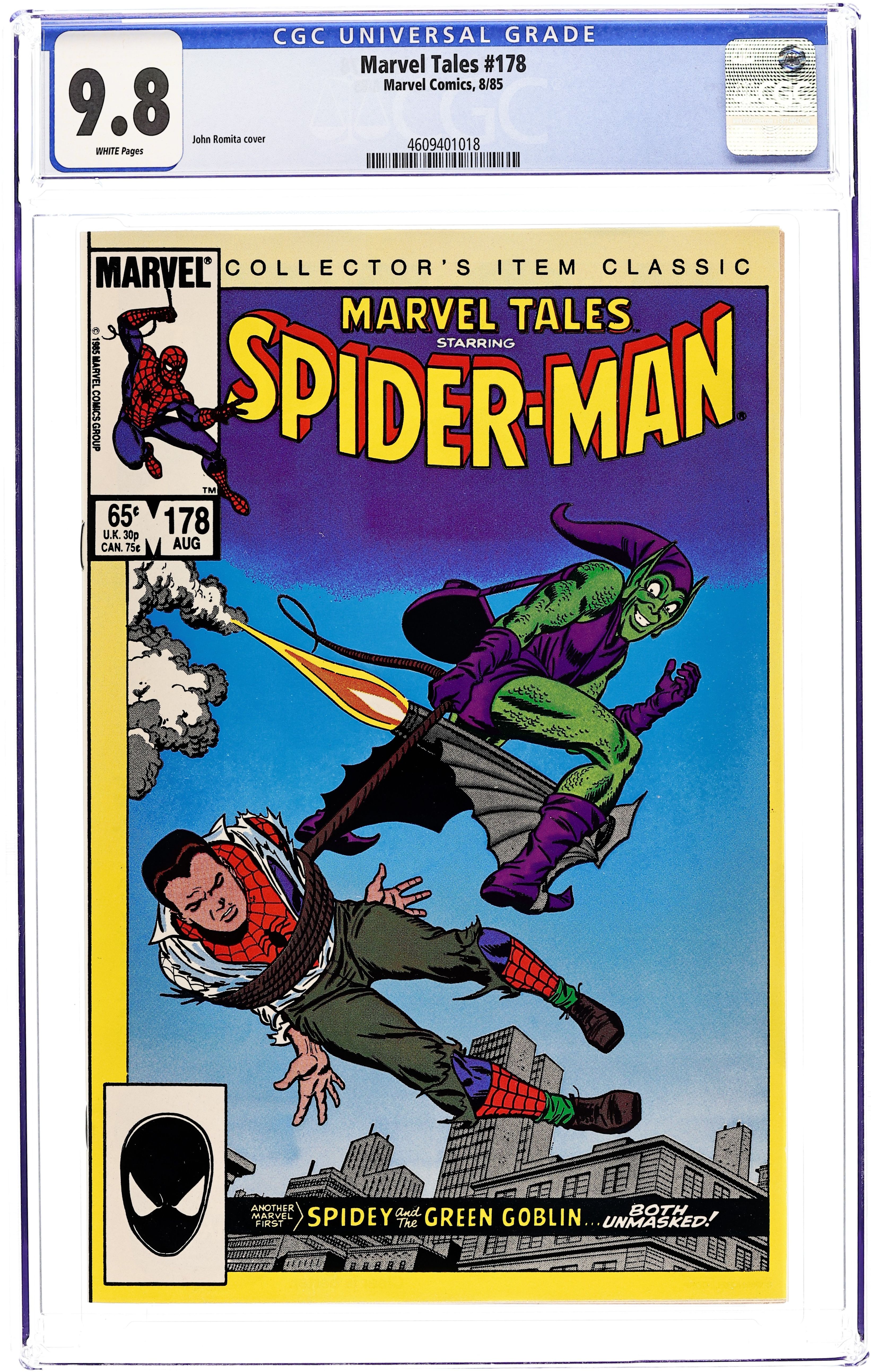 Direct Edition. Reprints Amazing Spider-Man (1963 1st Series) #39. Cover art by John Romita, Sr. "How Green Was My Goblin!" Script by Stan Lee, pencils by John Romita, Sr. (who begins as regular penciler), inks by Mike Esposito [as Mickey Demeo] and John Romita, Sr. (touch-ups). Peter heads to the doctor with the sniffles and learns that Aunt May's health is very fragile; Spidey is roped into tangling with a bunch of goons who zap him with a mysterious gas; not realizing that the gas has weakened his spider sense, he changes into Peter Parker under the watchful gaze of the Green Goblin; the Goblin confronts Spidey outside of his home and captures him as Peter is worried that Aunt May might be overcome by the commotion; trussed up in the Goblin's lair, Peter is shocked when the Goblin takes off his mask and reveals himself to be Norman Osborn. According to Les Daniels in "Marvel: Five Fabulous Decades of the World's Greatest Comics" (Abrams, 1991), artist Steve Ditko resigned because of a disagreement over the Goblin's identity. Ditko wanted it to be someone anonymous--a new, unknown guy; Lee wanted it to be a familiar character that would startle readers. Cover price $0.65.