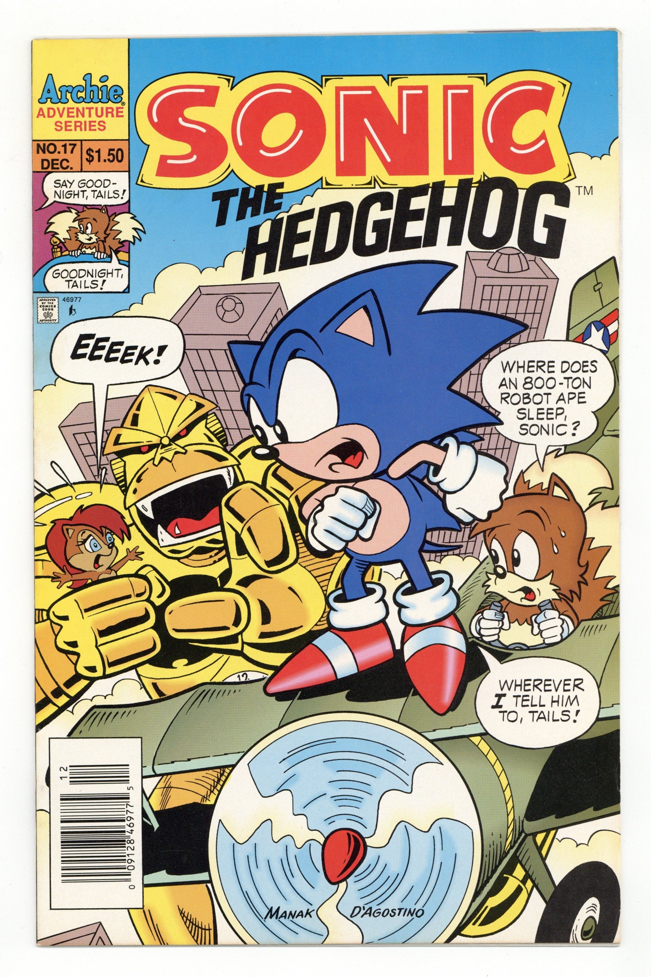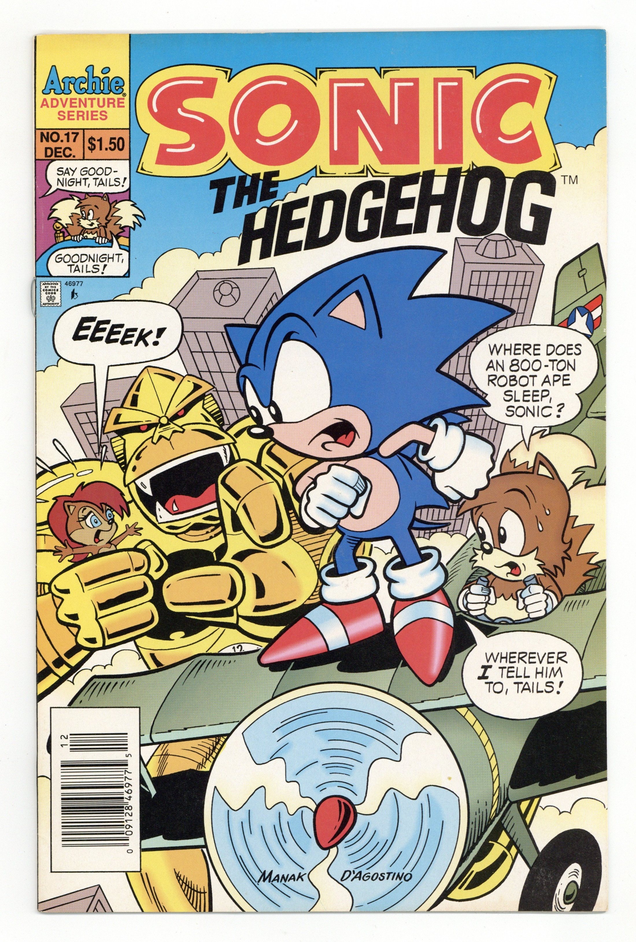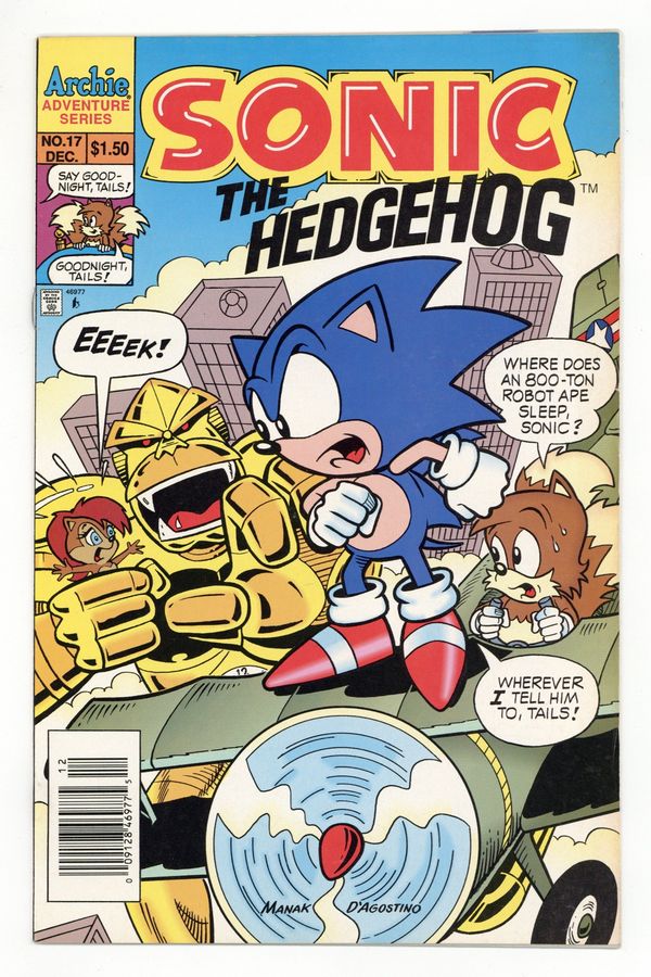 Published Dec 1994 by Archie Publications.$16.50Newsstand Edition. Cover pencils by Dave Manak, inks by Jon D'Agostino. Gorilla Warfare or The Apes Of Wrath, script by Mike Kanterovich and Ken Penders, pencils by Dave Manak, inks by Harvey Mercadoocasio [as Harvey M.]; Dr. Robotnik sends a giant robot ape against Sonic and the Freedom Fighters. First Star I See Tonight, script by Mike Kanterovich and Ken Penders, pencils by Art Mawhinney, inks by Jon D'Agostino; Princess Sally finds a glowing orb that she feels may be the key to defeating Dr. Robotnik and rescuing her father from his dimensional exile. 36 pgs. $1.50. Cover price $1.50.
