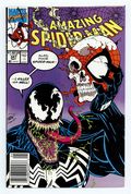 Newsstand Edition. "The Boneyard Hop!" Part 2 of 2. Script by David Michelinie. Pencils by Erik Larsen. Inks by Randy Emberlin. Cover by Erik Larsen and Randy Emberlin. On a deserted island, the Amazing Spider-Man wages a desperate battle for survival vs. the vicious Venom! The wall-crawler is fighting for his life! While Venom is fighting for his death! And this time there isn't any help or rescue on the way! As shown on the twisted cover, Venom plans to quote Hamlet once the battle is over! If the spectacular one doesn't want to play the part of Yorick; he better move fast! To thine own self be true, web-slinger! Cameo appearances by Mary Jane Watson, Willie Lumpkin, Aunt May, Flash Thompson, and the Black Cat. (Notes: Venom appears next in Darkhawk 13 & 14. This two-part story was reprinted in the trade paperbacks: Spider-Man: Venom Returns (1993) and Spider-Man: The Vengeance of Venom (2011).) 36 pages. Cover price $1.00. Cover price $1.00.