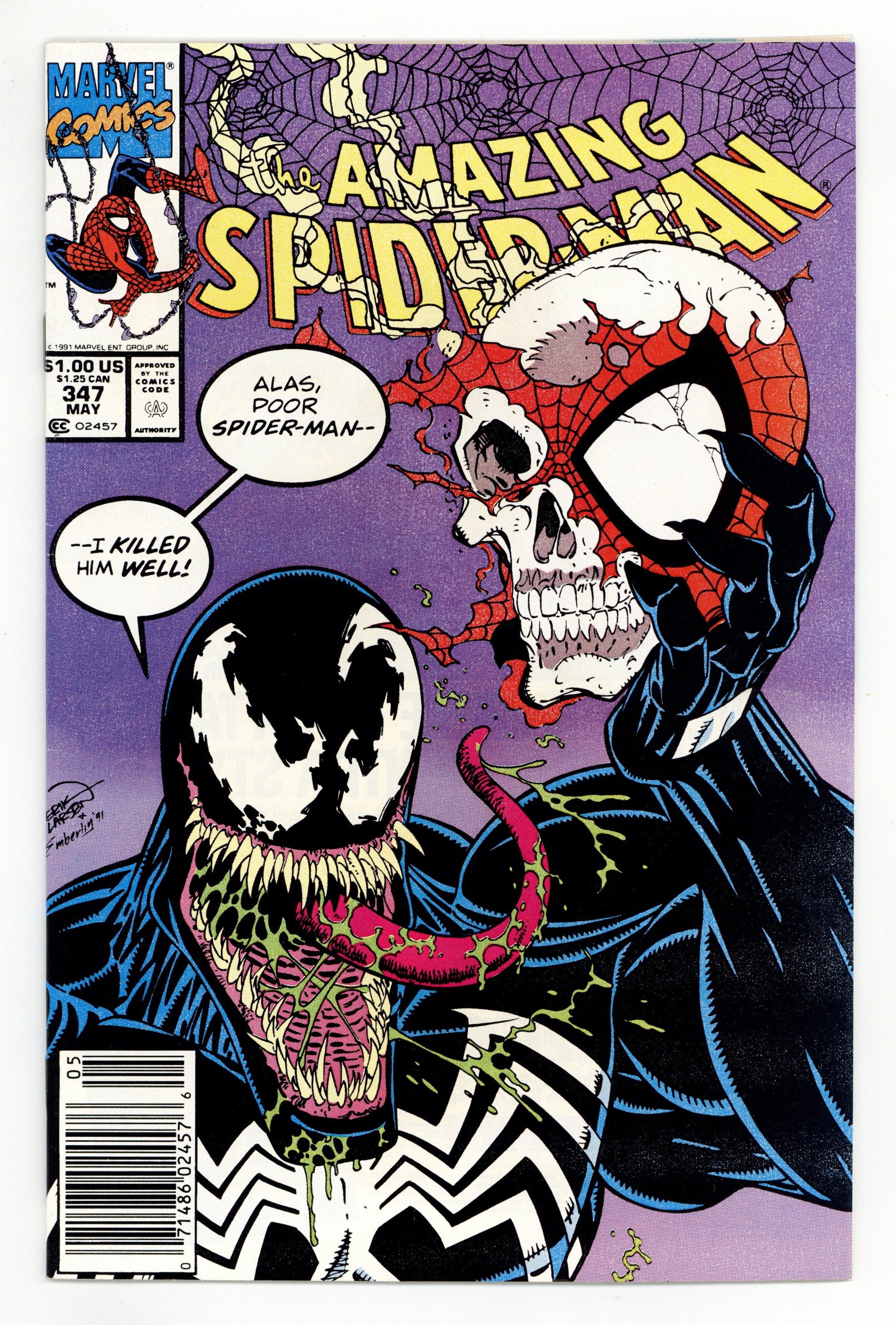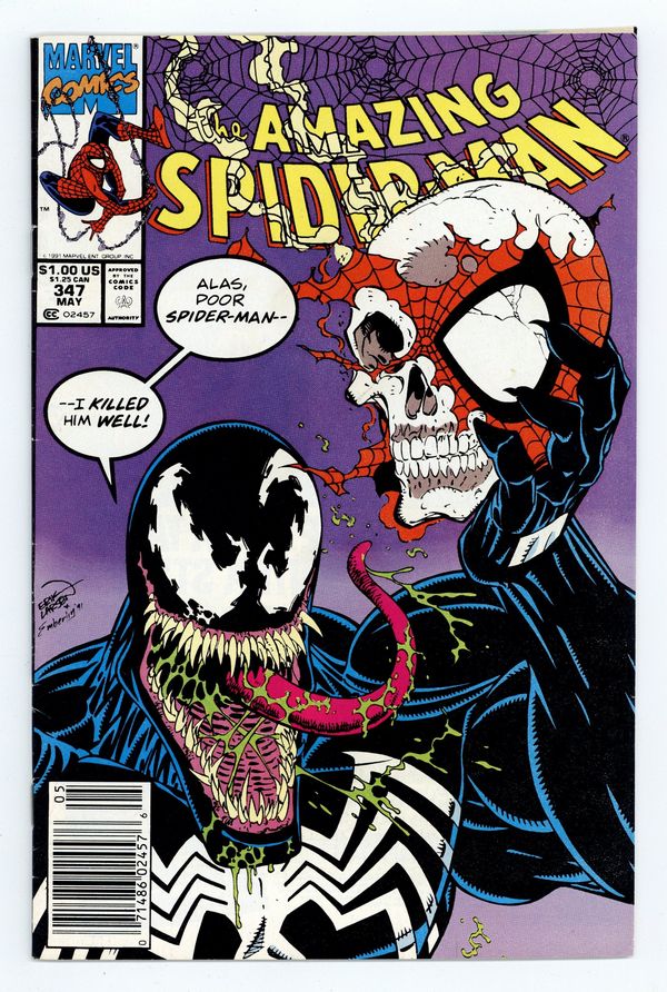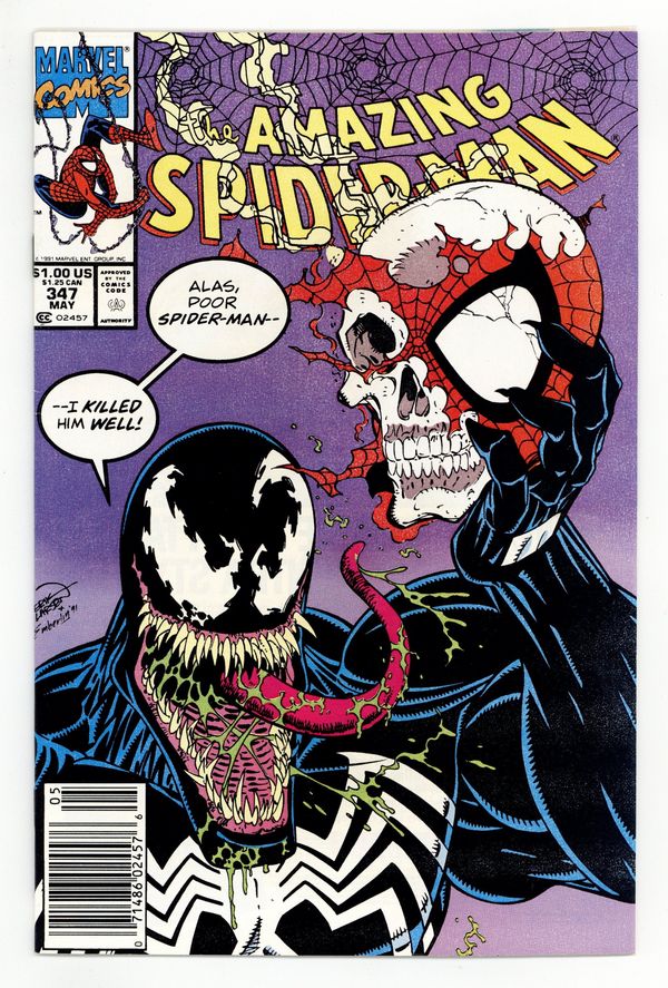 Tags: Spider-Man$55.00Newsstand Edition. "The Boneyard Hop!" Part 2 of 2. Script by David Michelinie. Pencils by Erik Larsen. Inks by Randy Emberlin. Cover by Erik Larsen and Randy Emberlin. On a deserted island, the Amazing Spider-Man wages a desperate battle for survival vs. the vicious Venom! The wall-crawler is fighting for his life! While Venom is fighting for his death! And this time there isn't any help or rescue on the way! As shown on the twisted cover, Venom plans to quote Hamlet once the battle is over! If the spectacular one doesn't want to play the part of Yorick; he better move fast! To thine own self be true, web-slinger! Cameo appearances by Mary Jane Watson, Willie Lumpkin, Aunt May, Flash Thompson, and the Black Cat. (Notes: Venom appears next in Darkhawk 13 & 14. This two-part story was reprinted in the trade paperbacks: Spider-Man: Venom Returns (1993) and Spider-Man: The Vengeance of Venom (2011).) 36 pages. Cover price $1.00. Cover price $1.00.