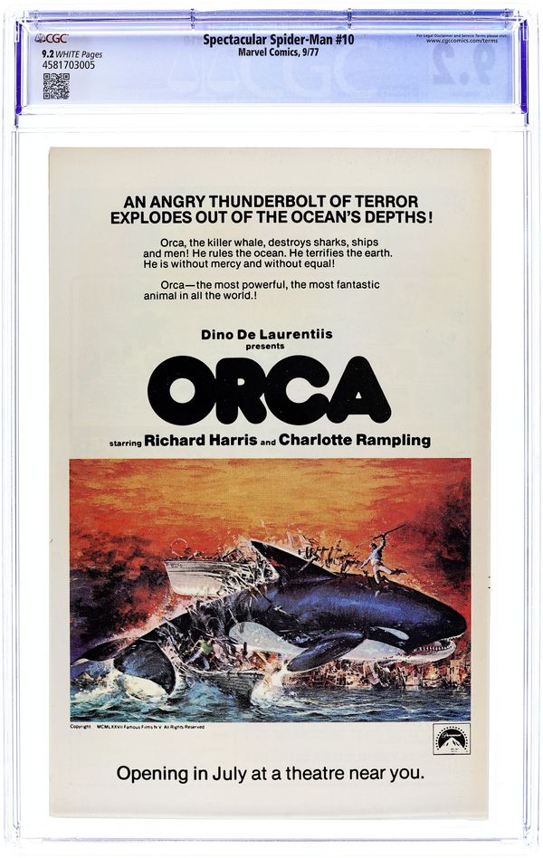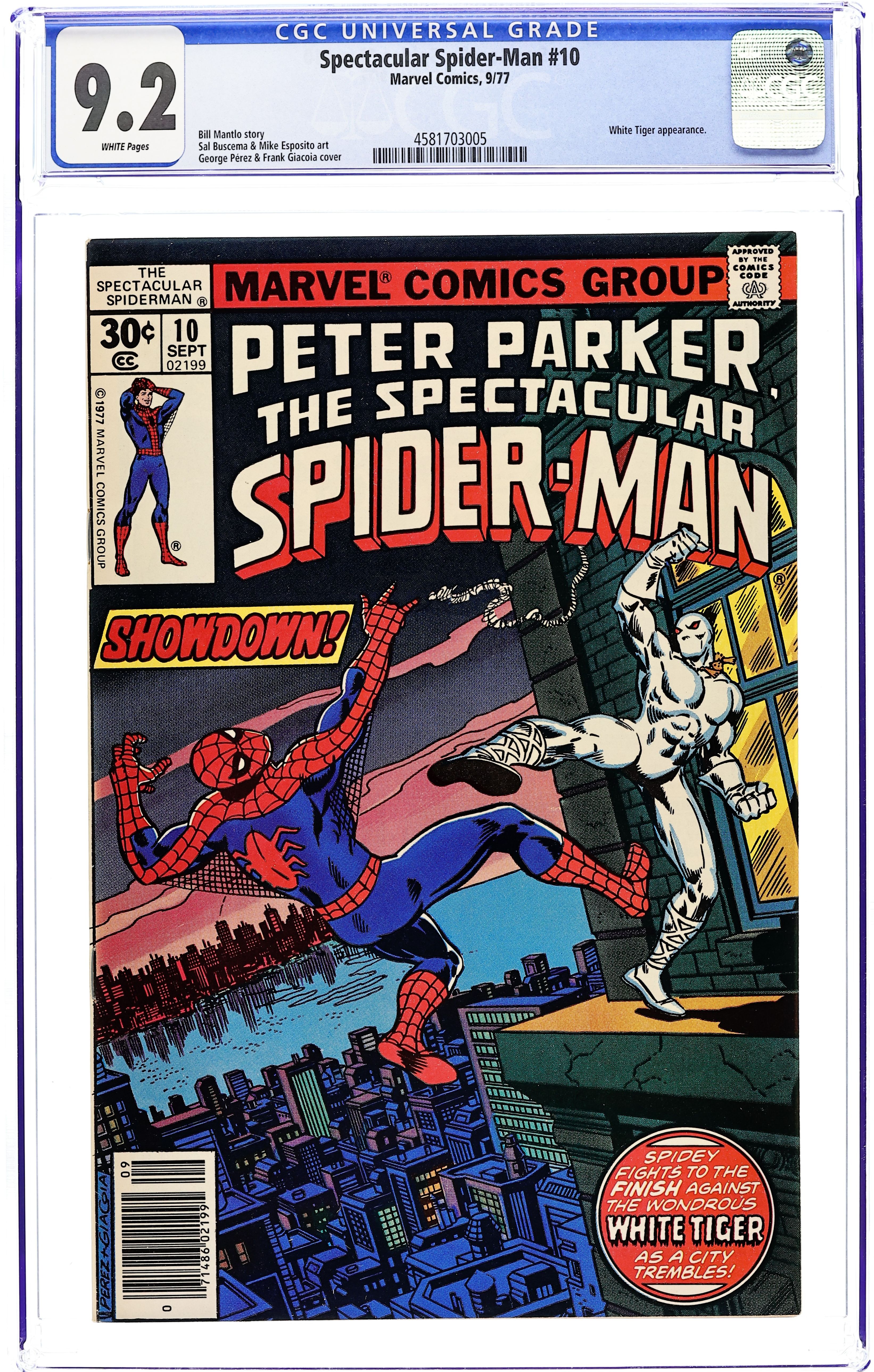 "Tiger in a Web!" Part 2 of 2. Script by Bill Mantlo. Art by Sal Buscema (breakdowns), Mike Esposito (finishes), and Frank Giacoia (finishes). Cover by George Perez and Frank Giacoia. An awesome battle issue as the White Tiger and the Spectacular Spider-Man fight from cover-to-cover! Did the tiger really steal the Erskine Manuscripts, or is this all a giant misunderstanding? Either way, the volatile situation at ESU must be brought under control soon! Can the two heroes work together to achieve peace on campus? (Note: A 35-cent cover price variant exists for this issue.) Cover price $0.30.