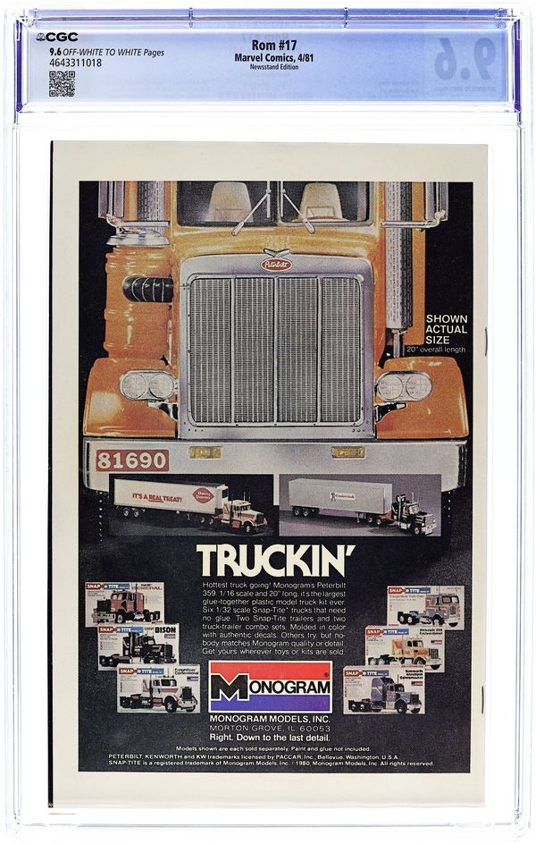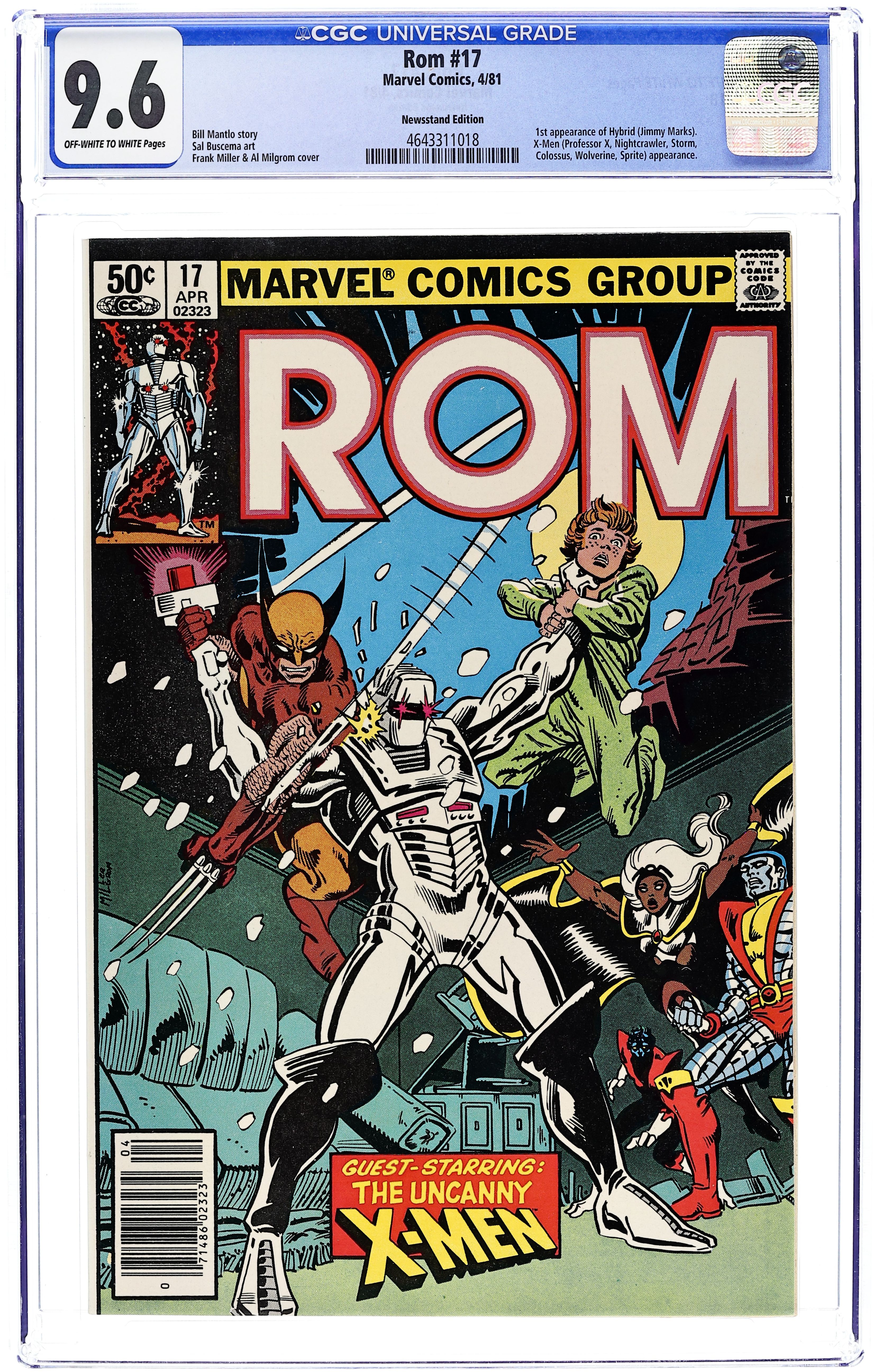 Newsstand Edition. Part 1 of 2 - Guest starring the Uncanny X-Men (Wolverine, Storm, Nightcrawler, Colossus, and Sprite). Story by Bill Mantlo. Art by Sal Buscema. Frank Miller cover. Cerebro, the mutant detecting device of Professor Charles Xavier, has discovered a new mutant residing in Clairton, West Virginia. He immediately dispatches his students, the mutant heroes known as the X-Men, to find this new source of power. Rom, discovers that a disguised Dire Wraith has married and procreated with a human woman. Can even Rom stand against the psionic power and horrible evil of the Hybrid. 32 pages. NOTE: 1st appearance of Hybrid. Cover price $0.50.