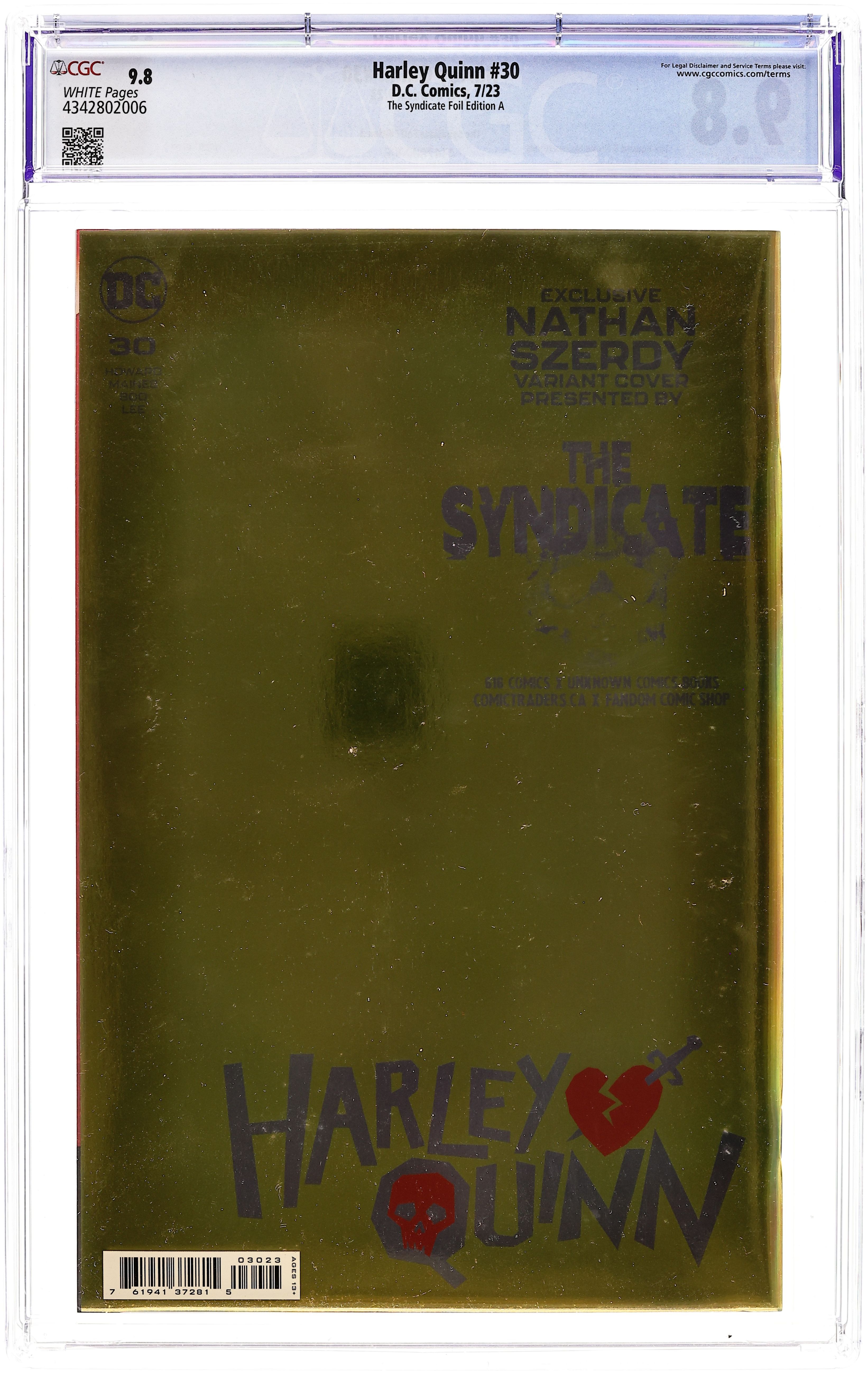The Syndicate (The 616 Comics, Unknown Comics, Comic Traders, and Fandom Comic Shop) Exclusive Gold Foil Edition Virgin Cover by Nathan Szerdy. Written by Tini Howard & Nicole Maines. Art by Sweeney Boo & Mindy Lee. Here I am in the midst of a veritable midlife extradimensional existential crisis of epic proportions, and if that's not bad enough...I got a giant, bloodthirsty, killer anthropo-whatsit rabbit man with a big ol' carrot-shaped axe to grind after me. Good thing I got my hyena spiritual advisors, Bud and Lou, to guide me on this fiendish foray into a frenzy of ferocious furballs. Plus: the introduction of my very own cosmic workout gear that is in no way an infringement on the Flash's intellectual property. Also, in this month's In-Continuity Dreams of Harley Quinn, we've cooked up a real doozy for ya! It's got swords, armor, fair maidens, and more side quests than you can shake your tuchus at! 40 pages, full color. Rated 13+