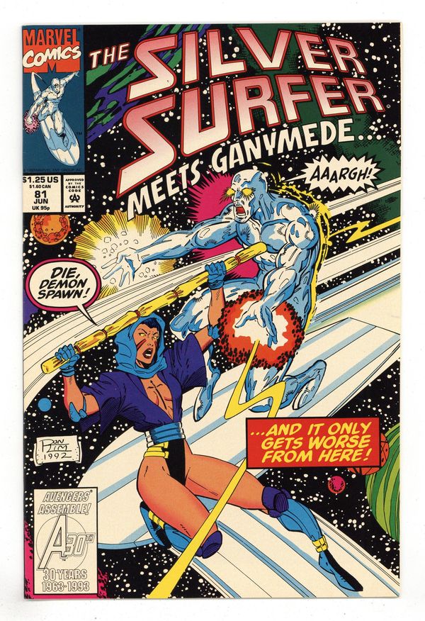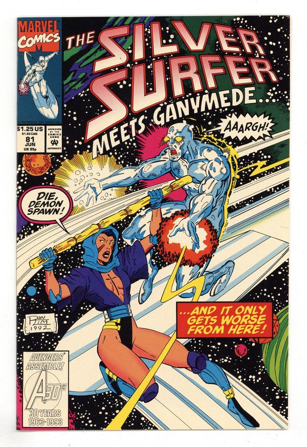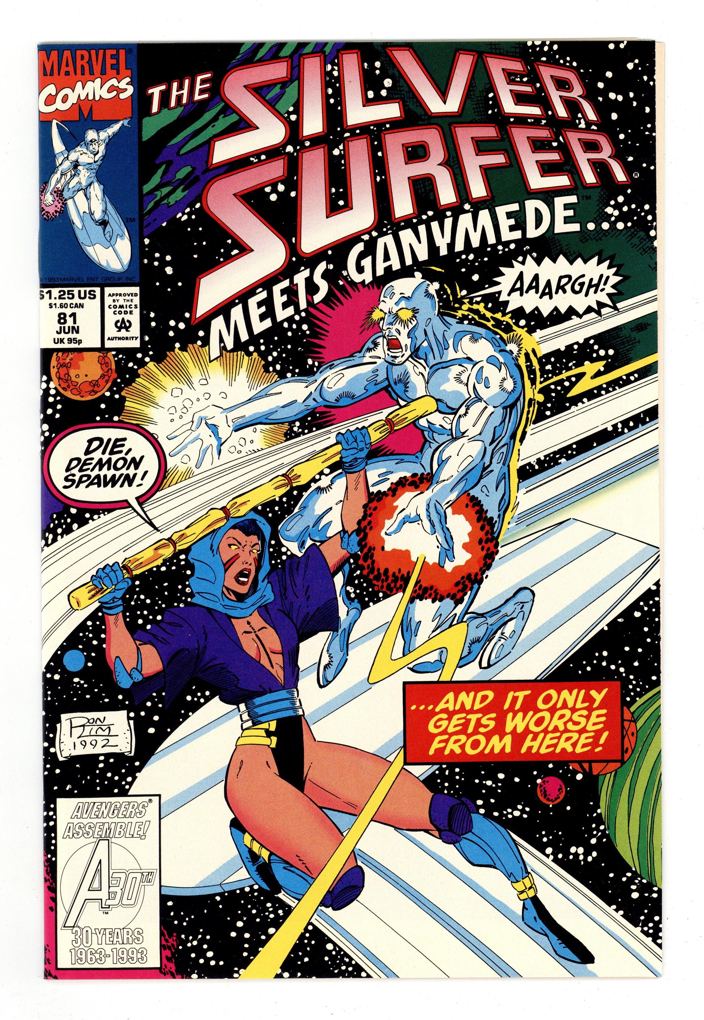 Tags: Silver Surfer$4.20"Tyrant!" Story by Ron Marz. Art by Ron Lim and Tom Christopher. Cameos by Gladiator, Beta Ray Bill, Terrax, Morg, Firelord, Airwalker, and Galactus. The Silver Surfer is attacked by Ganymede, a member of the Spinsterhood, an ancient order of female warriors. This fierce woman-warrior accuses Norrin Radd of being in league with a fiend known as Tyrant. There's just one problem...the Surfer has no idea who Tyrant is. 32 pages. Cover price $1.25.