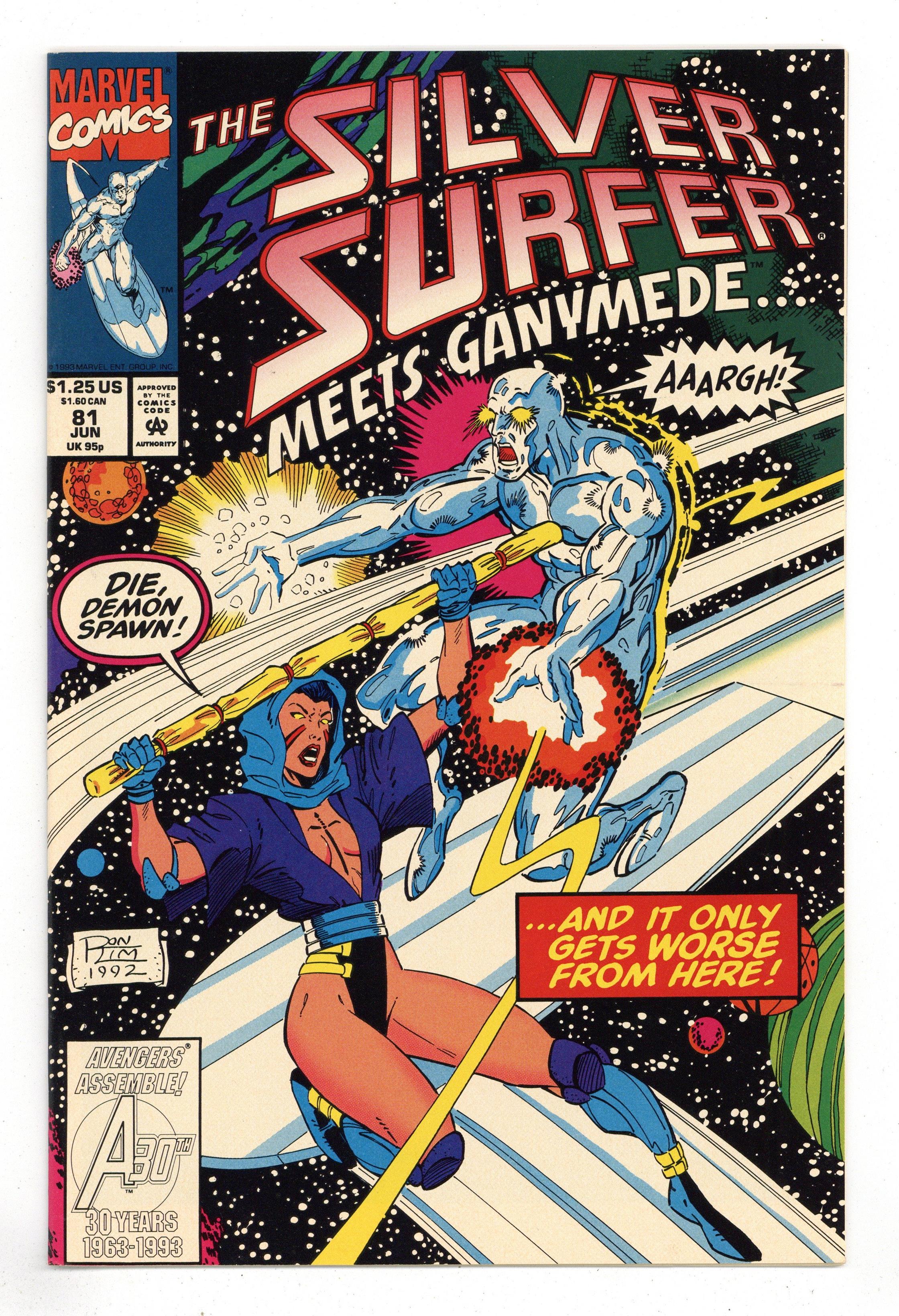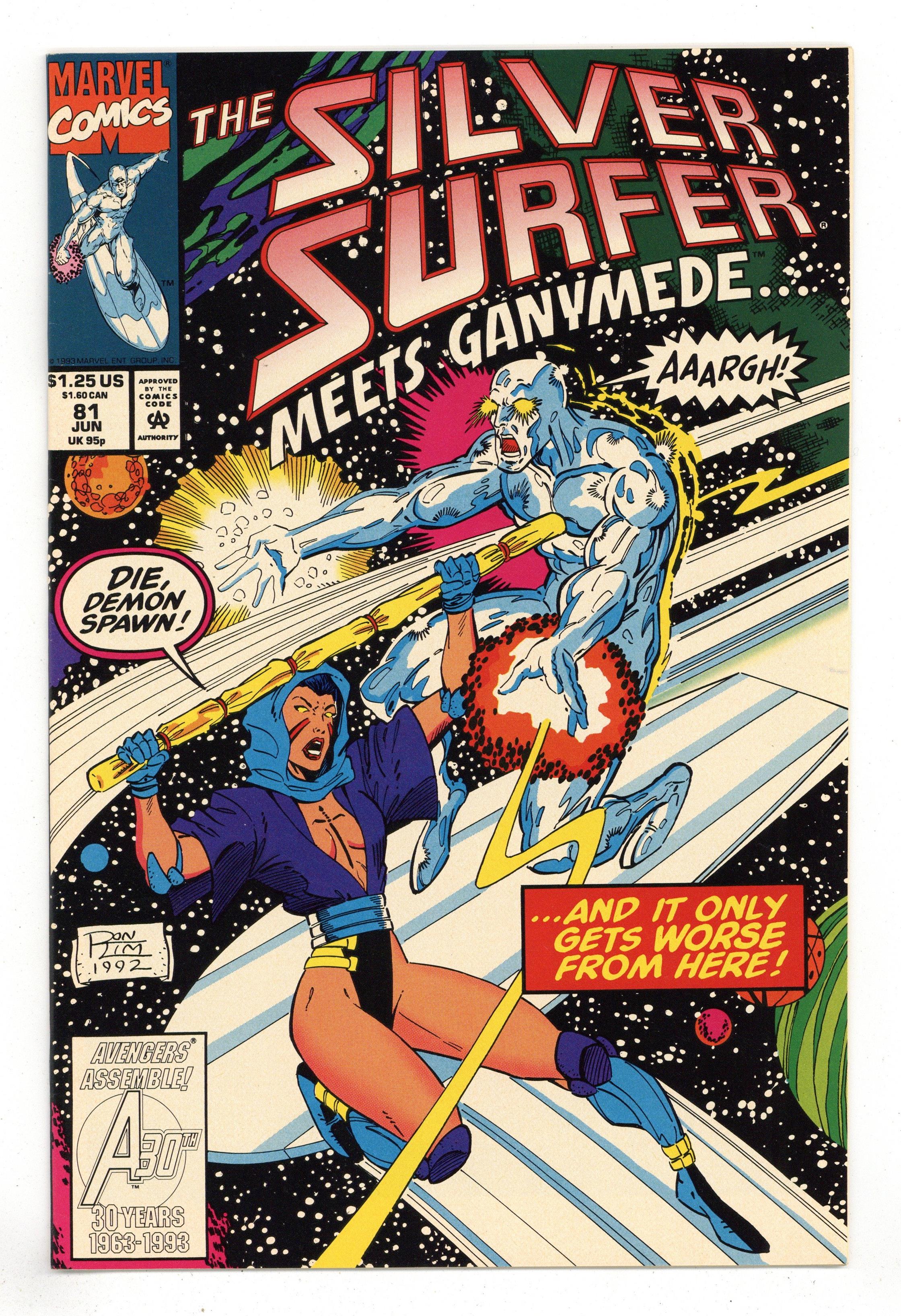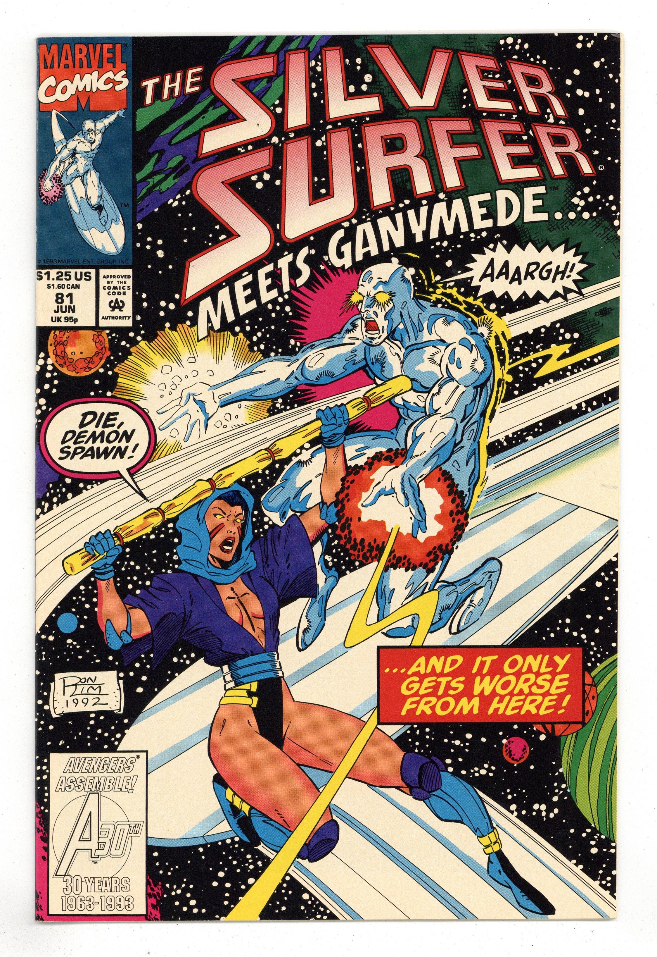 Tags: Silver Surfer$2.65"Tyrant!" Story by Ron Marz. Art by Ron Lim and Tom Christopher. Cameos by Gladiator, Beta Ray Bill, Terrax, Morg, Firelord, Airwalker, and Galactus. The Silver Surfer is attacked by Ganymede, a member of the Spinsterhood, an ancient order of female warriors. This fierce woman-warrior accuses Norrin Radd of being in league with a fiend known as Tyrant. There's just one problem...the Surfer has no idea who Tyrant is. 32 pages. Cover price $1.25.