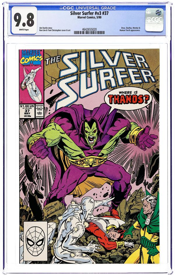 Infinity Gauntlet: Prelude - Rebirth of Thanos: Part 4 of 5 - "A Destructive Encounter!" Guest-starring Starfox and Drax the Destroyer. Story by Jim Starlin. Art by Ron Lim and Tom Christopher. With the threat of Thanos in the universe, the titan Chronos has activated his agent Drax the Destroyer again. However, when Drax was murdered by Moondragon his brain was severely damaged, a condition that has apparently carried over to his resurrection. Can the Silver Surfer reason with the powerhouse and reach the Mad Titan before it's too late? 32 pages. Cover price $1.00.