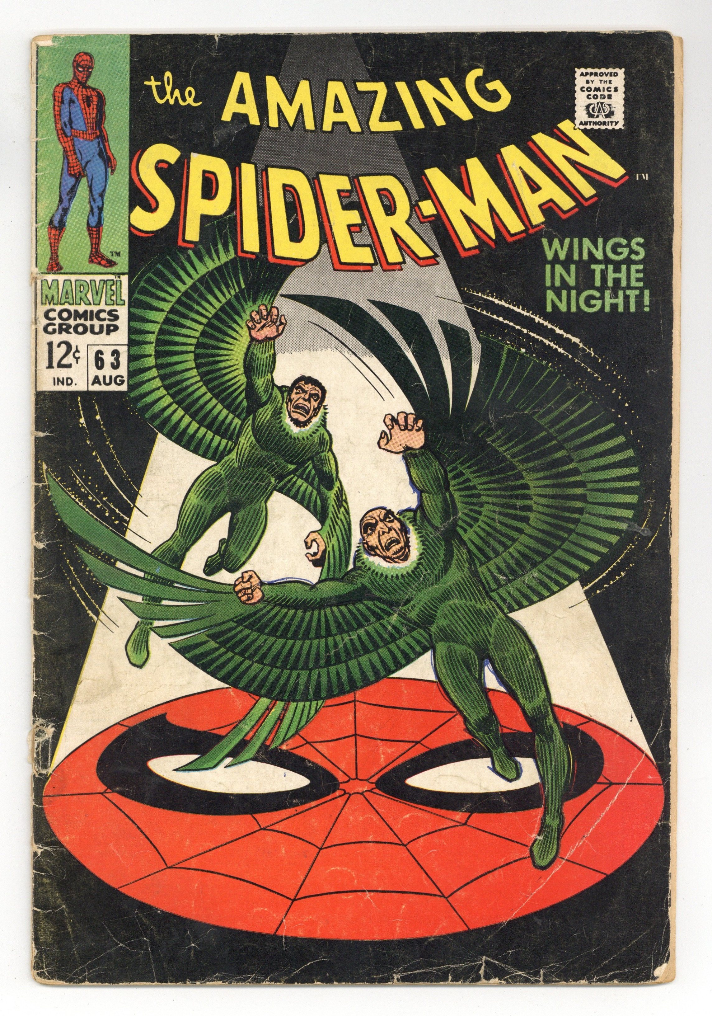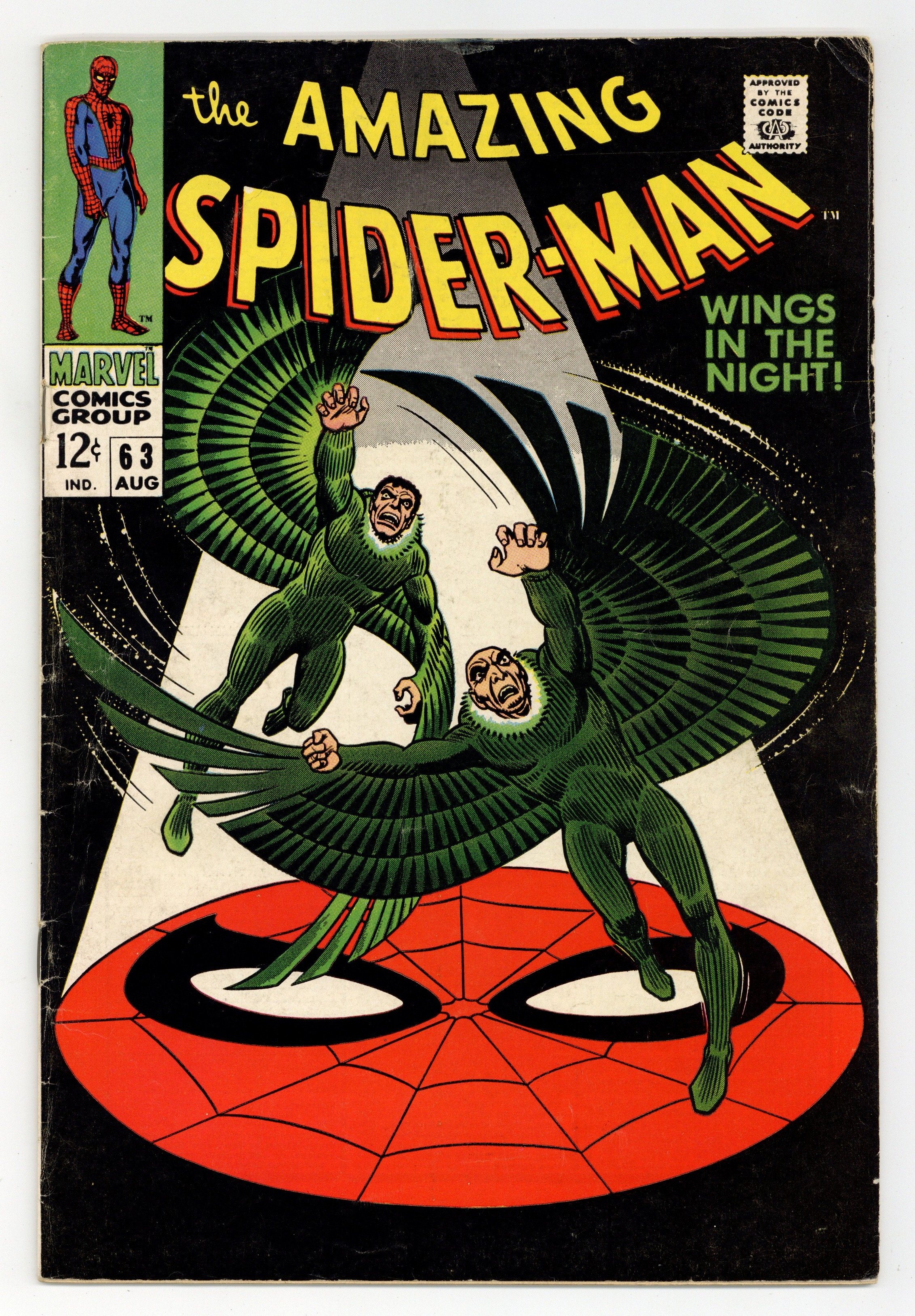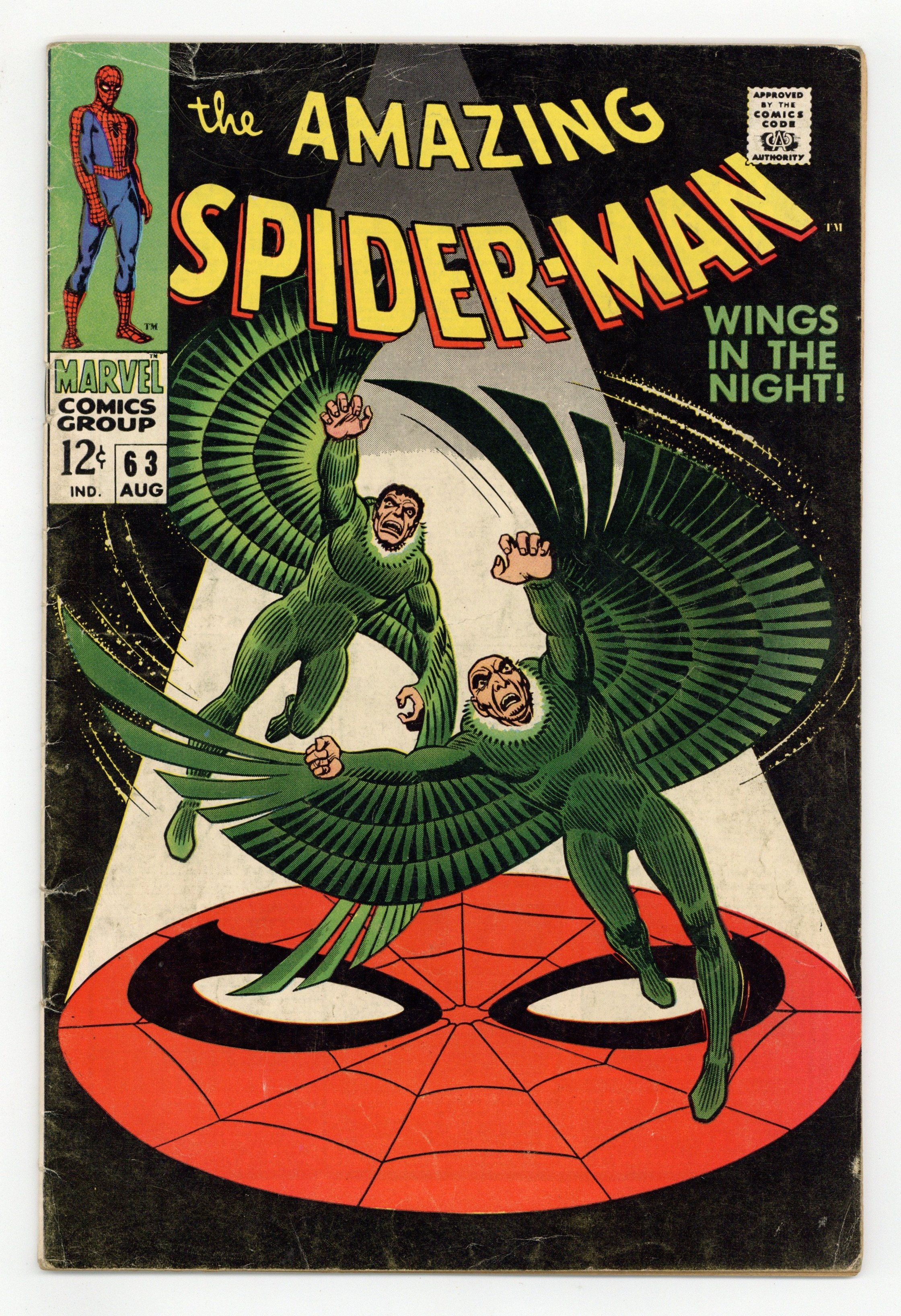 "Wings in the Night!" Part 1 of 2. Script by Stan Lee. Art by John Romita (layouts) and Don Heck (pencils). Inks by Mike Esposito (as Mickey Demeo). Cover by John Romita. Young Mr. Parker is on the outs with Gwen Stacy after the misunderstanding with her father three issues ago. Peter would like to mend fences with his girlfriend, but he has a second problem. Norman Osborn is hallucinating about Spider-Man -- and that could mean really big trouble! In the meantime, the original Vulture has returned! Adrian Toomes did not die in Amazing Spider-Man #48. And surprisingly, the old Vulture wants to team up with the new Vulture (aka Blackie Drago). But Blackie wants nothing to do with Adrian, so the war of the Vultures begins! And the winner gets the Amazing Spider-Man next! Cameo appearances by Harry Osborn, Professor Miles Warren, Captain Stacy, Betty Brant, and J. Jonah Jameson. (Notes: The letters page includes a letter from comics writer Don McGregor. This issue was reprinted in Marvel Tales #46.) 36 pages. Cover price $0.12.