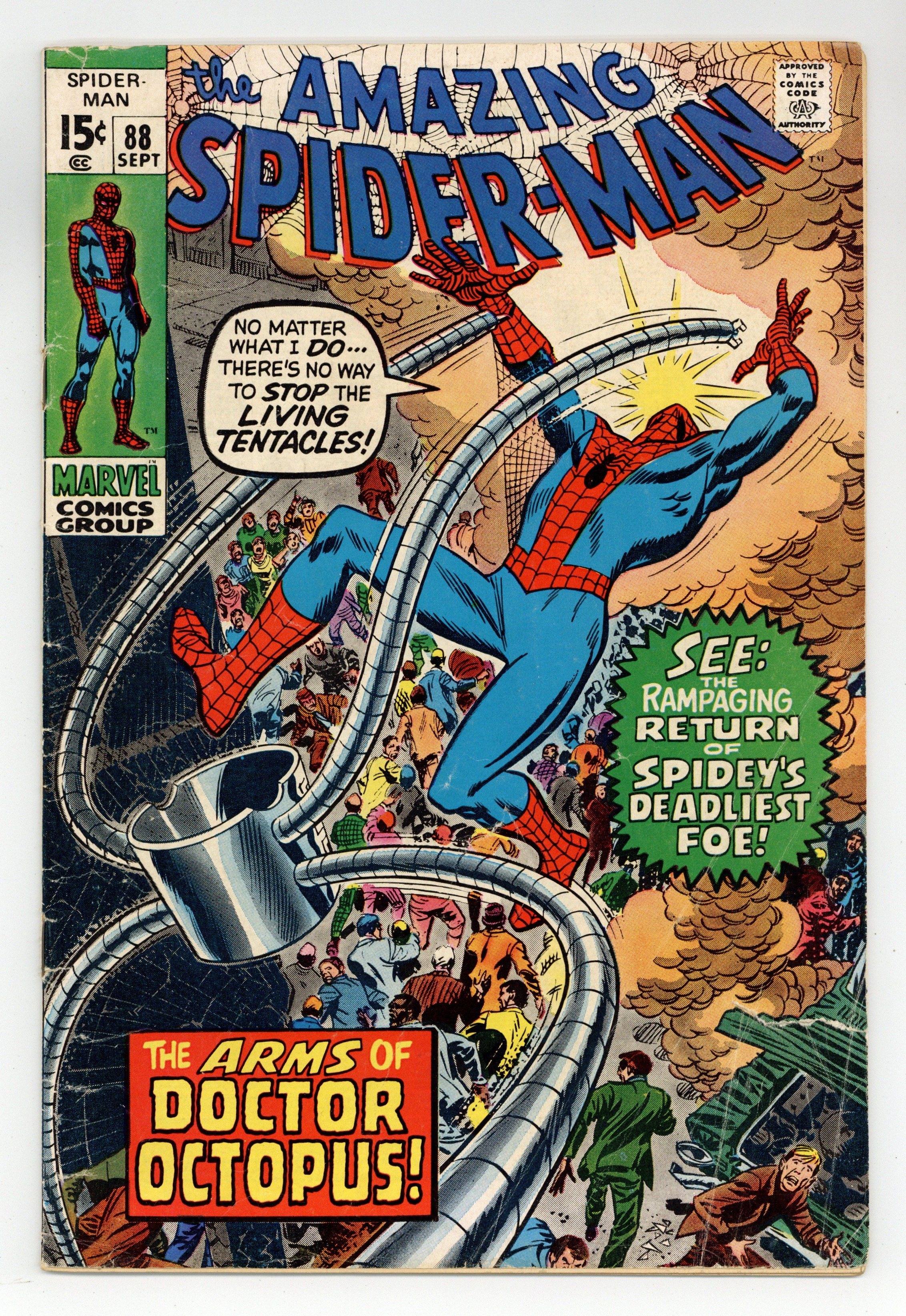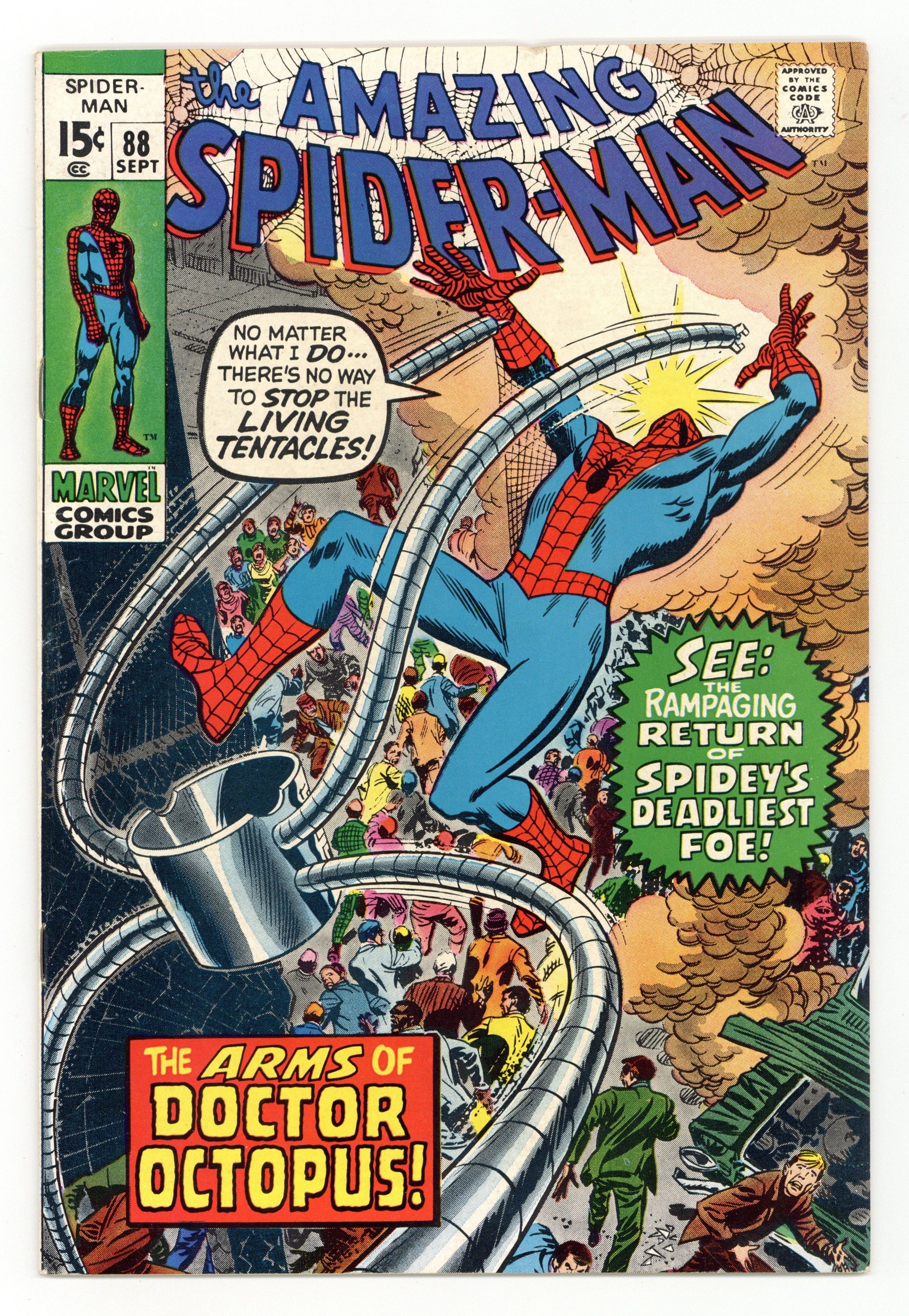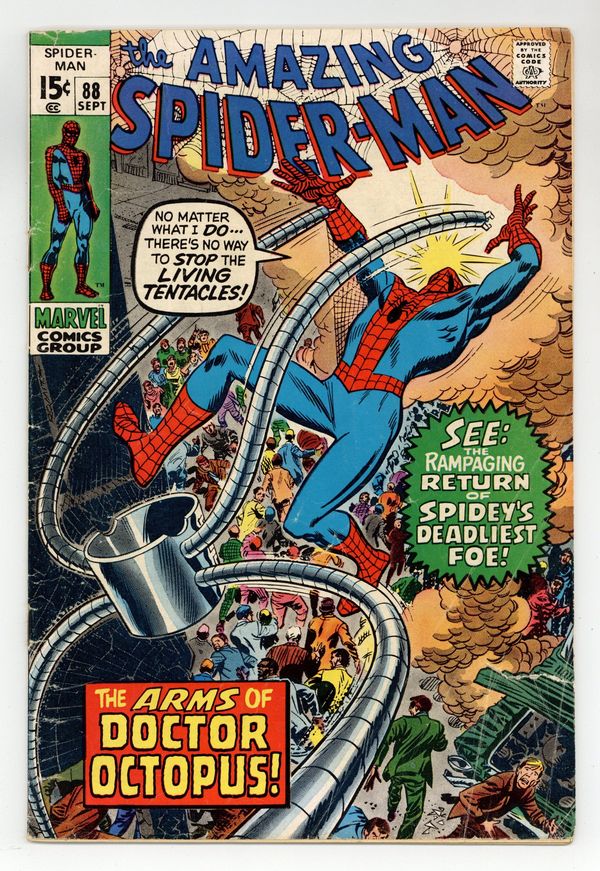 "The Arms of Doctor Octopus!" Part 1 of 3. Script by Stan Lee. Pencils by John Romita. Inks by Jim Mooney. Cover by John Romita. The mechanical arms of Dr. Octopus are on display in the New York Museum of Natural Science! And since Doc Ock is in prison a thousand miles away, he is unable to mentally control his arms. Or so everyone thought. Oh no! When Otto Octavius' arms escape from the museum, the police and the wall-crawler attempt to corral them, but they cannot. Eventually, the arms make it allthe way to the Midwest...and free their master! Dr. Octopus is back in business! The six-armed super-villain swiftly resumes his criminal ways by hijacking an airplane and holding it for ransom! And thus setting up a battle on the tarmac vs. your friendly neighborhood Spider-Man! Cameoappearances by Gwen Stacy, Professor Miles Warren, J. Jonah Jameson, John Jameson, Betty Brant, Joe Robertson, and Captain Stacy. (Notes: The web-slinger previously clashed with Doc Ock in Amazing Spider-Man #56. This issue was reprinted in Marvel Tales #69.) 36 pages. Cover price $0.15.