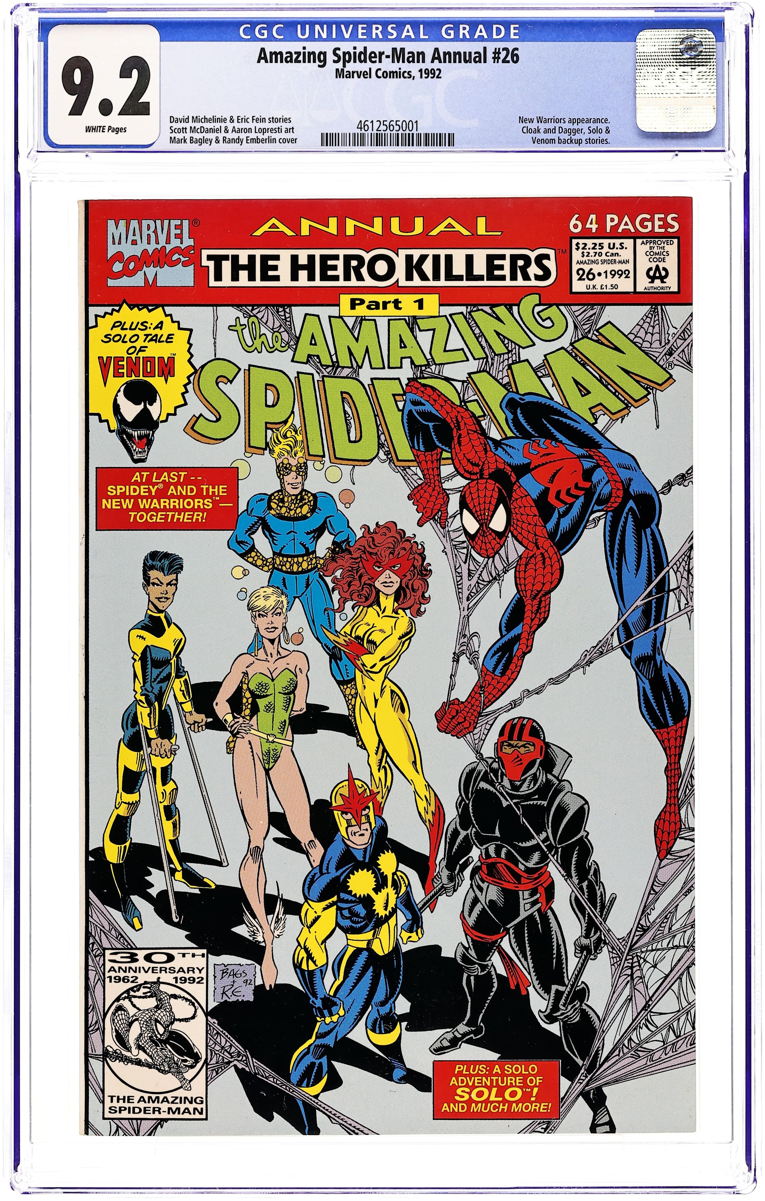 "Fortune and Steel" Guest-starring the New Warriors. Part 1 of the Hero Killers. Script by David Michelinie. Pencils by Scott McDaniel. Inks by Keith Williams. Cover by Mark Bagley and Randy Emberlin. Acting on separate tips; the web-slinger, Nova, Night Thrasher, and Namorita converge on Fortune, New Jersey to stop a potential catastrophe! A shadowy organization called Target Technologies plans to test a wave cannon on the city's population! But fortunately after wading through several henchmen, the heroes disable the powerful weapon and prevent the disaster! Later that night the web-slinger, Nova, and Namorita infiltrate Target Technologies' headquarters complex! But this time more formidable foes await: the Dreadnoughts! It's going to be a long night for the New Warriors and your friendly neighborhood Spider-Man! Story continues in Spectacular Spider-Man Annual 12. Cameo appearances by Justin Hammer, Speedball, Auric, Silver, and the Sphinx. First backup story: "First Kill!" Part 1 of 3. Script by David Michelinie. Art by Sal Buscema. Pencils by Aaron Lopresti. Inks by Bruce Jones. Venom meets the alien symbiote for the first time. Story continues in Spectacular Spider-Man Annual 12. Second backup story: "The Wronged Man" Script by Eric Fein. Pencils by Scott Koling. Inks by Sam de la Rosa. Solo battles terrorists in Italy. Third backup story: "Making the Grade" Script by Tom Brevoort and Mike Kanterovich. Art by Aaron Lopresti. The wall-crawler chats up the Looter about his many past foes. Fourth backup story: "Now Strikes the Lightmaster!" Part 1 of Evil's Light. Script by Eric Fein. Pencils by Vince Evans. Inks by Don Hudson. The Lightmaster battles Cloak and kidnaps Dagger. Story continues in Spectacular Spider-Man Annual 12. (Note: Splash page art by Scott McDaniel and Keith Williams.) 68 pages. Cover price $2.25.