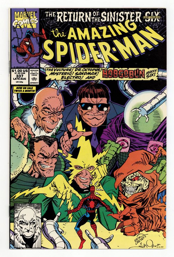 Tags: Marvel Legacy Numbering: Amazing Spider-Man (part 337), Spider-Man Sinister 6 Return (part 4)$12.00Direct Edition. "Rites and Wrongs!" The Return of the Sinister Six Part 4 of 6. Script by David Michelinie. Pencils by Erik Larsen. Inks by Terry Austin. Cover by Erik Larsen and Walt Simonson. The cover says it all: Six vs. One! The Sinister Six vs. the one and only Amazing Spider-Man! After assembling his sinister sextet, Doc Ock puts his diabolic plan into motion! Otto Octavius wants to sabotage the launch of Cordco's new space satellite! And use the satellite to spray a deadly poison over the entire planet! But the experimental ley line satellite is being sponsored by Empire State University! More specifically by the physics department with a graduate research assistant named Peter Parker! Will the web-slinger connect the dots in time? The countdown is on! Cameo appearances by Mary Jane Watson, Aunt May, Jonathan Caesar, Nova, Wolverine, Flash Thompson, and the Black Cat. (Note: The first issue of Spider-Man (1990) -- the fourth Spider-Man title at the time -- was also published this month.) 36 pages. $1.00 cover price. Cover price $1.00.