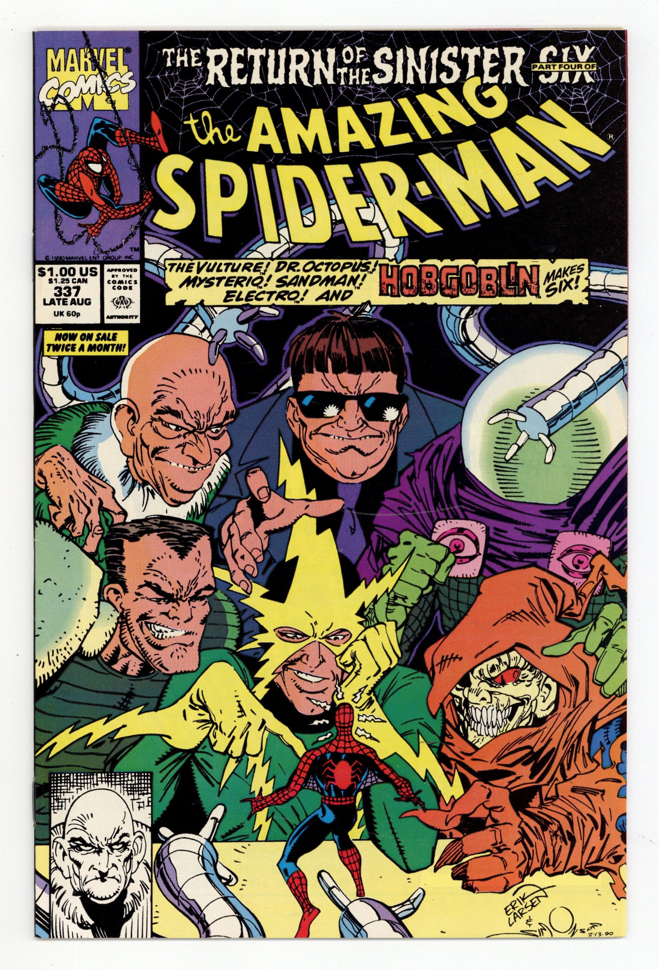 Direct Edition. "Rites and Wrongs!" The Return of the Sinister Six Part 4 of 6. Script by David Michelinie. Pencils by Erik Larsen. Inks by Terry Austin. Cover by Erik Larsen and Walt Simonson. The cover says it all: Six vs. One! The Sinister Six vs. the one and only Amazing Spider-Man! After assembling his sinister sextet, Doc Ock puts his diabolic plan into motion! Otto Octavius wants to sabotage the launch of Cordco's new space satellite! And use the satellite to spray a deadly poison over the entire planet! But the experimental ley line satellite is being sponsored by Empire State University! More specifically by the physics department with a graduate research assistant named Peter Parker! Will the web-slinger connect the dots in time? The countdown is on! Cameo appearances by Mary Jane Watson, Aunt May, Jonathan Caesar, Nova, Wolverine, Flash Thompson, and the Black Cat. (Note: The first issue of Spider-Man (1990) -- the fourth Spider-Man title at the time -- was also published this month.) 36 pages. $1.00 cover price. Cover price $1.00.