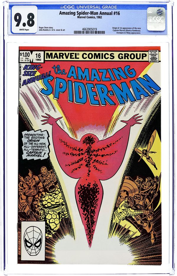 Ends Nov 10 7:16 PM CST Bid History 8 bids Current Bid $44 Your Secret Max Bid If you'd like to bid, please log in or register. Direct Edition. "Who's That Lady?" First appearance of the second Captain Marvel, Monica Rambeau. Guest-starring the Avengers and the Thing. Script by Roger Stern. Art by John Romita Jr. (breakdowns) and John Romita Sr. (finishes). Cover by John Romita Jr. and John Romita Sr. It's the dazzling debut of the new Captain Marvel (aka Monica Rambeau)! After gaining her powers in a freak accident on an offshore oil rig, the New Orleans native needs help controlling her awesome new abilities! Monica travels to New York City in hopes of finding the Fantastic Four! But she bumps into the Spectacular Spider-Man first! After eluding the web-slinger, Captain Marvel zooms to the Baxter Building! However, Ben Grimm can only offer moral support, so he sends the distressed captain to Avengers Mansion! Once there Shell-head and the Wasp attempt to stabilize Captain Marvel's runaway powers, but the wall-crawler inadvertently interferes! Is the new Captain Marvel's superhero career going to be over...before it even starts? Cameo appearances by Harry Osborn and Liz (Allan) Osborn. Avengers Lineup: Captain America, Hawkeye, Iron Man, She-Hulk, Thor, and the Wasp. First backup feature: "The Many Loves of Peter Parker" One-page breakdown of the various loves of Peter Parker's life. Second backup feature: "The Daily Bugle" One-page illustration of the cast of characters at the Daily Bugle. (Note: Captain Marvel appears next in Avengers 227.) 52 pages. Cover price $1.00.