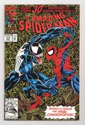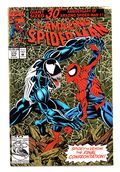 Direct Edition. 30th Anniversary issue of Amazing Spiderman #1. "The Bride of Venom" Part 2 of 2. Script by David Michelinie. Pencils by Mark Bagley. Inks by Randy Emberlin. Gold foil holografix cover by Mark Bagley and Randy Emberlin. Inside an abandoned Brooklyn amusement park, the Lethal Protector holds Richard and Mary Parker captive! The disturbed Venom thinks he's just doing what's best for Peter's parents! But that's not going to work! No way, no how! So, the wall-crawler heads to the park knowing a fierce fight awaits! However, the web-slinger may have help this time from a very unlikely source... Eddie Brock's ex-wife! Wow, will there be a family reunion atop the Ferris wheel? Or perhaps a funeral beneath it? One way or another, the Amazing Spider-Man and Venom battle for the last time! Cameo appearances by Silver Sable, Battlestar, Mary Jane Watson, and J. Jonah Jameson. Second story: "True Friends!" Script by Tom DeFalco. Pencils by Patrick Olliffee. Inks by Mark McKenna. Aware of what the Human Torch did to Empire State University, Spider-Man vows to bring his friend to justice. Cameo appearance by Silver Sable. Plot crosses over with Fantastic Four 373 & 374. Third story: "The Monster Within" Script by Eric Fein. Art by Dan Panosian. JJJ tries to get his son, John Jameson, started in the field of journalism. Fourth story: "Echoes..." Script by Terry Kavanagh. Pencils by Aaron Lopresti. Inks by Don Hudson. The Chameleon visits the grave of Kraven the Hunter. (Notes: Venom appears next in the first issue of his Lethal Protector (1993) series. The letters page includes a statement of ownership: average print run 660,958. average paid circulation 544,900.) 68 pages. Cover price $3.95.