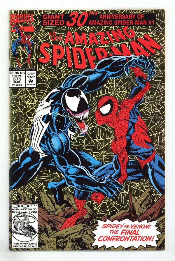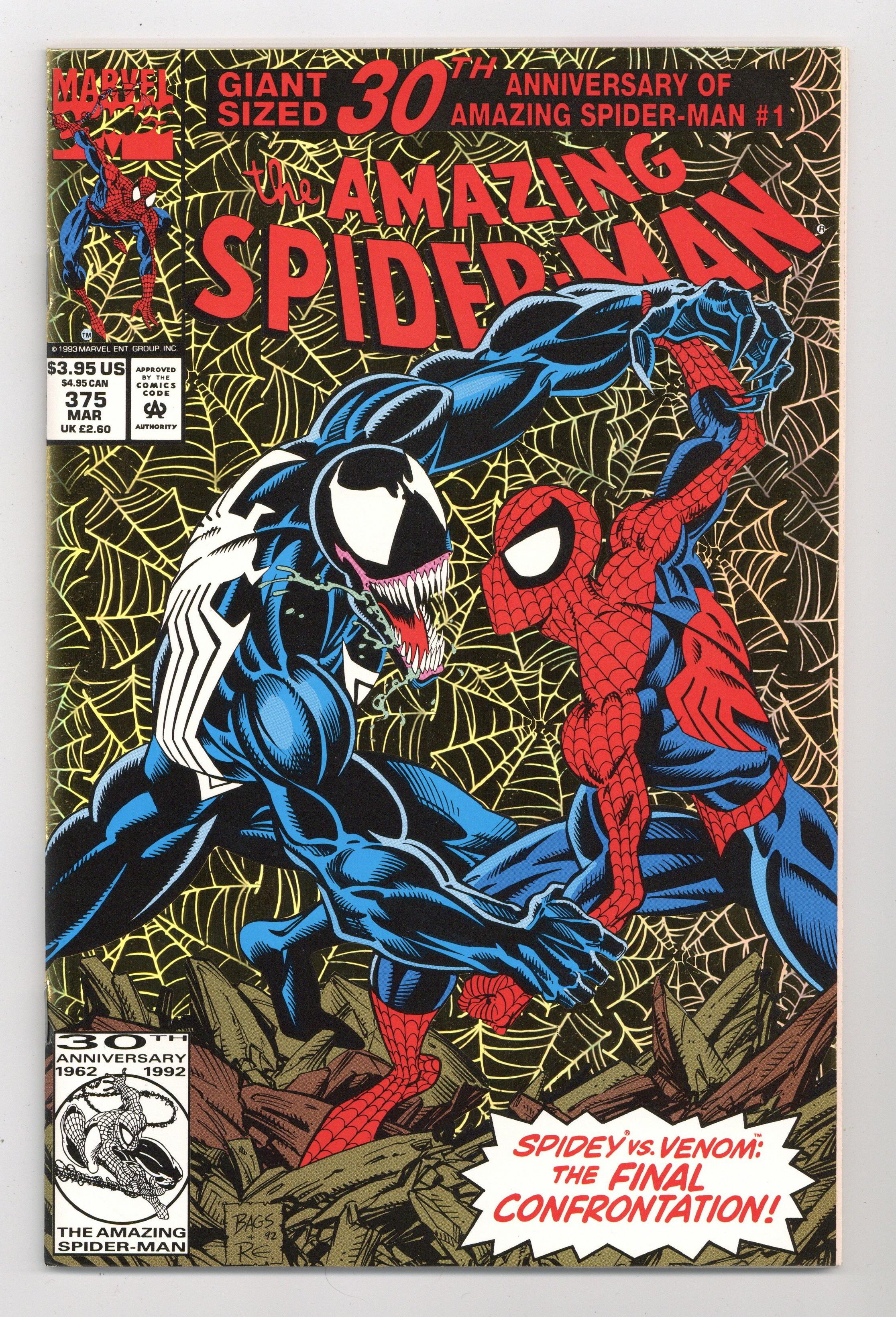 Tags: Marvel Legacy Numbering: Amazing Spider-Man (part 375), Print Run Statistics$9.00Direct Edition. 30th Anniversary issue of Amazing Spiderman #1. "The Bride of Venom" Part 2 of 2. Script by David Michelinie. Pencils by Mark Bagley. Inks by Randy Emberlin. Gold foil holografix cover by Mark Bagley and Randy Emberlin. Inside an abandoned Brooklyn amusement park, the Lethal Protector holds Richard and Mary Parker captive! The disturbed Venom thinks he's just doing what's best for Peter's parents! But that's not going to work! No way, no how! So, the wall-crawler heads to the park knowing a fierce fight awaits! However, the web-slinger may have help this time from a very unlikely source... Eddie Brock's ex-wife! Wow, will there be a family reunion atop the Ferris wheel? Or perhaps a funeral beneath it? One way or another, the Amazing Spider-Man and Venom battle for the last time! Cameo appearances by Silver Sable, Battlestar, Mary Jane Watson, and J. Jonah Jameson. Second story: "True Friends!" Script by Tom DeFalco. Pencils by Patrick Olliffee. Inks by Mark McKenna. Aware of what the Human Torch did to Empire State University, Spider-Man vows to bring his friend to justice. Cameo appearance by Silver Sable. Plot crosses over with Fantastic Four 373 & 374. Third story: "The Monster Within" Script by Eric Fein. Art by Dan Panosian. JJJ tries to get his son, John Jameson, started in the field of journalism. Fourth story: "Echoes..." Script by Terry Kavanagh. Pencils by Aaron Lopresti. Inks by Don Hudson. The Chameleon visits the grave of Kraven the Hunter. (Notes: Venom appears next in the first issue of his Lethal Protector (1993) series. The letters page includes a statement of ownership: average print run 660,958. average paid circulation 544,900.) 68 pages. Cover price $3.95.