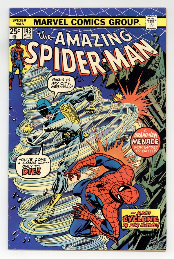 Tags: Marvel Legacy Numbering: Amazing Spider-Man (part 143), Spider-Man Clone Saga (part 00C)$24.00"...And the Wind Cries: Cyclone!" Part 1 of 2. Script by Gerry Conway. Pencils by Ross Andru. Inks by Frank Giacoia and Dave Hunt (backgrounds). Cover by Gil Kane and John Romita. The irrepressible J. Jonah Jameson has been kidnapped in the City of Lights! So Joe Robertson and Peter Parker rush to Paris, France to rescue their boss! The treacherous search for the Daily Bugle publisher leads from the Place Vendôme to the Arc de Triomphe to the Eiffel Tower! Where the Amazing Spider-Man clashes with a new international adversary: The Cyclone! The whirlwind-like villain boasts that he has Jonah! And also, that the web-slinger better meet the ransom demands…or face his own Waterloo! First appearance of the Cyclone. Cameo appearances by Mary Jane Watson, Betty Brant, Flash Thompson, Liz Allan, Professor Miles Warren, and the Gwen Stacy clone. Flashback cameo by Mysterio. (Notes: This issue features the memorable first kiss between Peter and Mary Jane at Kennedy Airport. The letters page includes a letter from comics publisher Dean Mullaney. Giant-Size Spider-Man 4 featuring the third appearance of the Punisher was also published this month. This story was reprinted in Marvel Tales 120.) 36 pages. 25c cover price. Cover price $0.25.