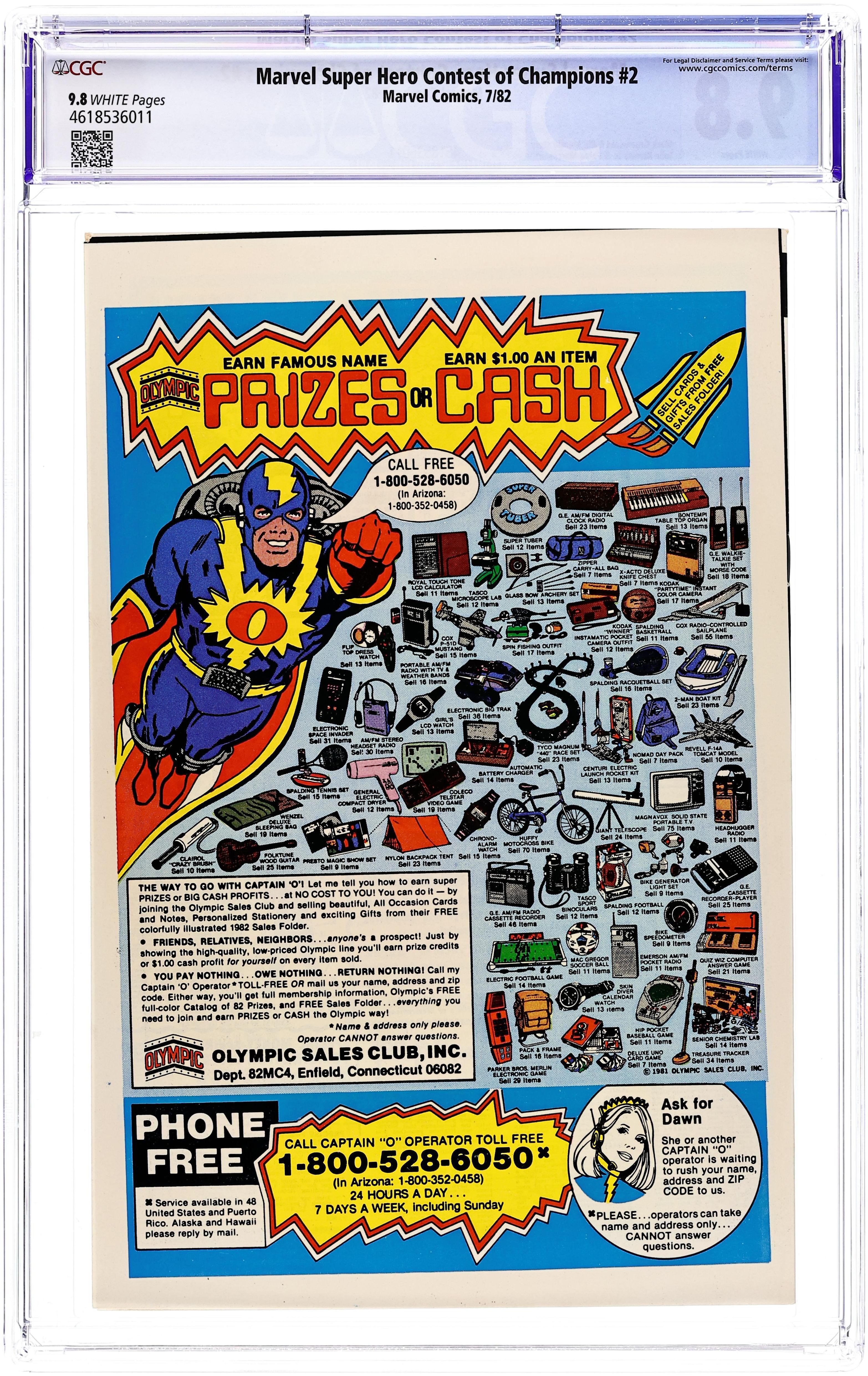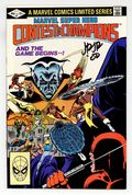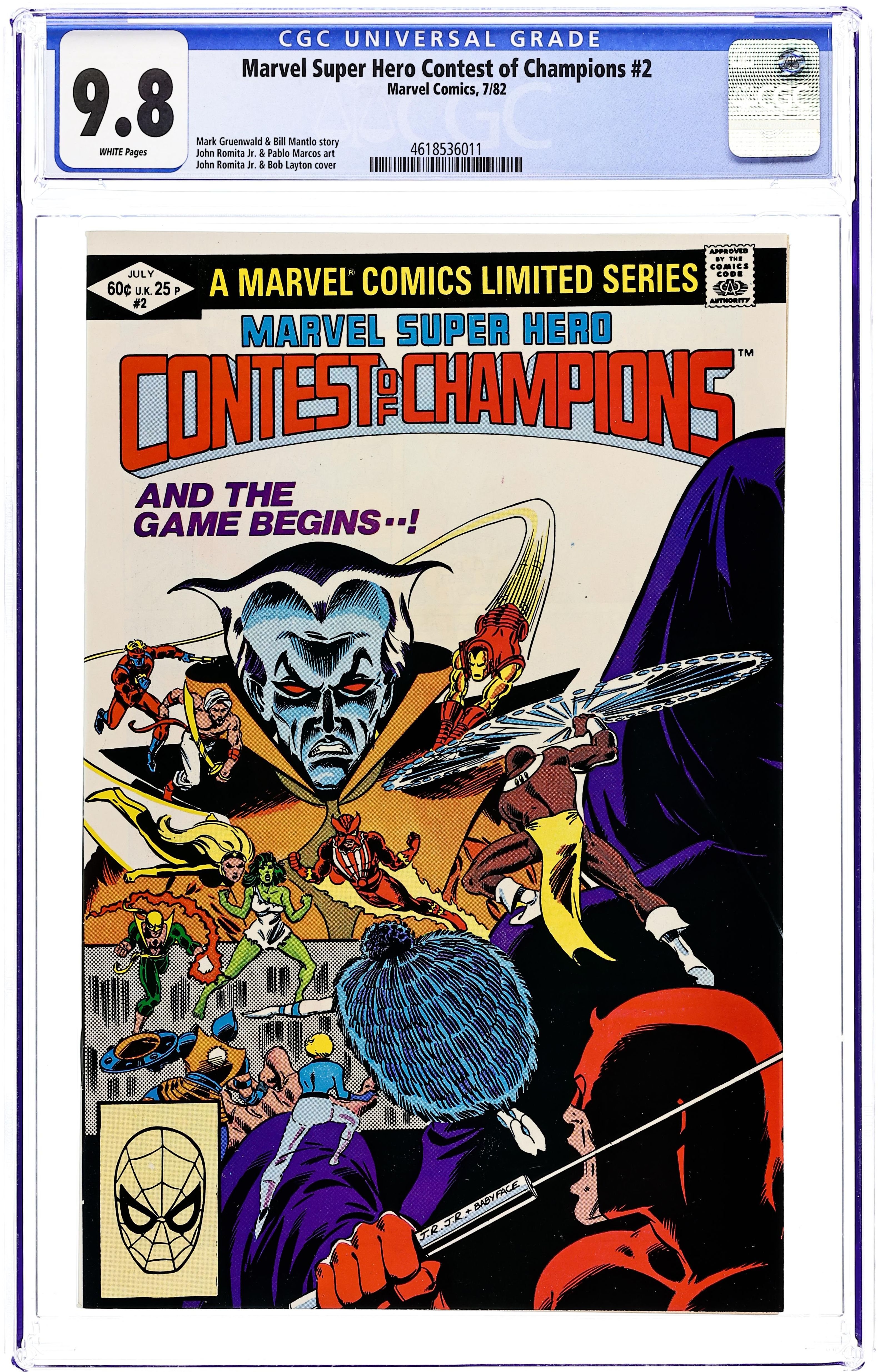 Direct Edition. "Chapter 2: Frenzy in the Frozen North!" Story by Mark Gruenwald, Bill Mantlo, and Steven Grant. Art by John Romita, Jr. and Pablo Marcos. Cover by John Romita, Jr. and Bob Layton. The first battle of the contest of champions takes place at the North Pole and pits the Invisible Girl, Iron Fist, and Sunfire against Daredevil, Darkstar, and Talisman. Daredevil captures the first piece of the golden globe and wins round one for the Grandmaster! "Chapter 3: Ghost Town Showdown" The second battle is set in an old west ghost town. Iron Man, Sabra, and the Arabian Knight fight Captain Britain, Defensor, and the She-Hulk for the golden globe. This time one of Death's champions, the Arabian Knight, finds the globe. After two rounds the score is tied. (Note: The last two pages continue the index listing of each Marvel super hero.) 32 pages. Cover price $0.60.