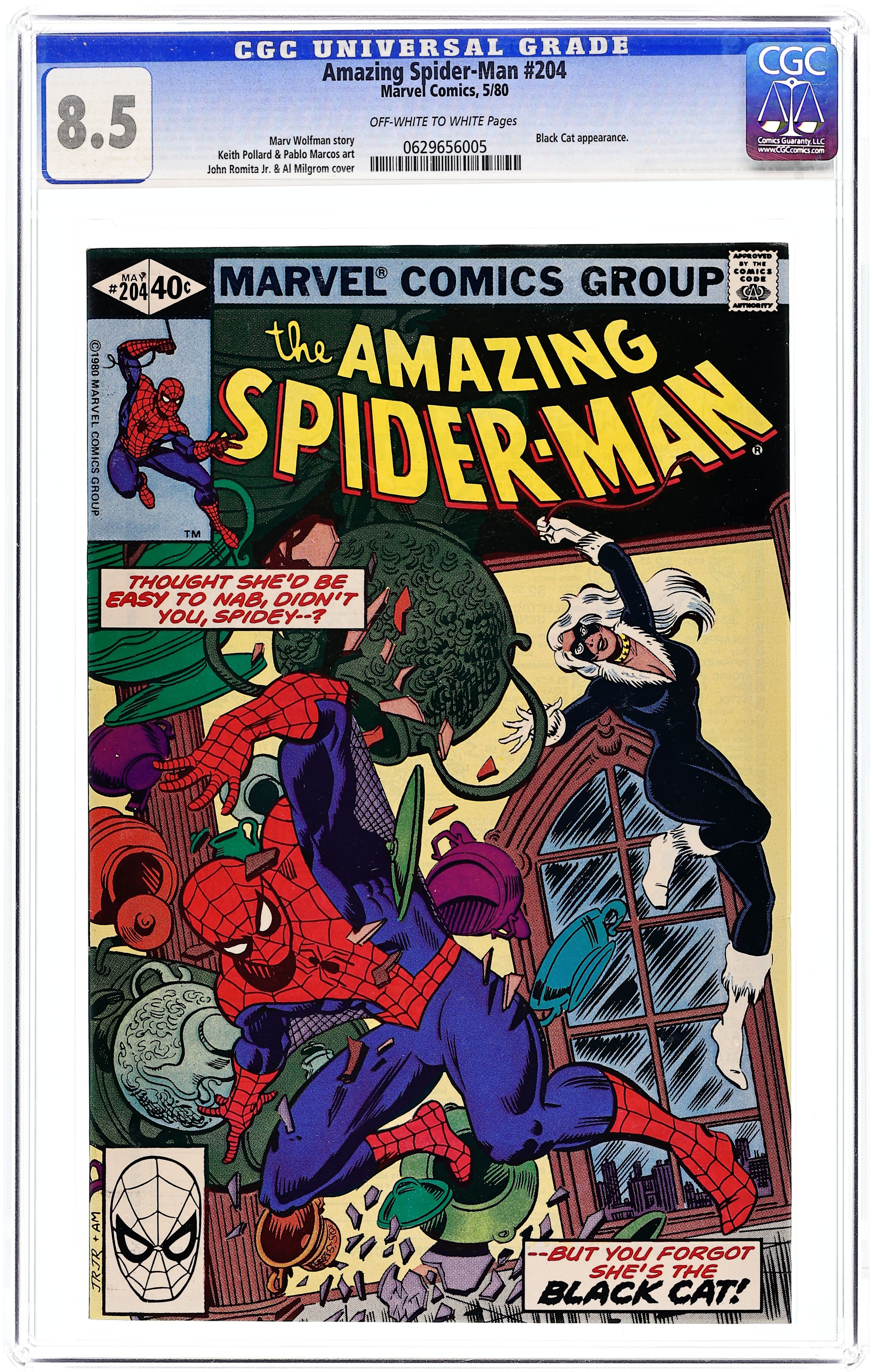 Direct Edition. "The Black Cat Always Lands on Her Feet!" Part 1 of 2. Script by Marv Wolfman. Art by Keith Pollard (layouts) and Pablo Marcos (finishes). Cover by John Romita Jr. and Al Milgrom. The web-slinger's favorite feline is back! The Black Cat! Apparently she survived her fall at the end of Amazing Spider-Man 195 and has now developed a new interest in collecting (actually stealing) famous romantic artifacts! The location of her first heist will be Frank Lloyd Wrights architectural masterpiece: the Guggenheim Museum! But that will also be the site of her first reunion with the Spectacular Spider-Man! The (cat) fur is going to fly! Cameo appearances by Dr. Jonas Harrow, J. Jonah Jameson, Joe Robertson, and Flash Thompson. (Notes: This issue completes Marv Wolfman's outstanding 2-year run as the writer of the Amazing Spider-Man title. This two-part story was reprinted in the trade paperback: Spider-Man vs. the Black Cat (2005).) 36 pages. Cover price $0.40.