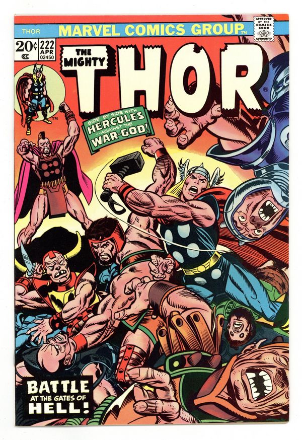 $15.50Last 20-cent cover price. Cover by Gil Kane and John Romita (alterations). "Before the Gates of Hell!", script by Gerry Conway, pencils by John Buscema, inks by Joe Sinnott; Thor and Hercules are having an arm wrestling match to determine who will face Pluto, when Zeus interrupts and tells them to fight together; They travel together to the gates of Hades and are attacked by Pluto's minions; They defeat the minions, then go to visit Chaga, to learn who it is that's against them; She tells them that it's Pluto and Ares; They fly to the gates of Hell and there meet Ares, whose power has been increased by Pluto. They manage to defeat him and then they enter Hell. Appearances by Sif, Hildegarde, and Odin. The letters page contains Marvel Value Stamp series A #41 (The Gladiator). 36 pgs., full color. $0.20. Cover price $0.20.