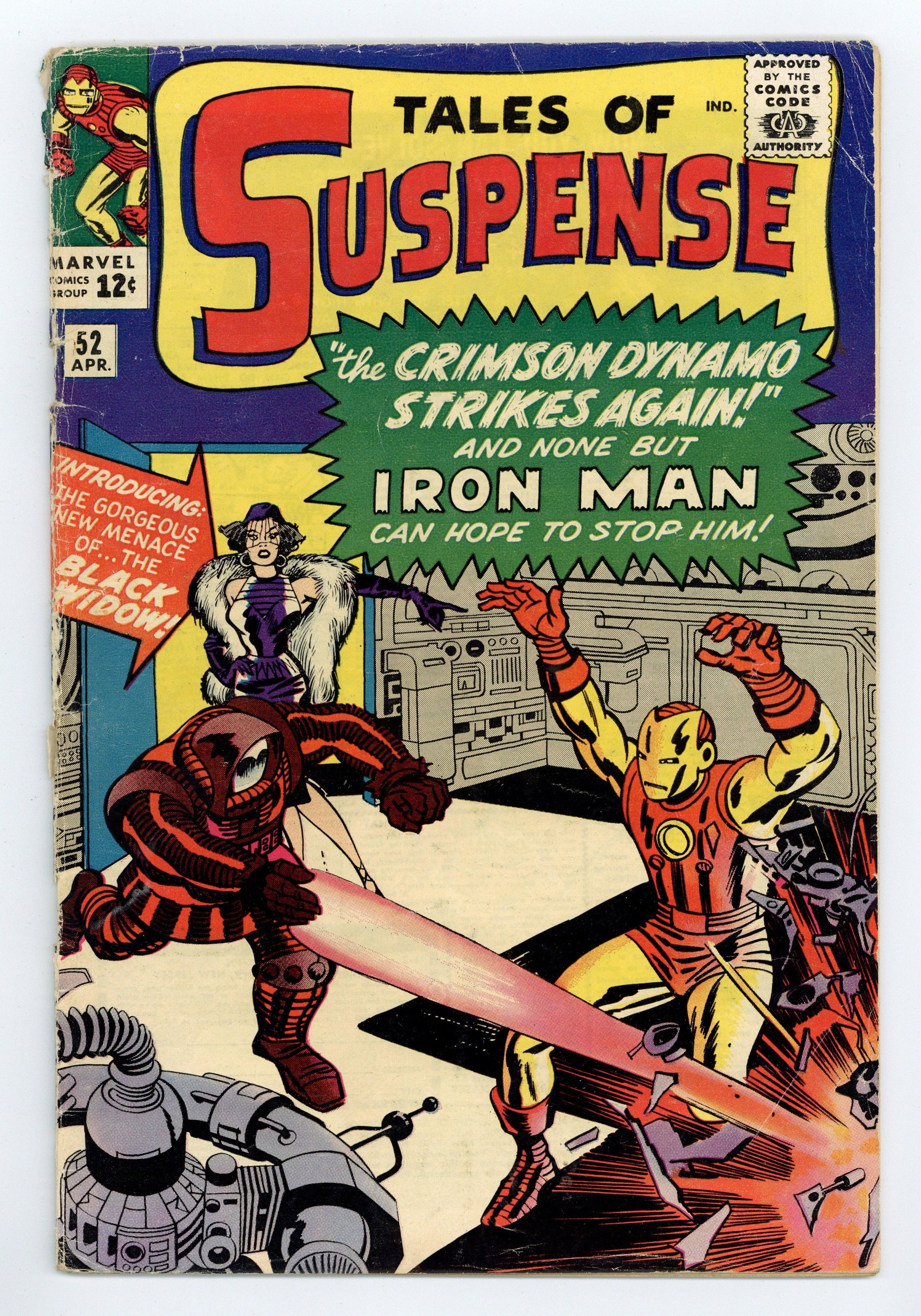 Cover pencils by Jack Kirby, inks by Paul Reinman. First appearance of the Black Widow in "The Crimson Dynamo Strikes Again!", script by Stan Lee (plot) and Don Rico (as N. Korok), art by Don Heck; The Black Widow and Boris are sent to America to kill Anton Vanko, the Crimson Dynamo, for defecting to America; They are also tasked with killing both Iron Man and Tony Stark. The first half of "The Magician" text story. "The Seance!", script by Stan Lee (plot) and Larry Lieber, pencils by Larry Lieber, inks by Chic Stone; A fake medium uses special effects to simulate supernatural powers, but he is taken into the spirit world by real ghosts as punishment. "The Failure!", script by Stan Lee (plot) and Larry Lieber (script), pencils by Larry Lieber, inks by Paul Reinman; The Earth of the future is overwhelmingly materialistic, except for one idealistic young man and his lover; They are abducted by aliens, who have determined that he is the best suited to be absolute ruler of their empire. This issue includes a statement of ownership - average print run, 318,932; average paid circulation, 188,005. 36 pages, full color. Cover price $0.12.