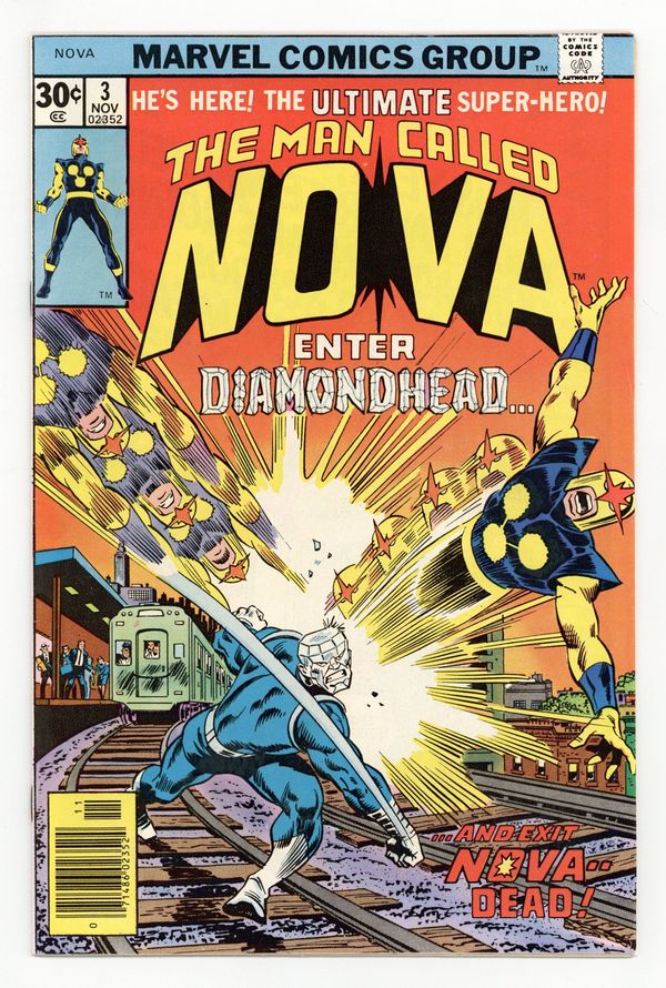"Enter Diamondhead!" Story by Marv Wolfman. Art by Sal Buscema and Tom Palmer. Richard Rider learns that the subtleties of keeping his powers a secret from his friends and family will be harder than he thinks. Plus, Nova discovers a new power, he's bullet proof. And good thing to because now he must confront the nigh unstoppable might of Diamondhead. 32 pages. Cover price $0.30.