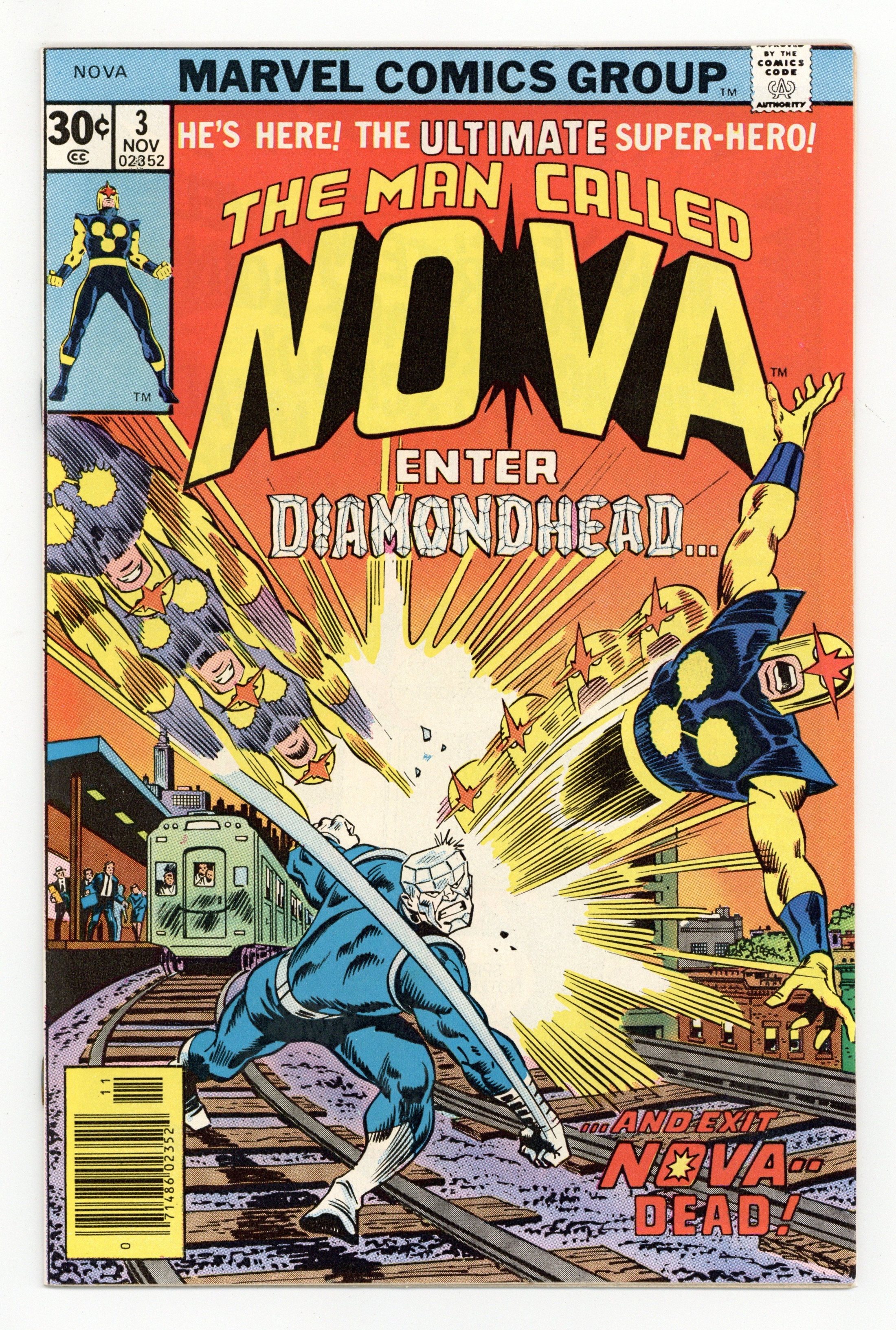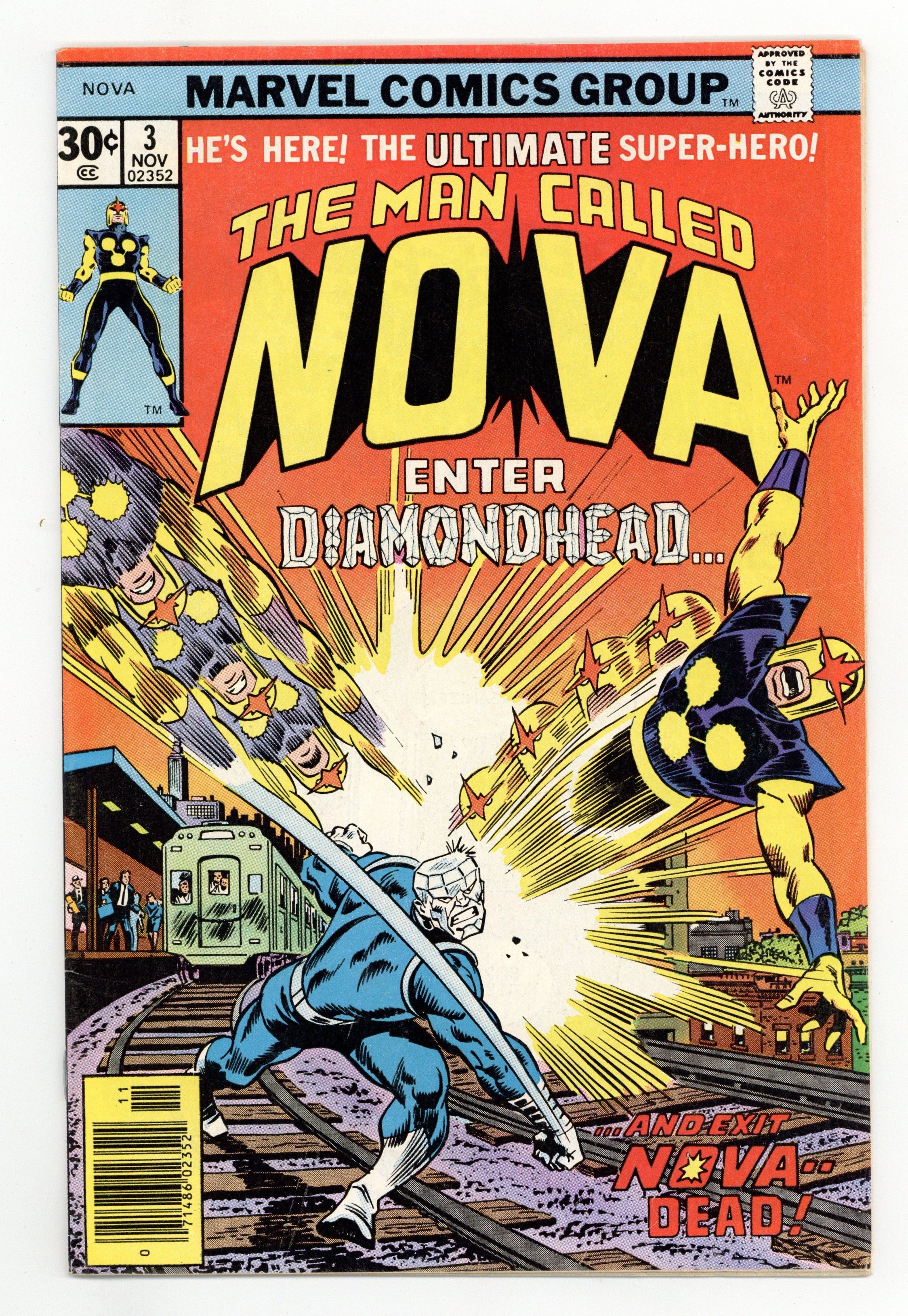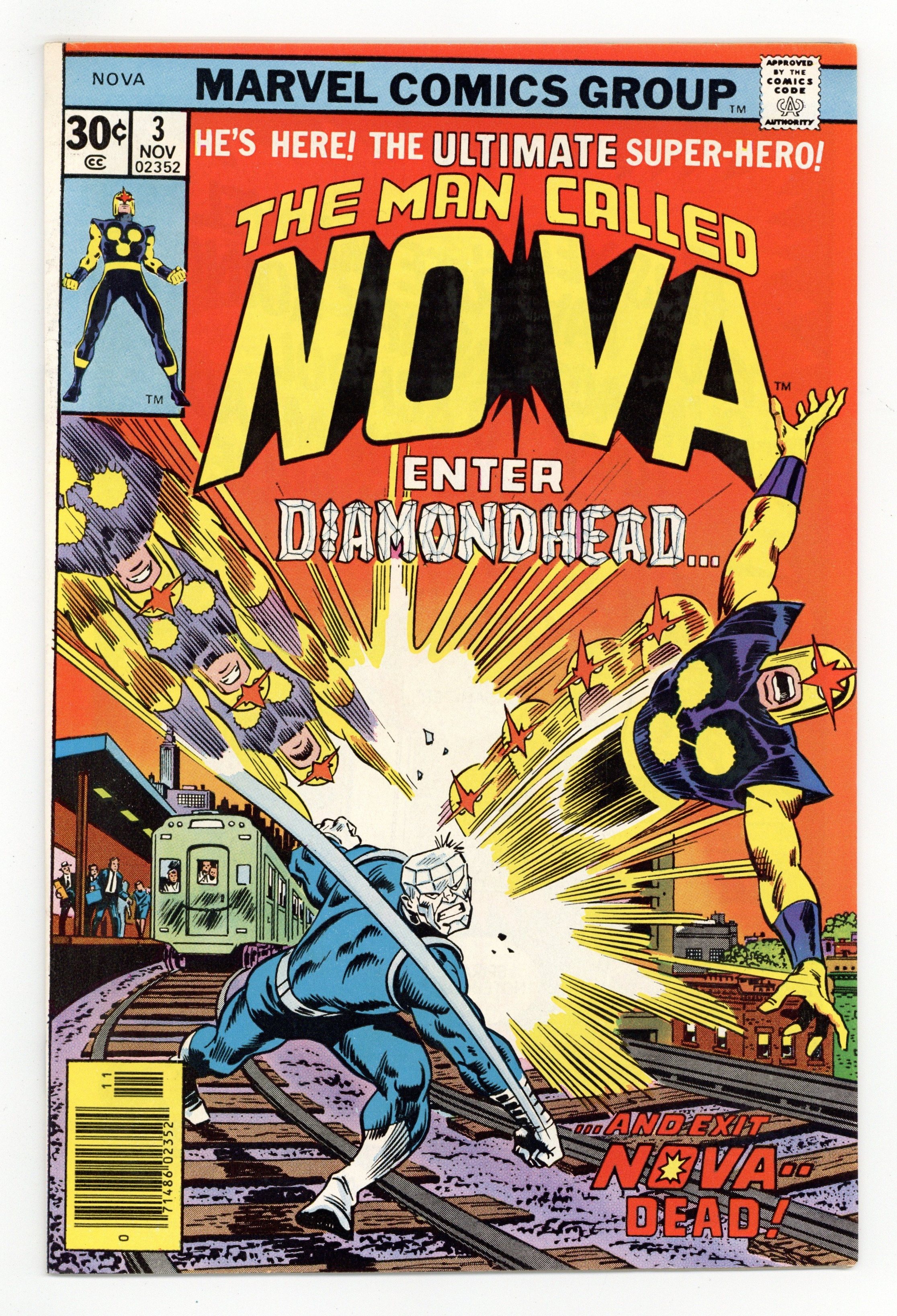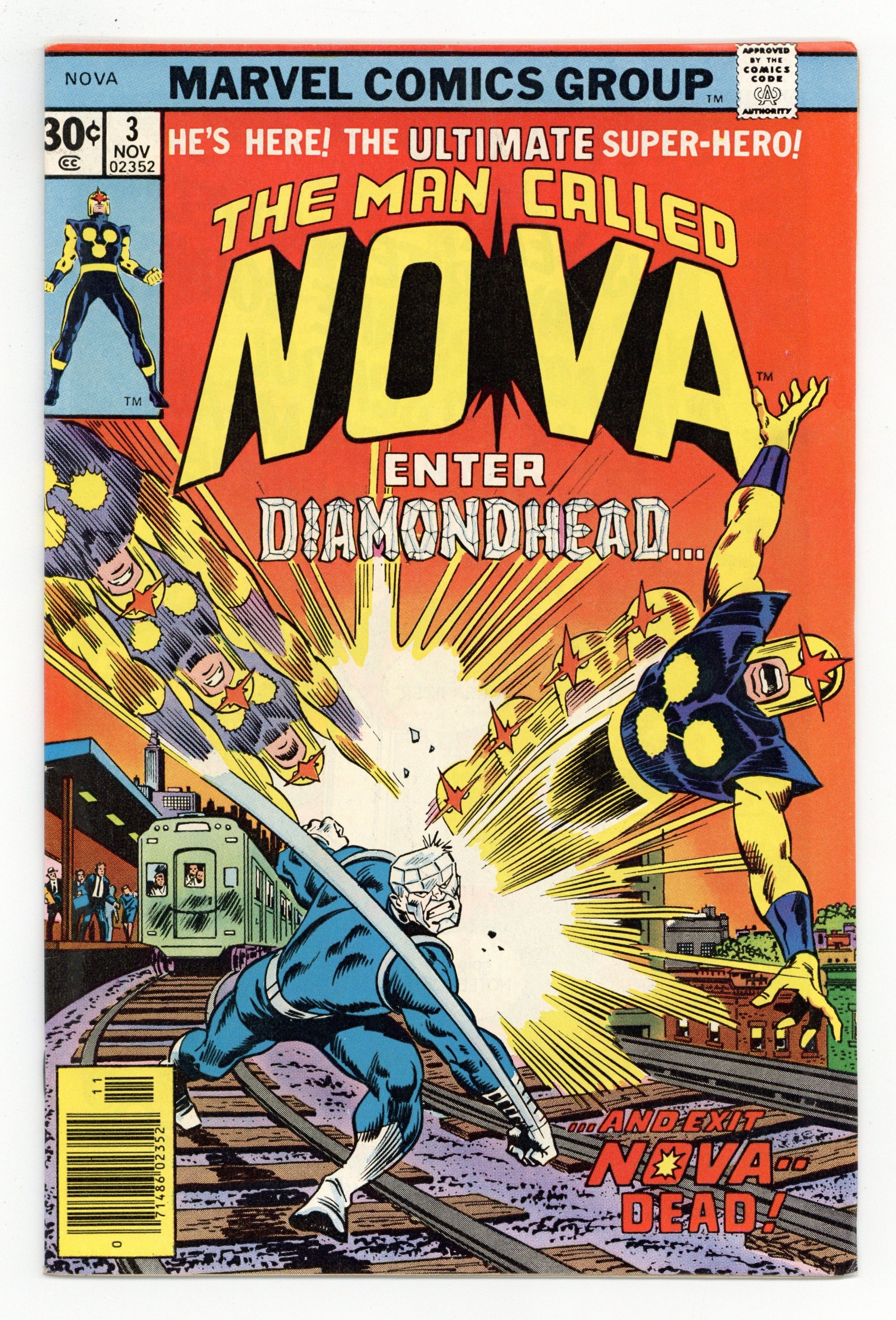 $11.75"Enter Diamondhead!" Story by Marv Wolfman. Art by Sal Buscema and Tom Palmer. Richard Rider learns that the subtleties of keeping his powers a secret from his friends and family will be harder than he thinks. Plus, Nova discovers a new power, he's bullet proof. And good thing to because now he must confront the nigh unstoppable might of Diamondhead. 32 pages. Cover price $0.30.