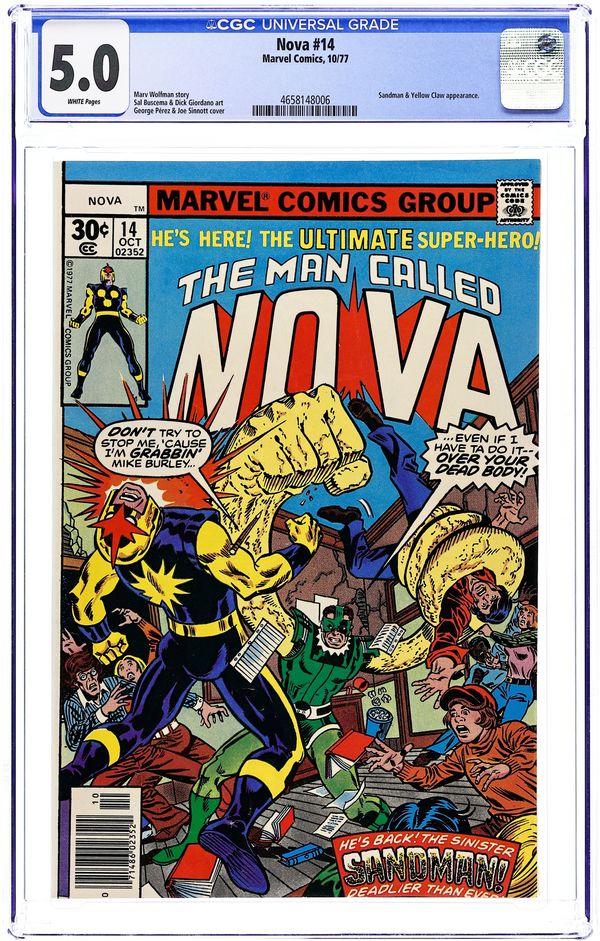 "Massacre at Truman High!" Story by Marv Wolfman. Art by Sal Buscema and Dick Giordano. Cover pencils by George Pérez. Even if Nova can escape the impossible death trap, will he save the one person who has picked on and tormented him his whole life? Will Nova save Mike Burley from the sinister Sandman? 32 pages. Cover price $0.30.