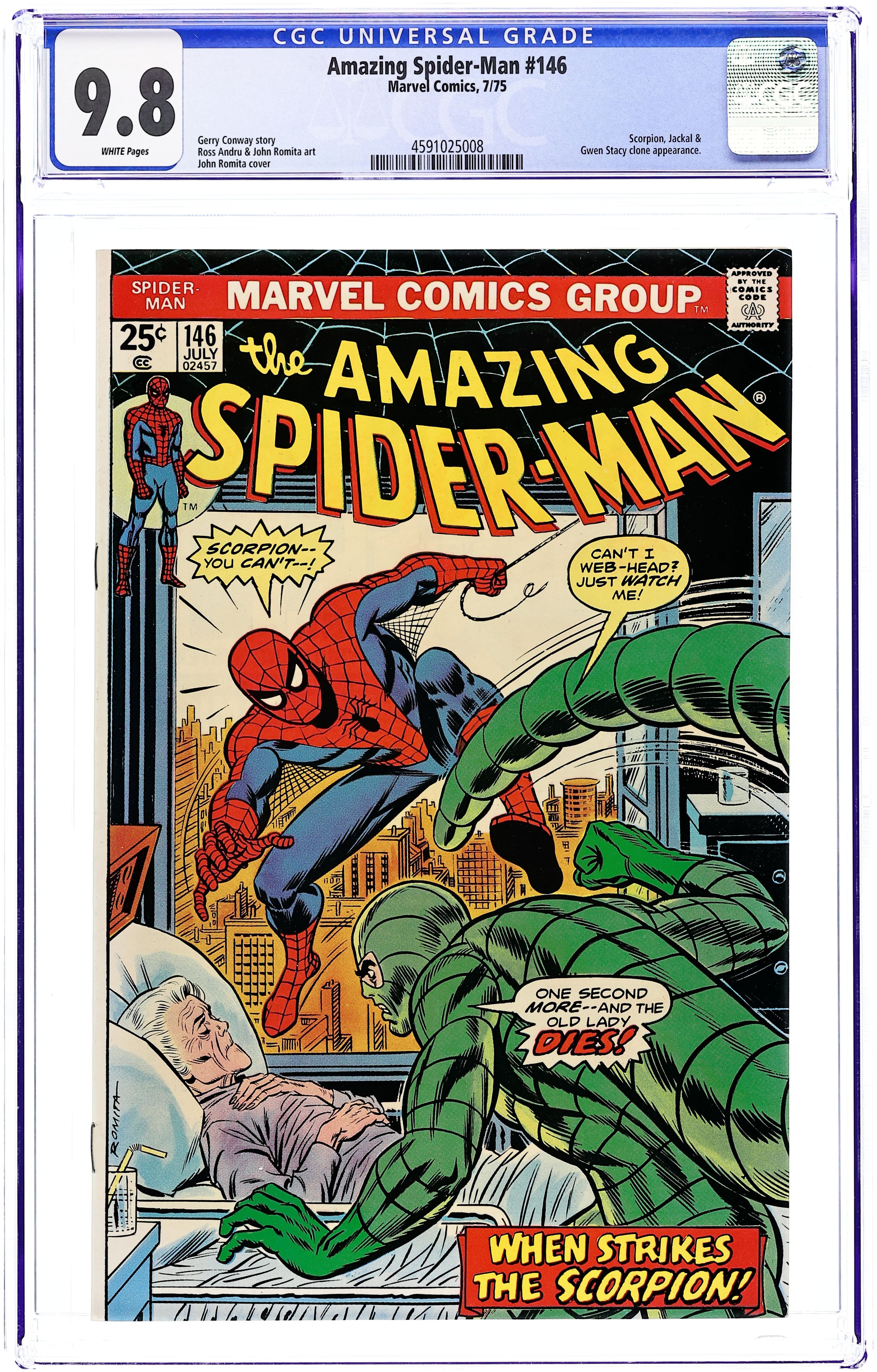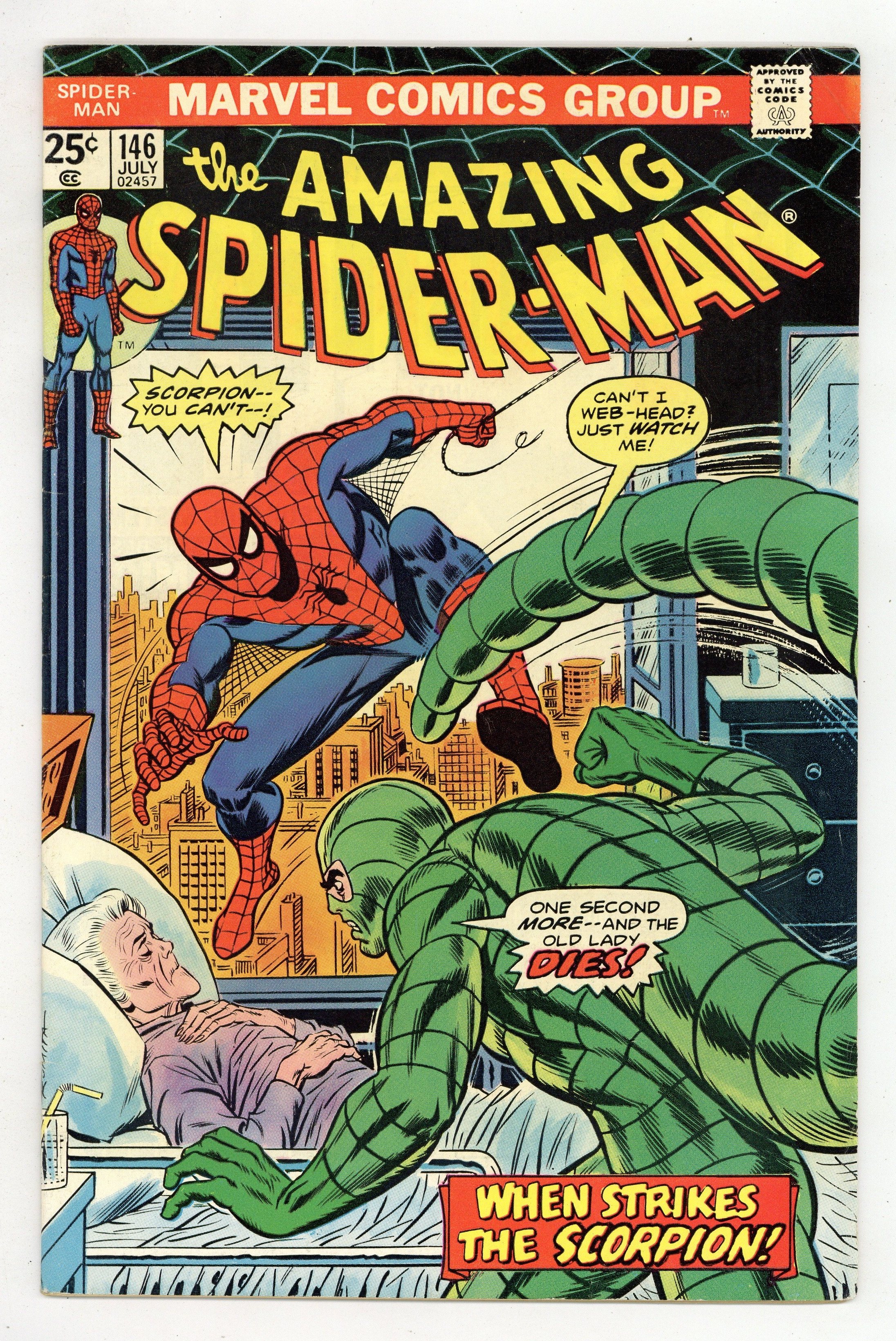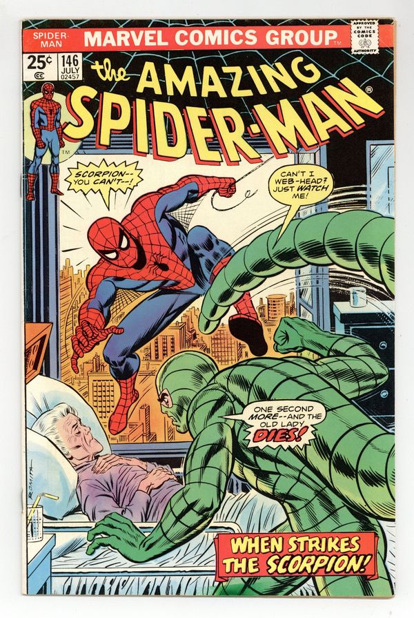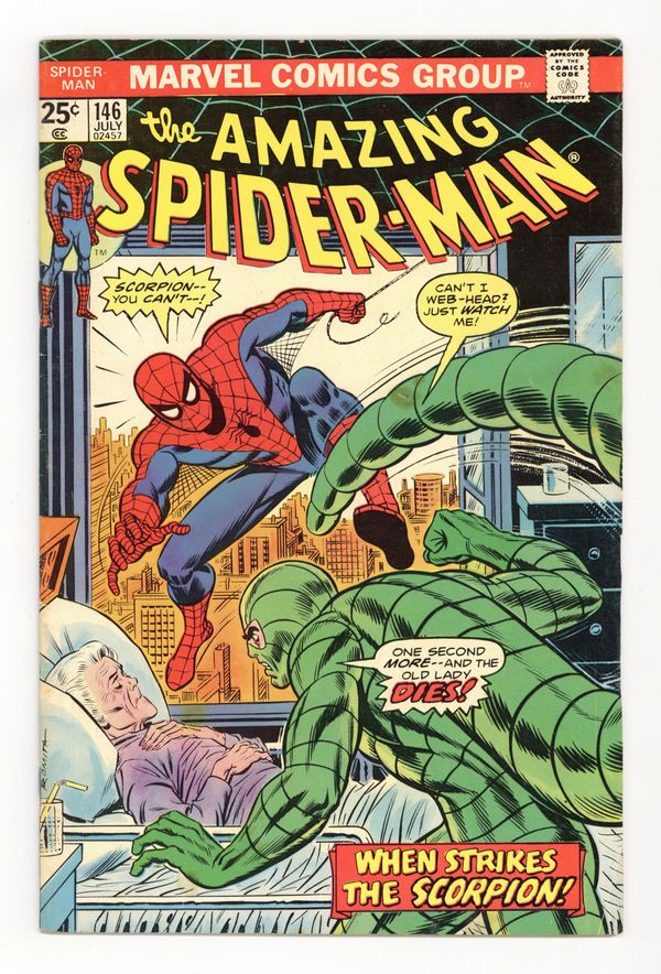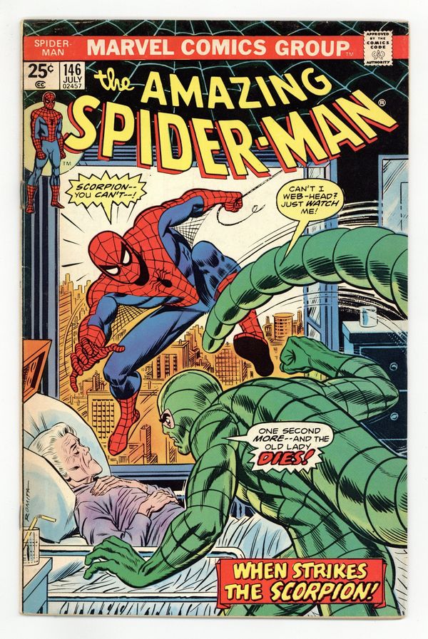 Tags: Marvel Legacy Numbering: Amazing Spider-Man (part 146), Spider-Man Clone Saga (part 00F)$17.50"Scorpion...Where is thy Sting?" Part 2 of 2. Script by Gerry Conway. Pencils by Ross Andru. Inks by John Romita Sr., John Romita, Jr., Mike Esposito, Frank Giacoia, and John Tartaglione. Cover by John Romita Sr. While Aunt May's nephew comes to grips with the return of Gwen Stacy (clone), the devious Jackal once more plots the wall-crawler's violent demise! And this time he uses the unsuspecting Scorpion as his pawn! The Scorpion thought he killed Spidey last issue, but once Mac Gargan learns the truth; he wants another shot! So the Jackal tells him to look in May Parker's hospital room! What a cruel thing to do! And as depicted on the dynamic cover, the Scorpion indeed pays Aunt May a visit! But the super-villain with a sting wasn't counting on a fighting mad web-slinger in the waiting room! The beleaguered Scorpion doesn't stand a chance! Elements of the story continue in Giant-Size Spider-Man 5. (Note: The Scorpion returns in Ms. Marvel (1977 1st series #1. The letters page includes Marvel Value Stamp series A #67 Cyclops by George Tuska. This story was reprinted in Marvel Tales 123.) 36 pages. 25c cover price. Cover price $0.25.