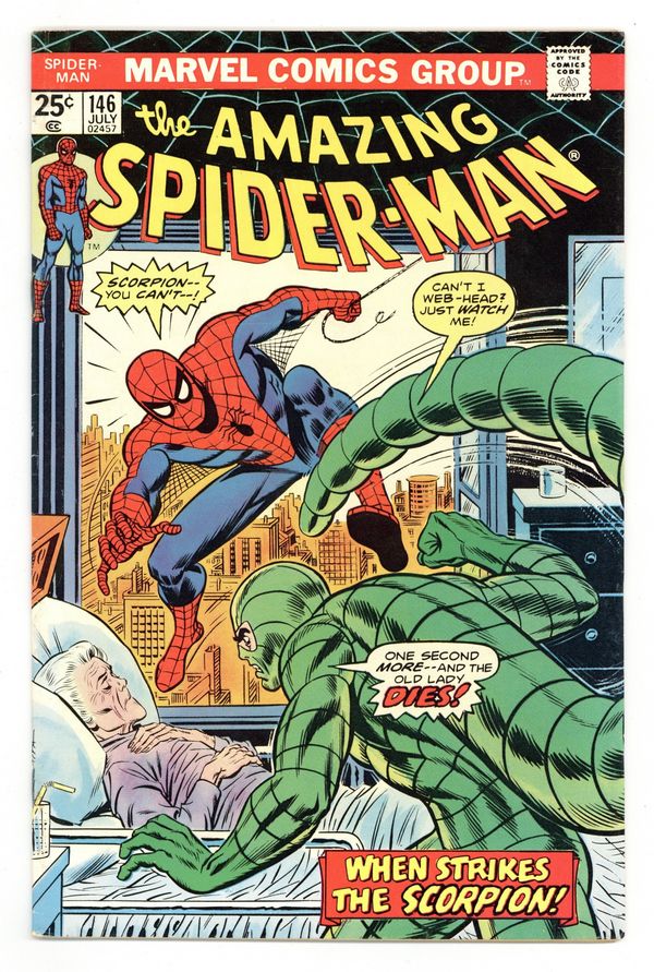 Tags: Marvel Legacy Numbering: Amazing Spider-Man (part 146), Spider-Man Clone Saga (part 00F)$29.50"Scorpion...Where is thy Sting?" Part 2 of 2. Script by Gerry Conway. Pencils by Ross Andru. Inks by John Romita Sr., John Romita, Jr., Mike Esposito, Frank Giacoia, and John Tartaglione. Cover by John Romita Sr. While Aunt May's nephew comes to grips with the return of Gwen Stacy (clone), the devious Jackal once more plots the wall-crawler's violent demise! And this time he uses the unsuspecting Scorpion as his pawn! The Scorpion thought he killed Spidey last issue, but once Mac Gargan learns the truth; he wants another shot! So the Jackal tells him to look in May Parker's hospital room! What a cruel thing to do! And as depicted on the dynamic cover, the Scorpion indeed pays Aunt May a visit! But the super-villain with a sting wasn't counting on a fighting mad web-slinger in the waiting room! The beleaguered Scorpion doesn't stand a chance! Elements of the story continue in Giant-Size Spider-Man 5. (Note: The Scorpion returns in Ms. Marvel (1977 1st series #1. The letters page includes Marvel Value Stamp series A #67 Cyclops by George Tuska. This story was reprinted in Marvel Tales 123.) 36 pages. 25c cover price. Cover price $0.25.