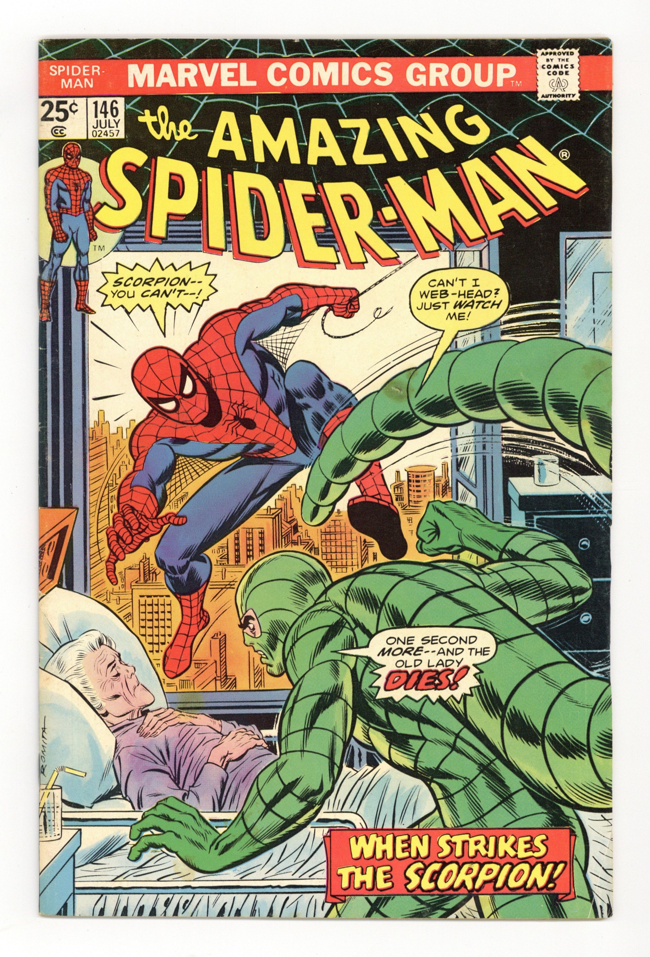 "Scorpion...Where is thy Sting?" Part 2 of 2. Script by Gerry Conway. Pencils by Ross Andru. Inks by John Romita Sr., John Romita, Jr., Mike Esposito, Frank Giacoia, and John Tartaglione. Cover by John Romita Sr. While Aunt May's nephew comes to grips with the return of Gwen Stacy (clone), the devious Jackal once more plots the wall-crawler's violent demise! And this time he uses the unsuspecting Scorpion as his pawn! The Scorpion thought he killed Spidey last issue, but once Mac Gargan learns the truth; he wants another shot! So the Jackal tells him to look in May Parker's hospital room! What a cruel thing to do! And as depicted on the dynamic cover, the Scorpion indeed pays Aunt May a visit! But the super-villain with a sting wasn't counting on a fighting mad web-slinger in the waiting room! The beleaguered Scorpion doesn't stand a chance! Elements of the story continue in Giant-Size Spider-Man 5. (Note: The Scorpion returns in Ms. Marvel (1977 1st series #1. The letters page includes Marvel Value Stamp series A #67 Cyclops by George Tuska. This story was reprinted in Marvel Tales 123.) 36 pages. 25c cover price. Cover price $0.25.